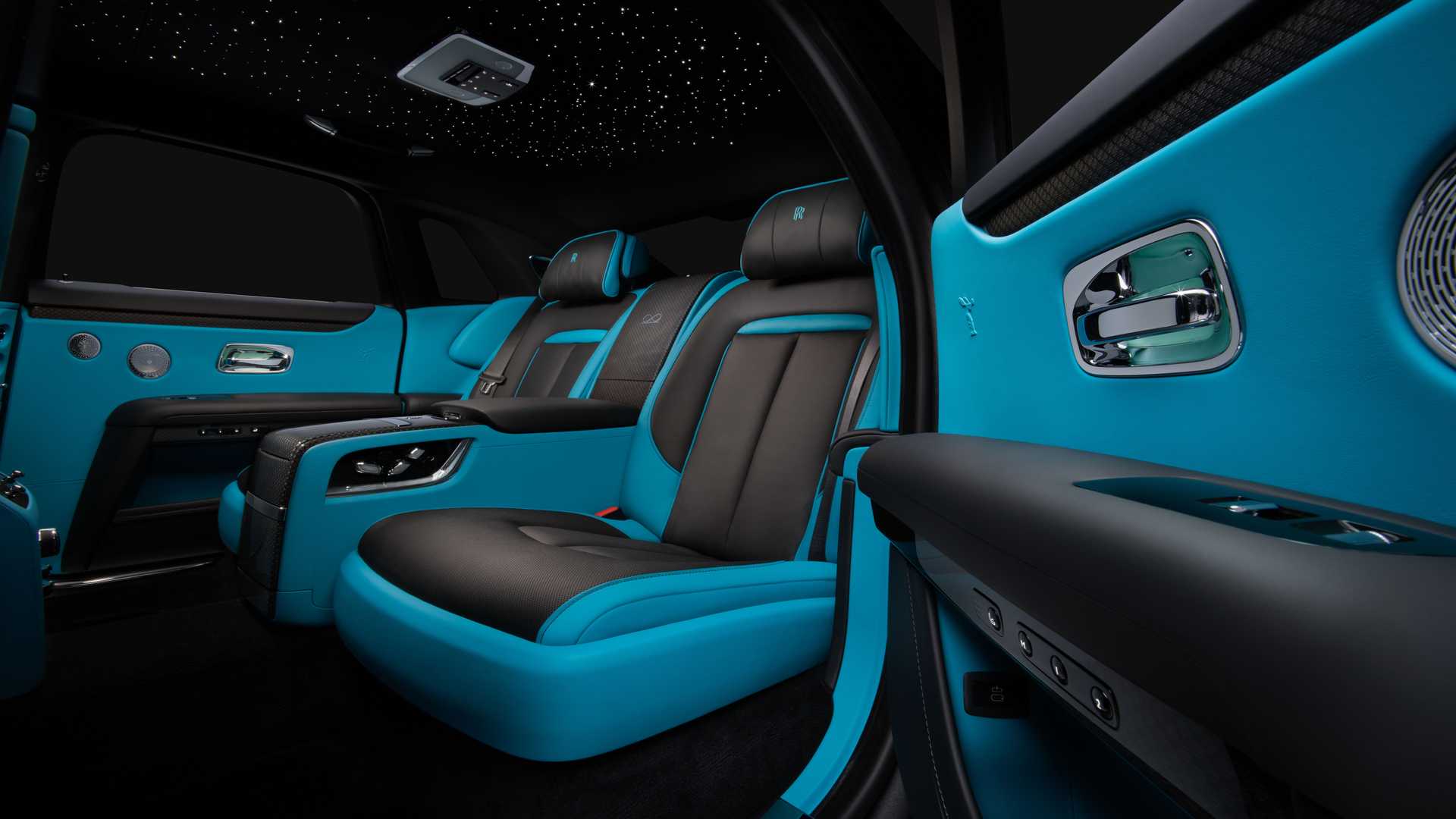 뉴 고스트 블랙 배지의 실내 역시 본질에 집중한 소재들을 통해 포스트 오퓰런스 철학의 미니멀리즘을 표현하면서도 선명하게 눈에 들어오는 터키석 색상 가죽으로 마감해 특별한 분위기를 전달한다.