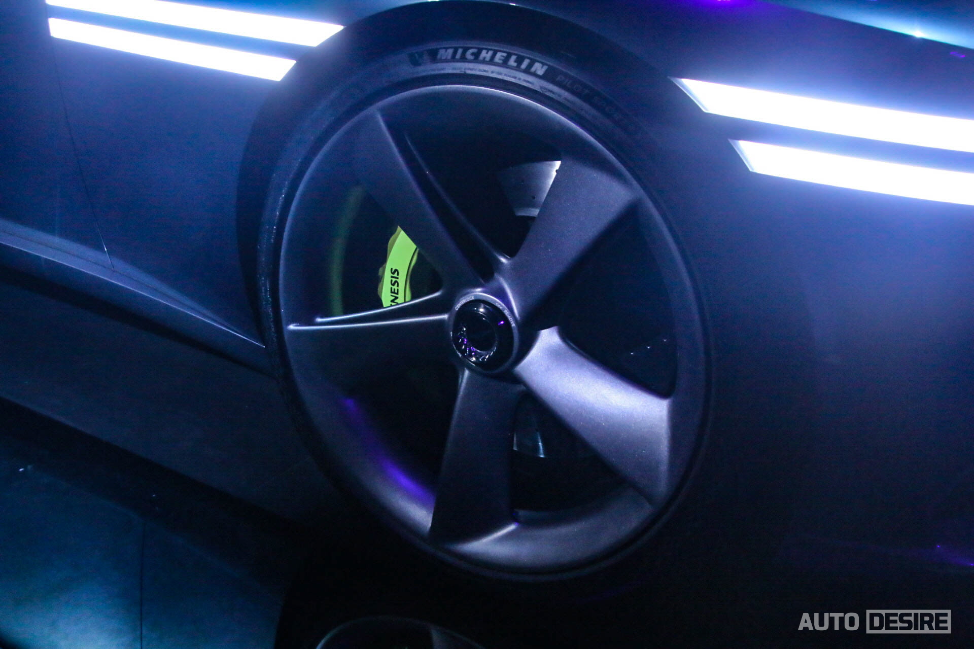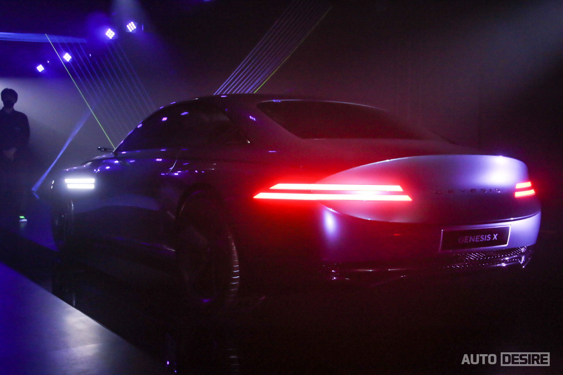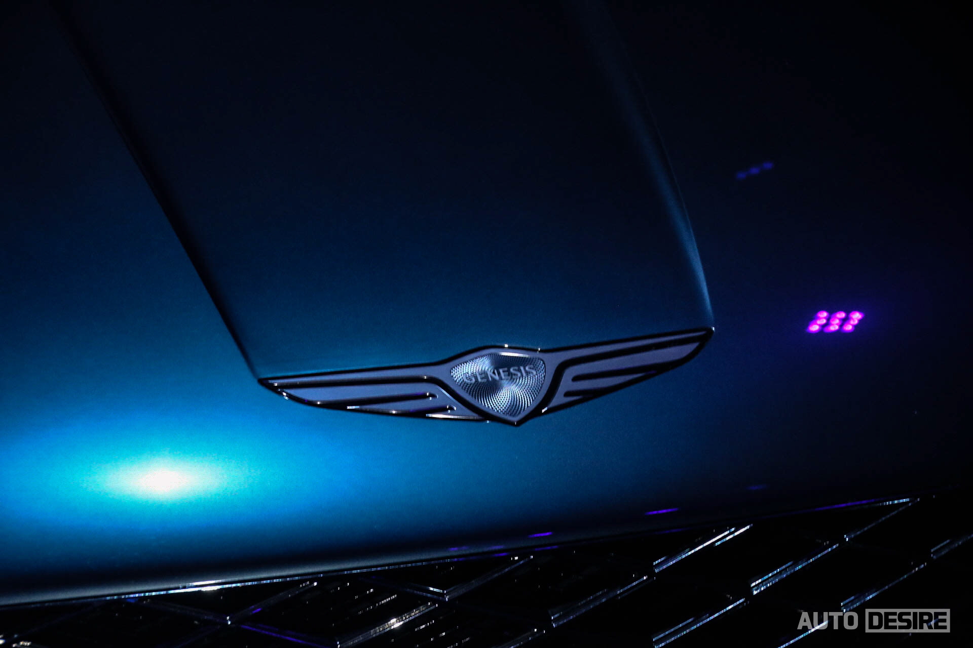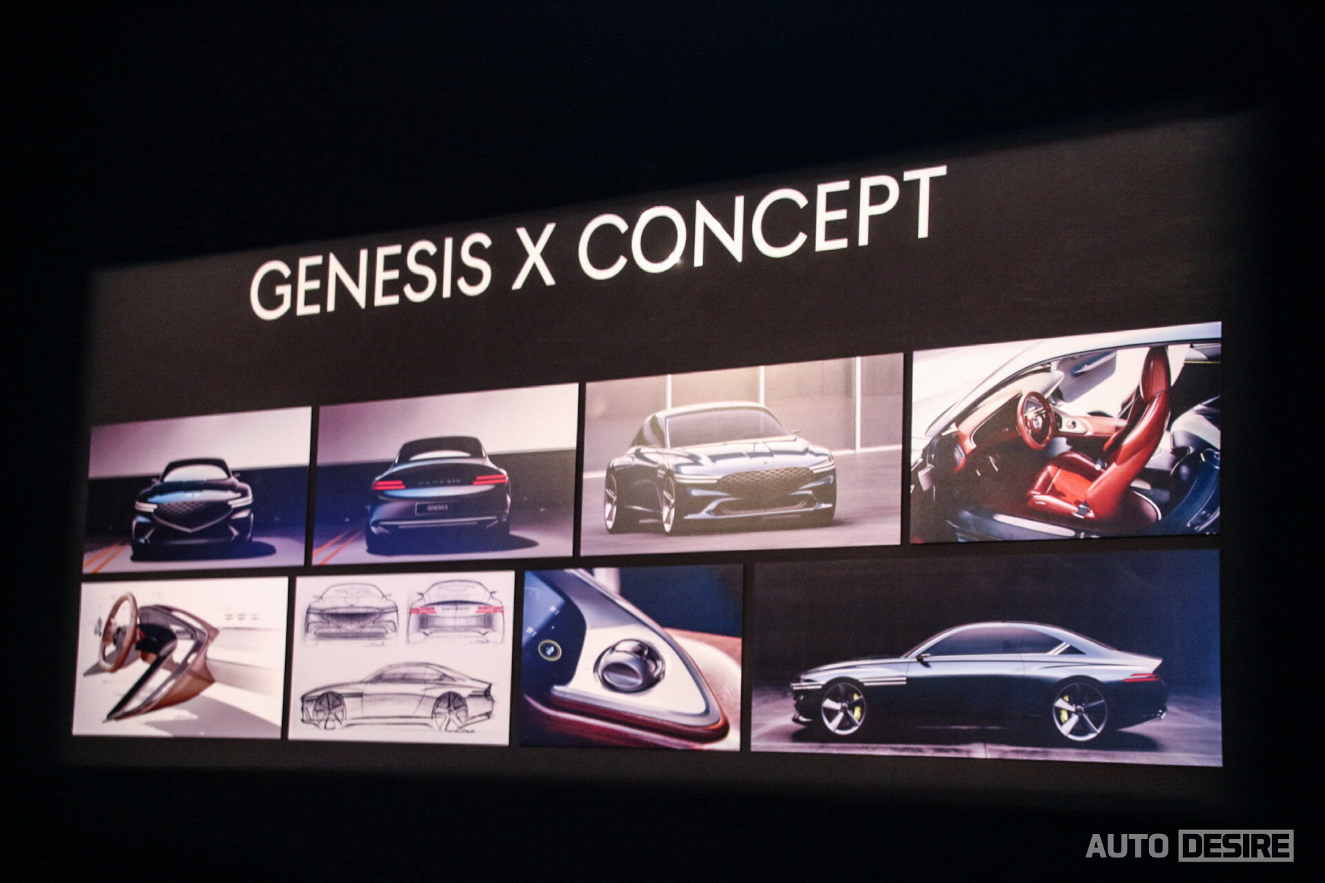 어두운 환경이기는 했지만, 제네시스 엑스(Genesis X)가 가진 와이드하고 낮은 자세, 길게 쭉 뻗은 측면 라인은 고급스럽고 우아한 이미지를 제대로 느낄 수 있었고, 제네시스가 가진 고유의 아이덴티티인 커다란 크레스트 그릴과 쿼드 램프 - Two line은 그 디테일과 존재감을 더 강조하면서 섬세한 기요셰 패턴과 함께 더 슬림해진 제네시스의 신규 엠블럼(양산형 차량에는 GV60부터 적용)을 적용하는 등 기존 차량들과는 새로운 모습을 보여주고 있다. 깔끔하게 일체감을 주는 클램쉘 후드가 적용된 것도 특징.