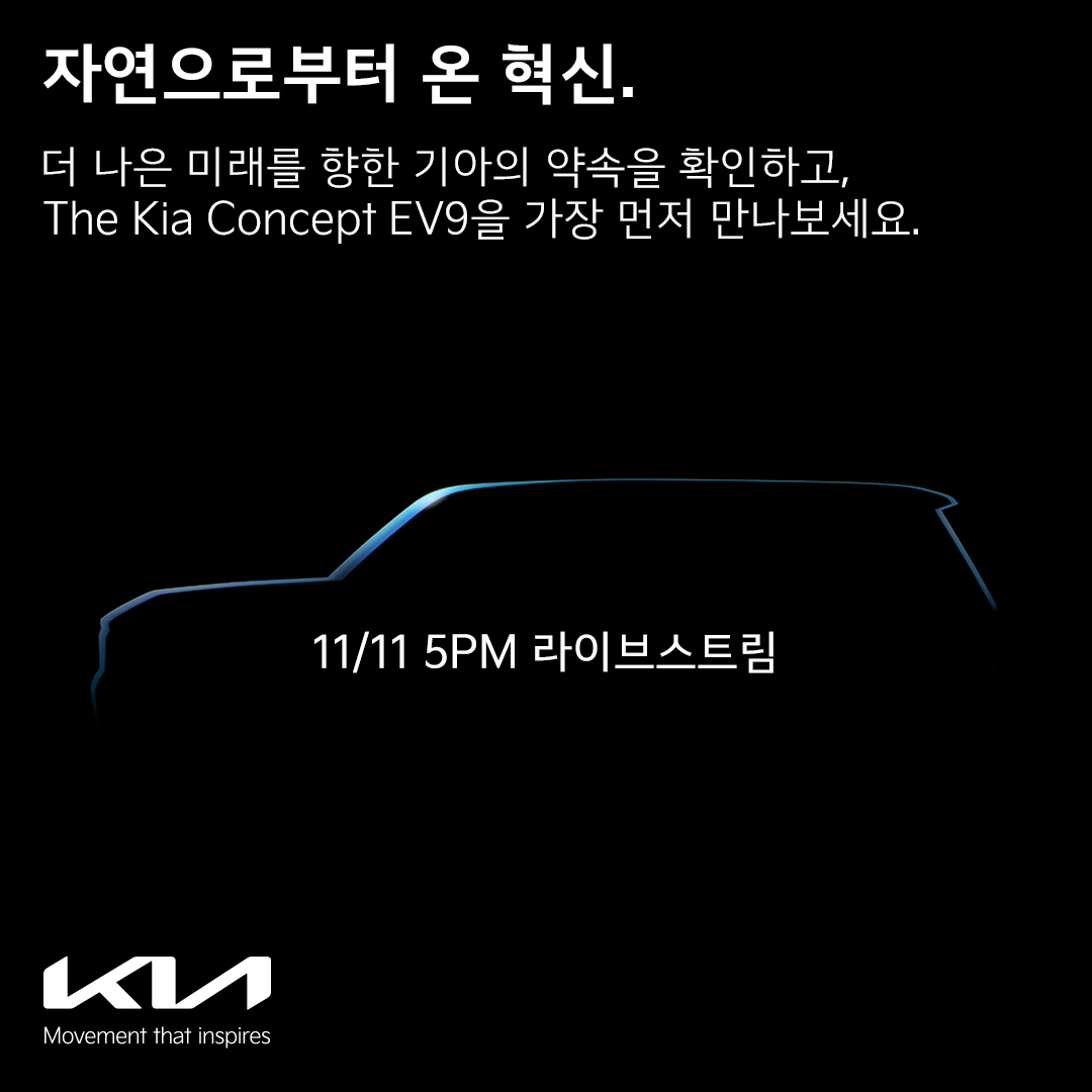 기아에서 티저 이미지를 통해 오는 11월 11일, 기아의 새로운 전용 전기차 SUV 콘셉트 모델인 'The Kia Concept EV9'을 온라인 라이브스트림을 통해 공개할 것이라고 밝혔다. 공개 날짜 및 시간 외에 별다른 정보를 더 밝히지는 않았지만, 'EV9'이라는 모델명에서 기아의 전용 전기차 라인업 중 최상위급, 플래그십을 담당할 모델이라는 걸 알 수 있고, 티저 이미지 실루엣을 통해 대형 SUV일 것으로 보인다. 기아 EV9 콘셉트 모델 공개 일정은 현대 아이오닉 세븐 콘셉트카의 공개 일정과도 서로 영향이 있었을 것으로 예상된다.