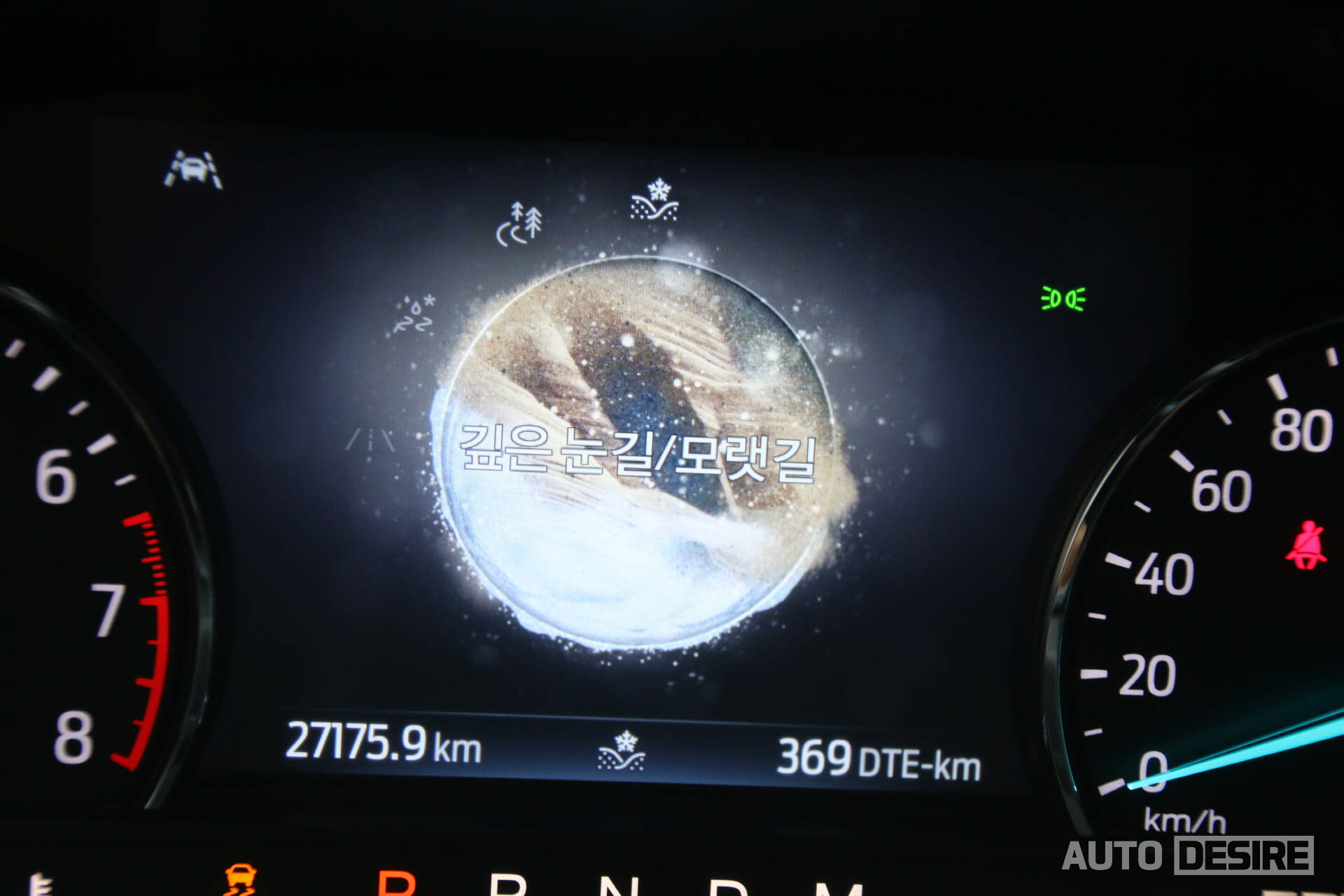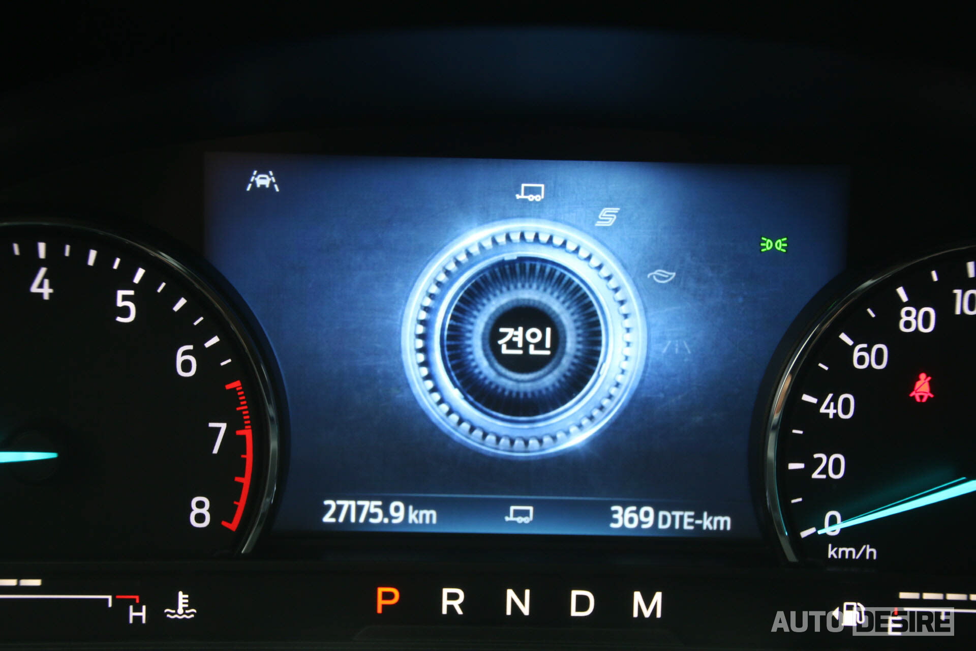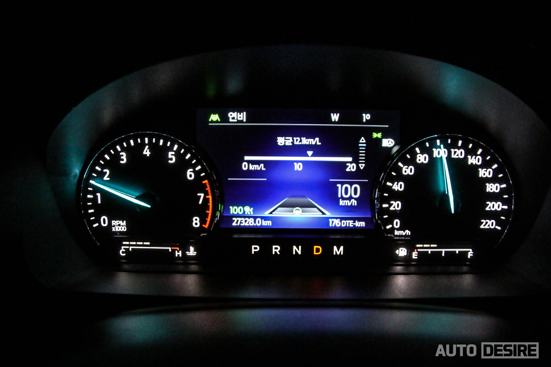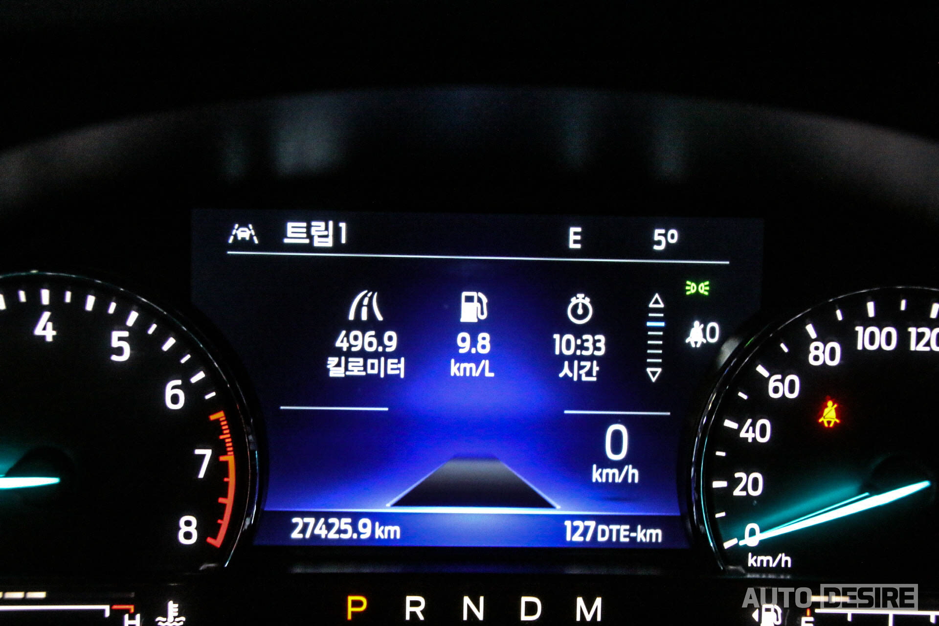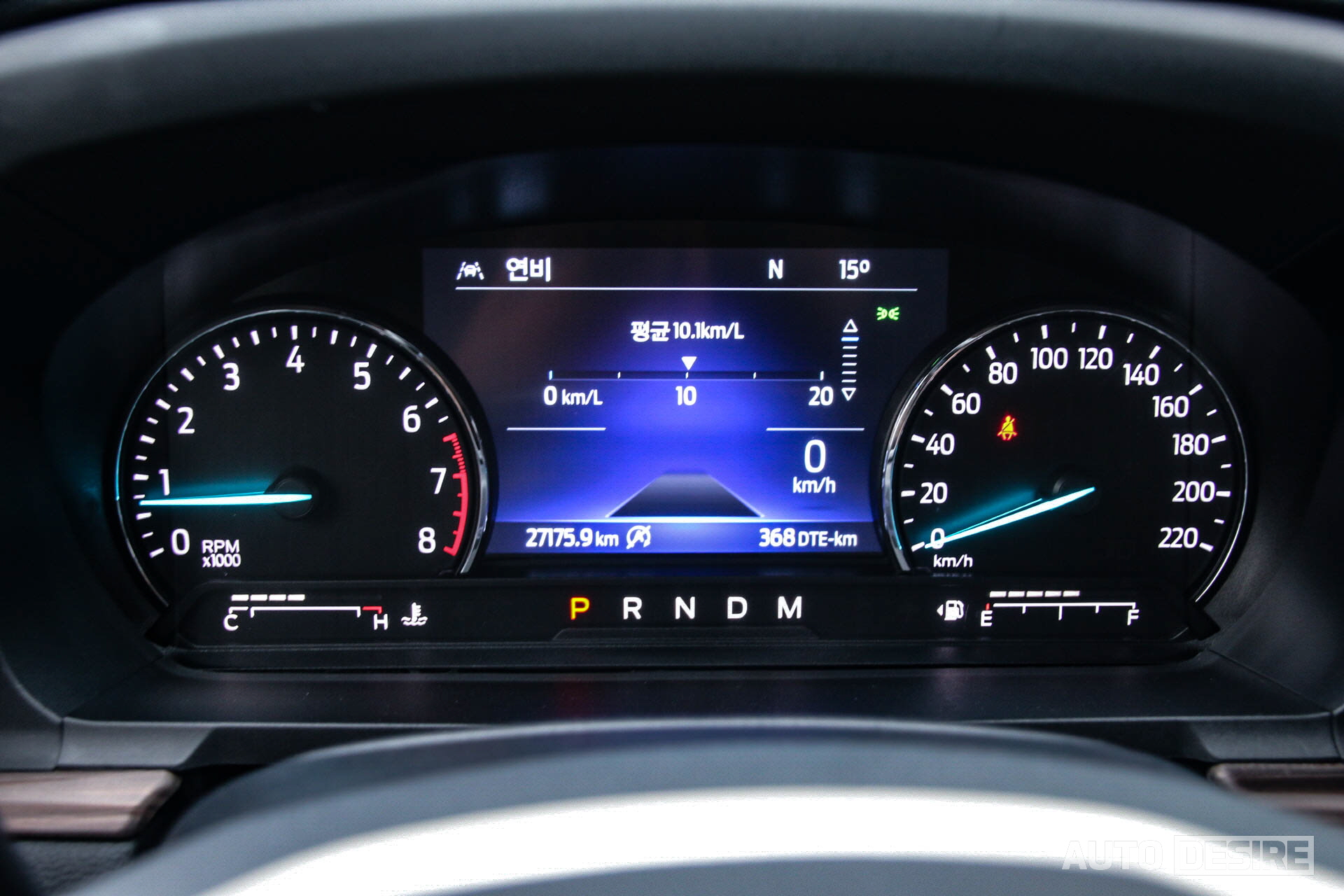 계기판은 풀 디지털 타입은 아니지만 심플한 듀얼 클러스터에 6.5인치 컬러 LCD 창으로 주행 관련 및 기타 필요한 정보들을 표시해 주며, 한글화도 문제없이 지원한다. 시인성도 준수한 편이며, 포드 차량답게 LCD 창 배경 컬러가 파란색인 것이 특징. 다만 속도계와 타코미터의 바늘 색상은 흰색이나 빨간색으로 하는 편이 더 세련되고 깔끔해 보일 것 같다.