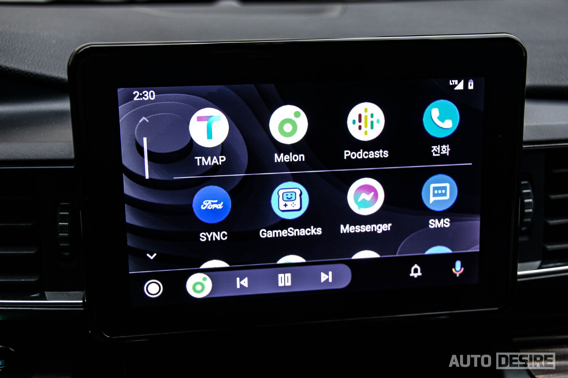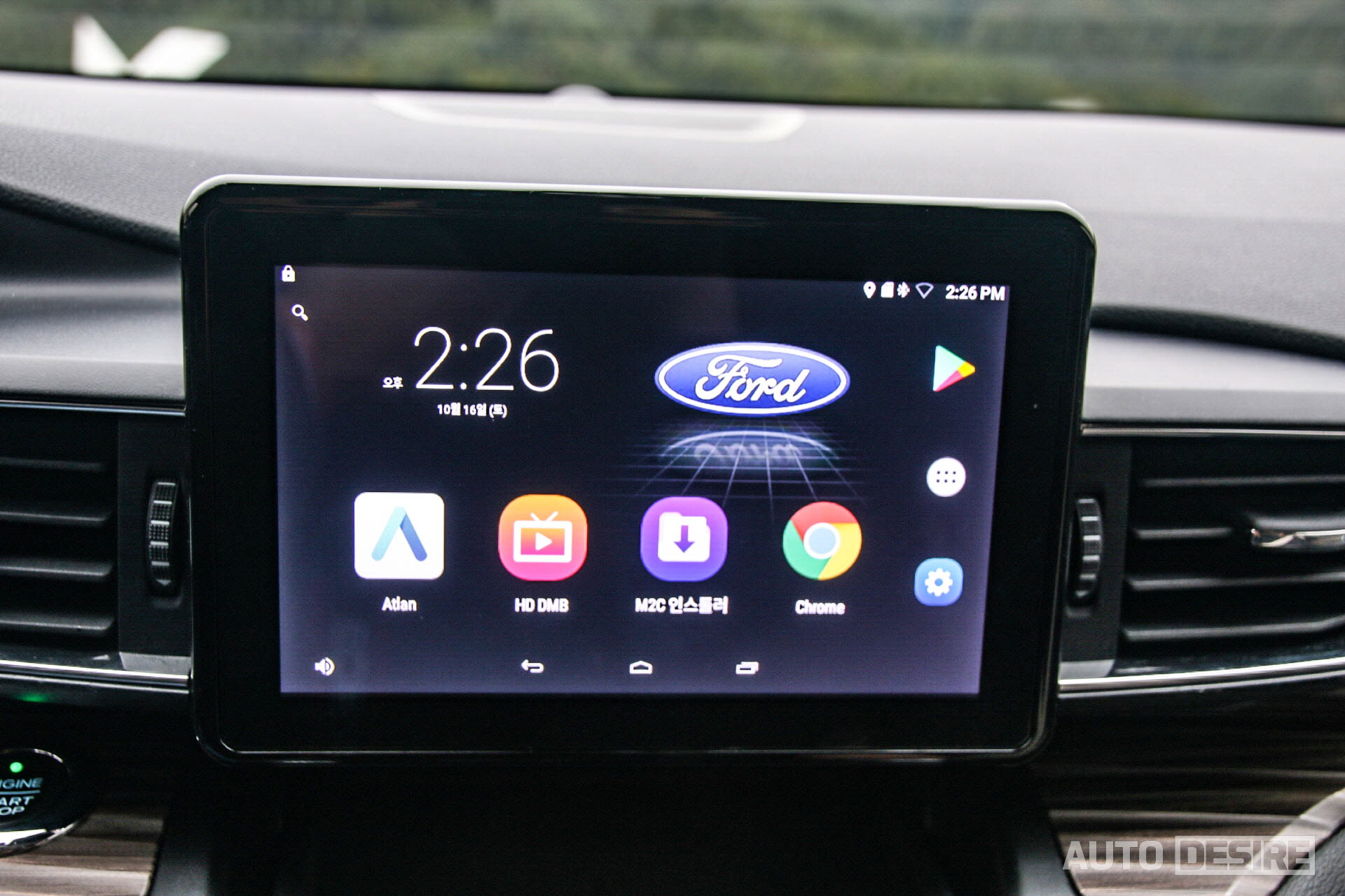 센터패시아 상단에는 플로팅 타입으로 8인치 디스플레이와 함께 SYNC3 인포테인먼트 시스템이 탑재되어 있다. 해외 사양에는 10.1인치까지 적용되는 것을 생각하면 사이즈 측면에서는 아쉬움이 남기는 하지만 국내 고객 편의를 위해 안드로이드 기반 인터페이스와 함께 아틀란 내비게이션이 함께 적용되어 있고, 애플 카플레이와 안드로이드 오토를 지원해 티맵, 카카오 내비 등 모바일 내비게이션과 함께 멜론, 구글 어시스턴트 등 기타 앱도 편하게 사용할 수 있어 편의적 측면에서는 큰 불편함은 남지 않는다. 뱅앤올룹슨 사운드 시스템도 만족스러운 음질을 전한다.