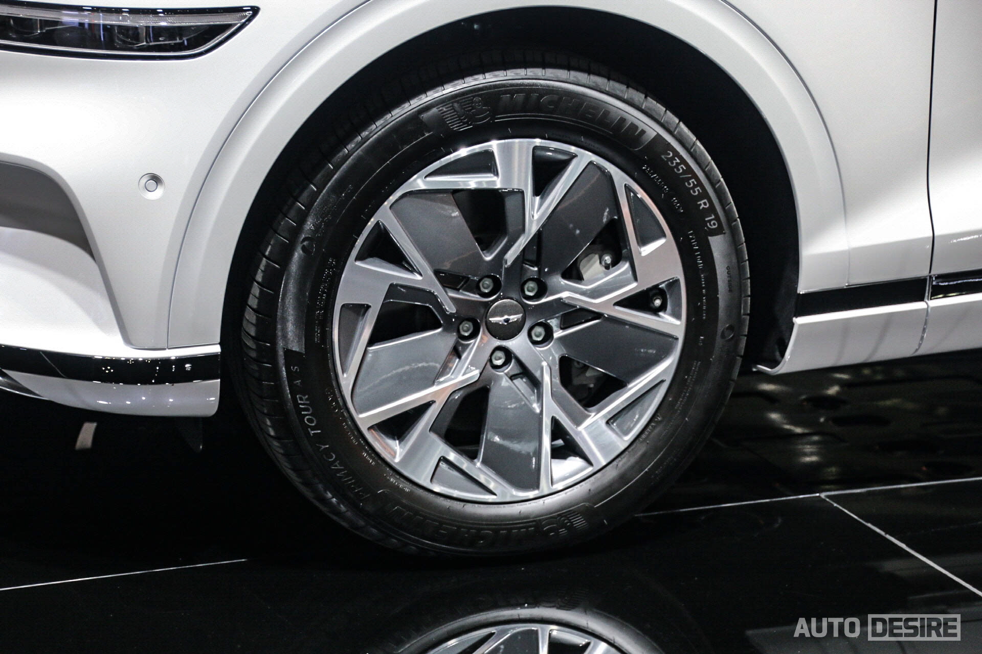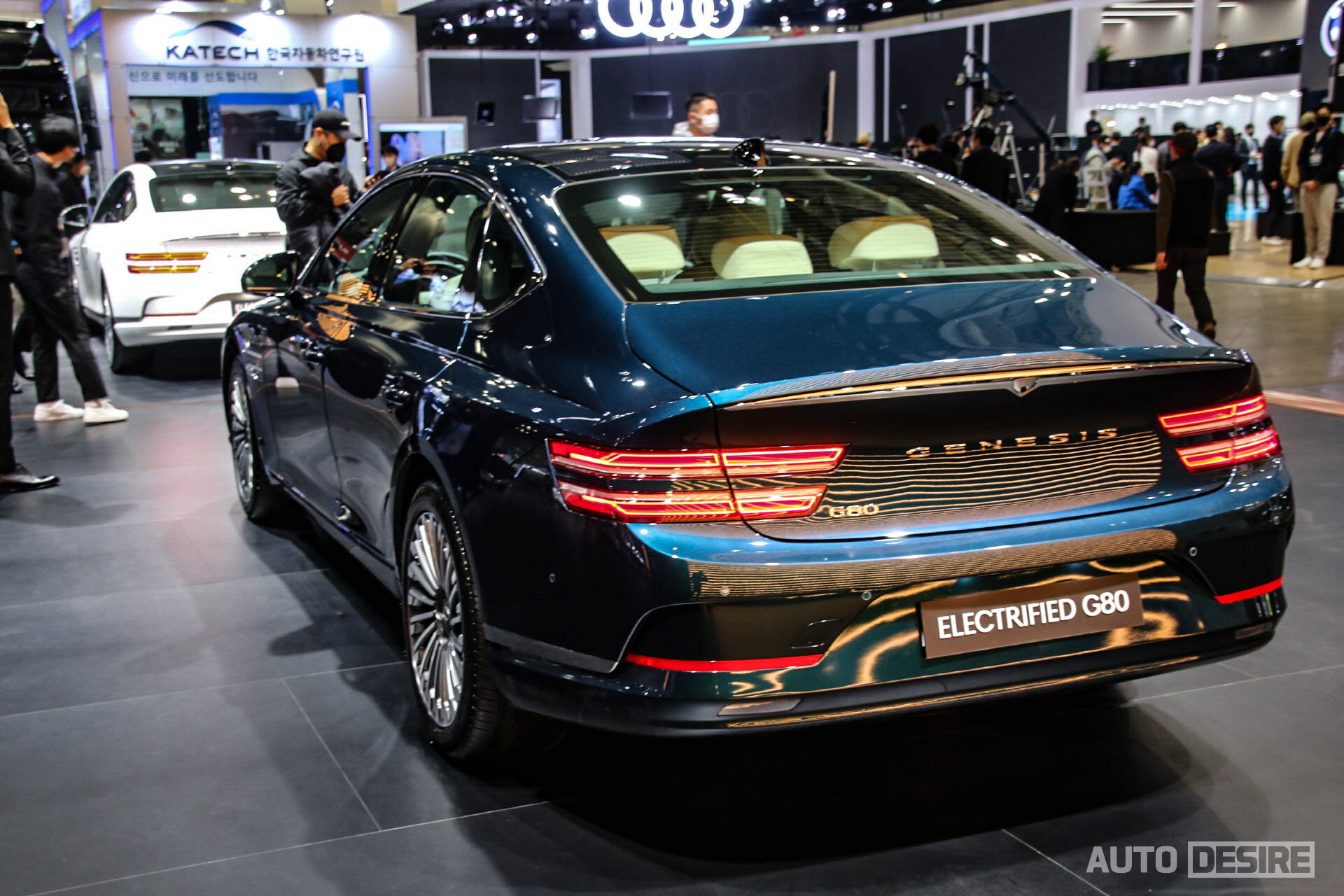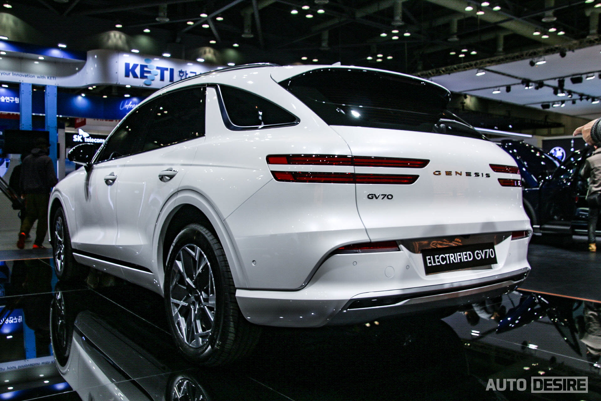 측면부는 휠을 제외하면 기존 GV70과 거의 동일하며, 후면에서도 전동화 모델임을 나타내는 별도 엠블럼은 존재하지 않고 대신 범퍼의 머플러 팁을 숨기고 간결하게 정리된 스키드 플레이트 형상으로 전동화 모델만의 인상을 담아냈다. 전시차의 실내는 열어볼 수 없었고, 틴팅이 진하게 된 상태였는데 지난주 공개된 이미지대로 실내도 기존 GV70의 구성을 따르면서 스티어링 휠에 부스트 모드 버튼이 추가되고, 친환경, 재활용 소재가 실내에 활용된다.