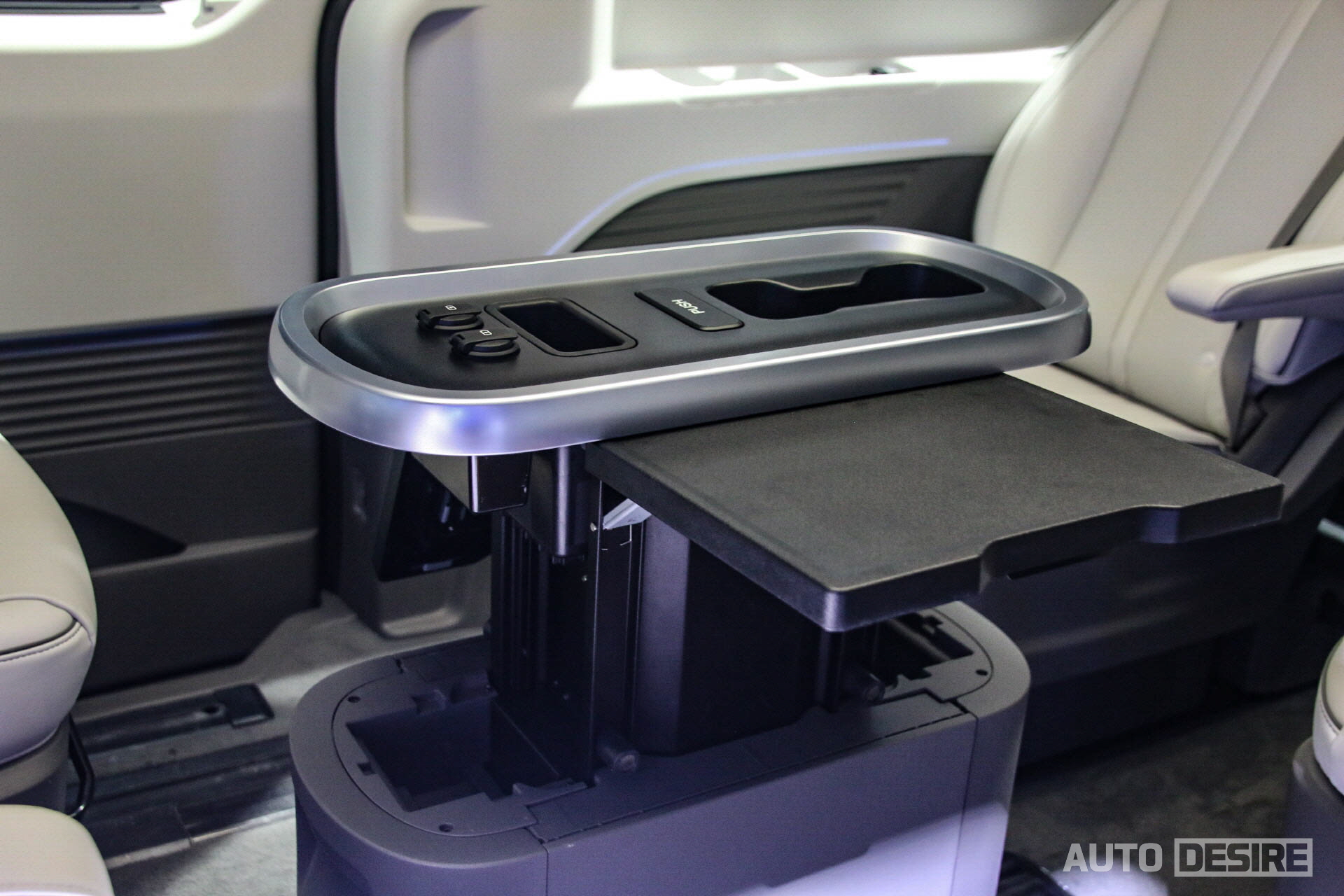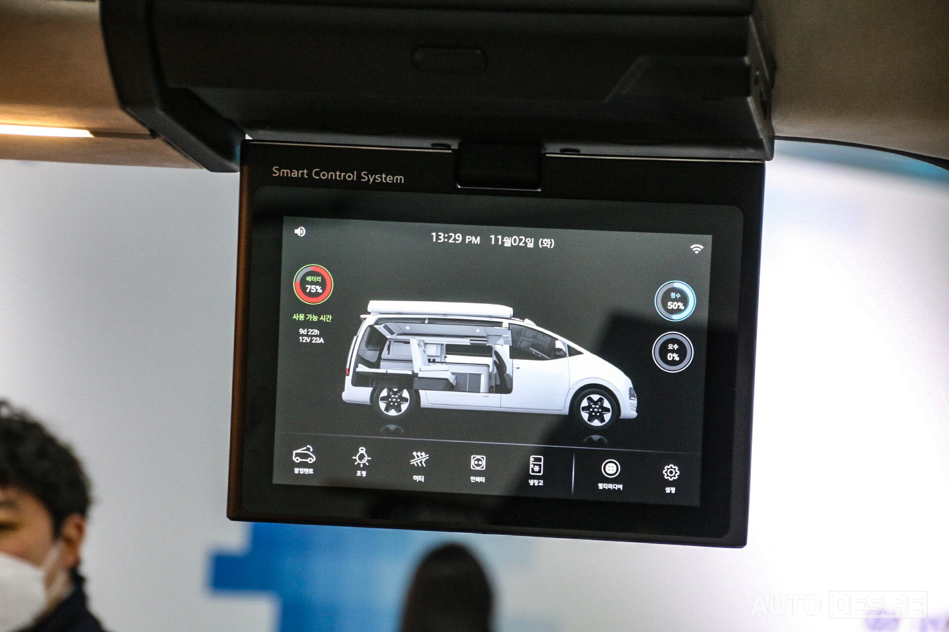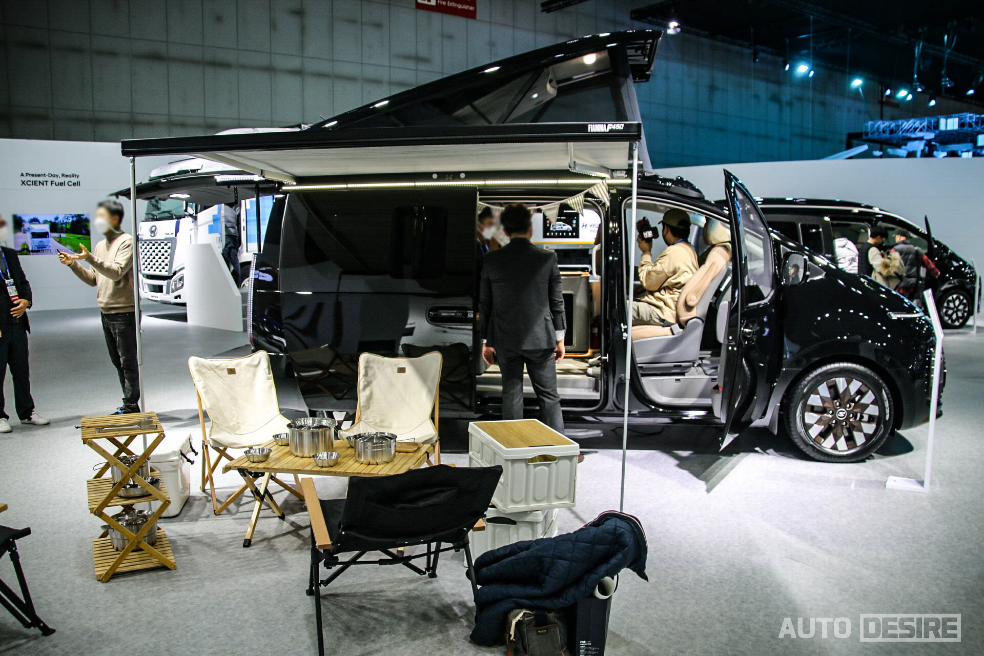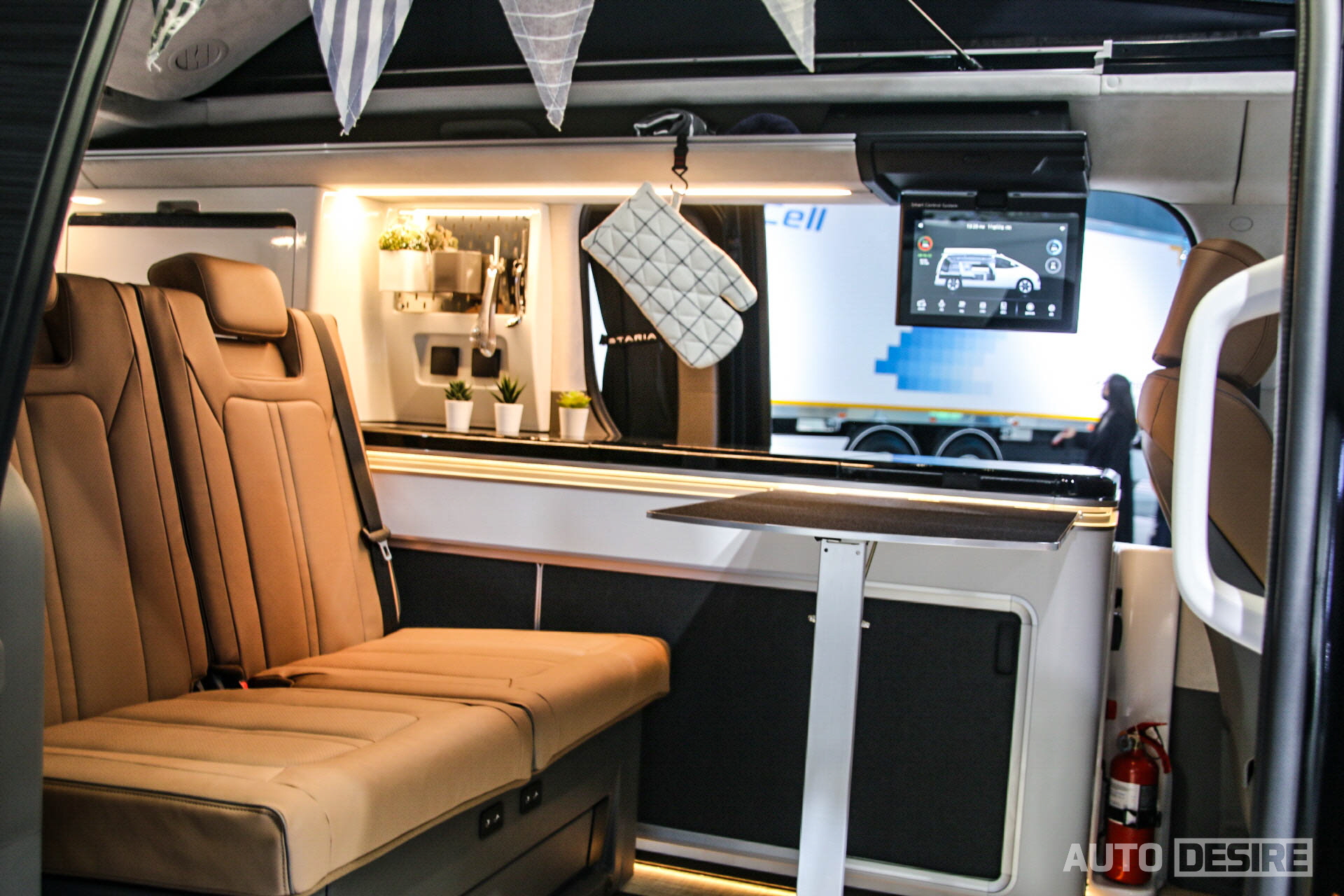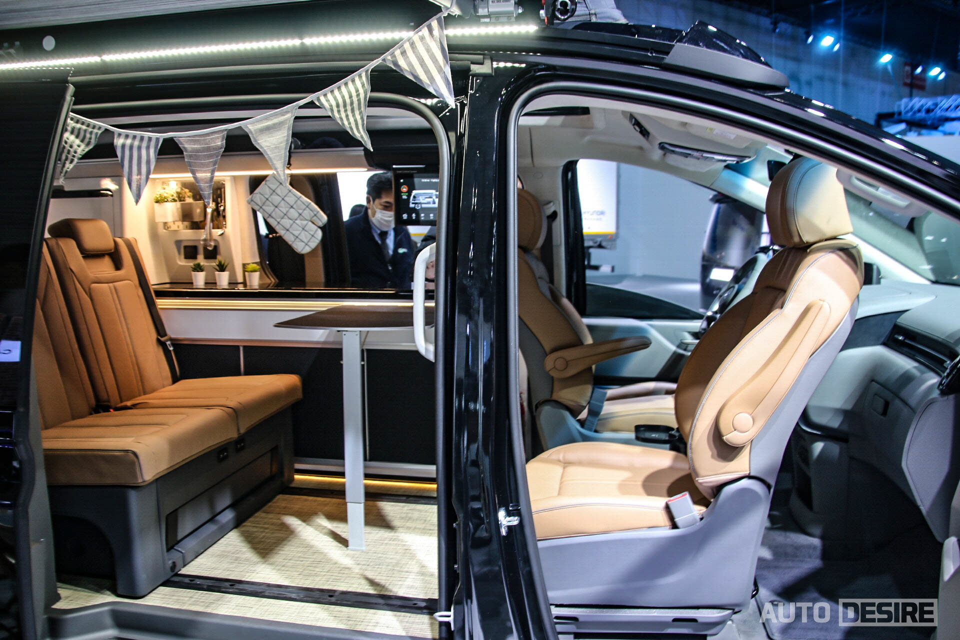캠핑 사이트 내 자리를 잡은 이후에는 이동 공간이 아닌 이용객들이 서로 마주 보고 대화를 하는 등 거주 공간으로 활용할 수 있도록 조수석 시트가 180도 회전할 수 있게 되어있고, 운전석 뒤 공간으로 접이식 테이블과 수전을 포함한 조리대, 하단에 수납공간과 냉장고 등을 포함한 것으로 보인다. 벤치 타입으로 적용한 2열 시트는 사이트에서 침대로 활용할 수 있게 평평한 모습. 팝업텐트 확장과 함께 실내조명, 히터, 인버터, 냉장고와 멀티미디어, 기타 설정 조작과 배터리 잔량, 청수 잔량, 오수 상태는 운전석 뒤편의 터치 모니터를 통해 확인 및 조작이 가능하게 되어있다.