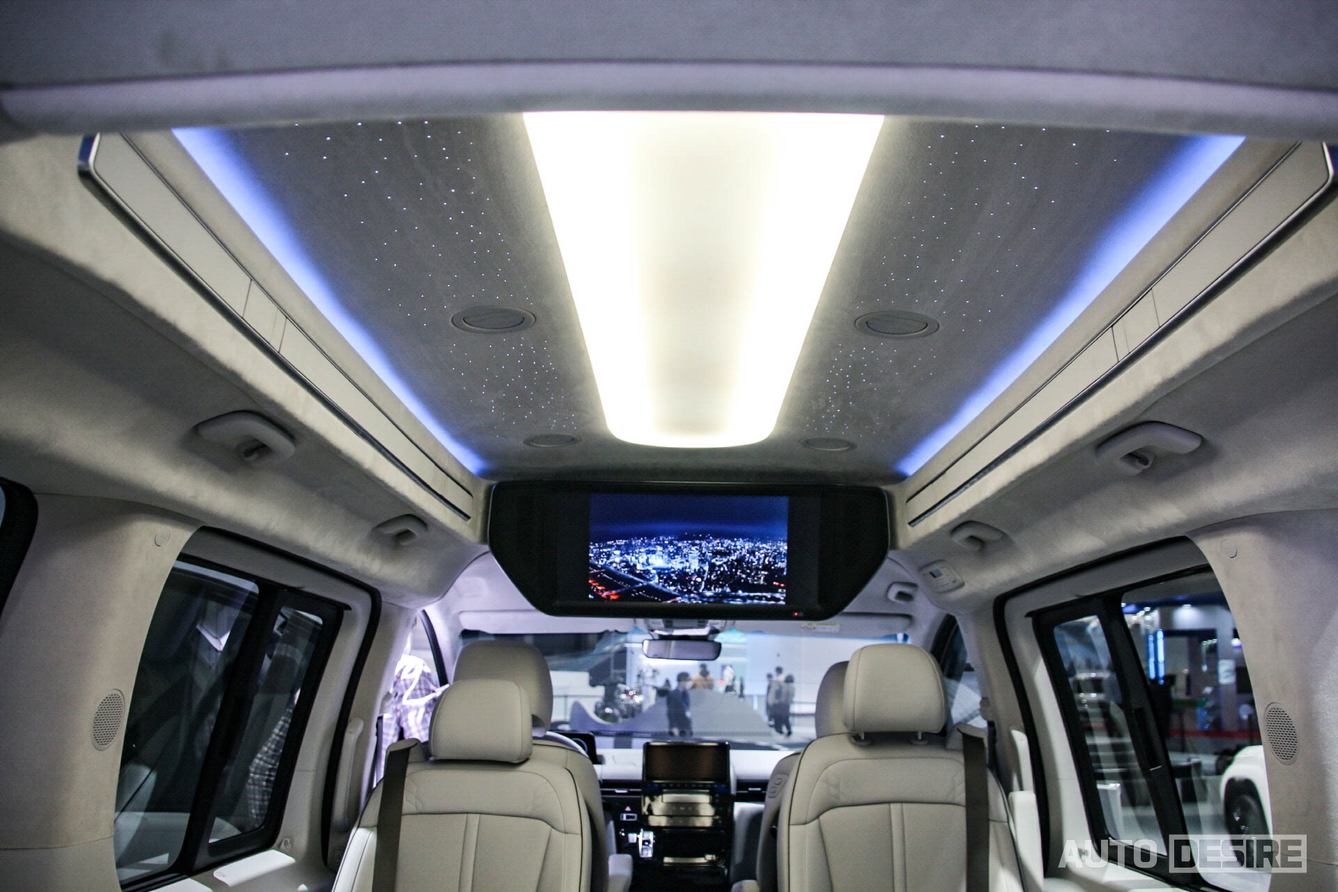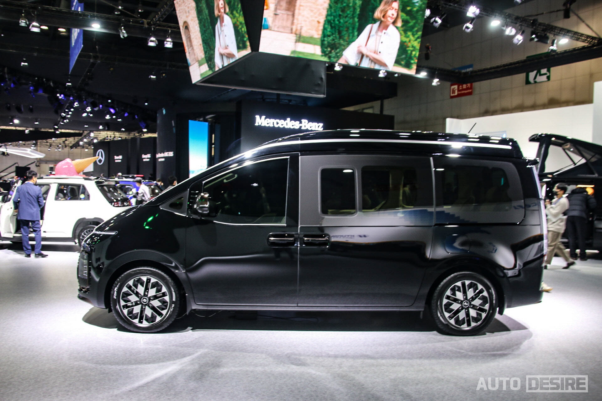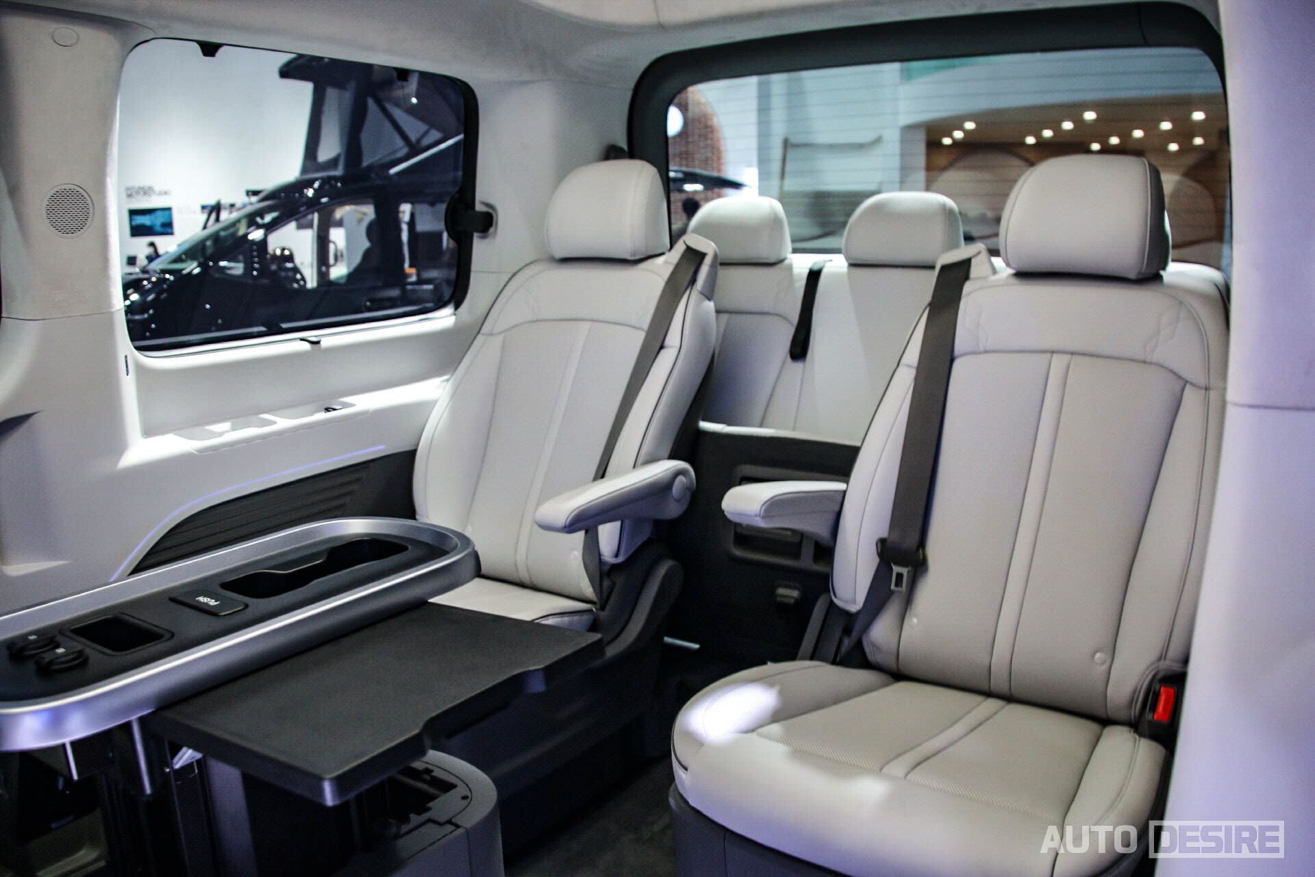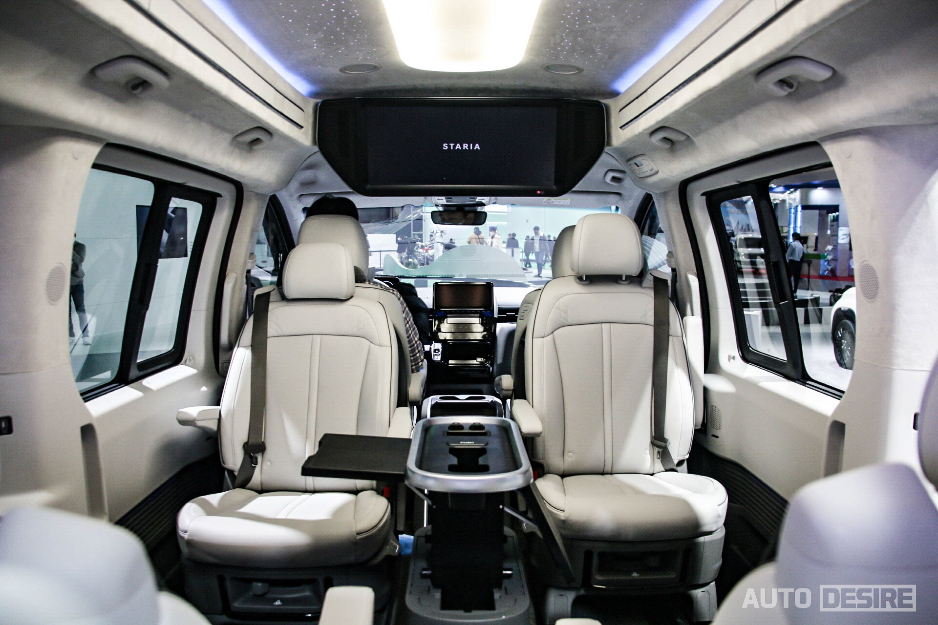 이번 모빌리티쇼에 전시된 스타리아 라운지 리무진은 9인승 모델로 2-2-2-3의 시트 배열이 적용되어 있는 모습. 전후 회전이 가능한 2열 독립 시트에 승객 편의를 위한 암레스트와 열선/통풍 시트 등이 적용되었고 7인승 모델의 경우에는 스타리아 라운지 7인승 모델이 그렇듯 더 넓은 폭의 독립 시트에 릴렉션 기능 등이 적용될 것으로 보인다.