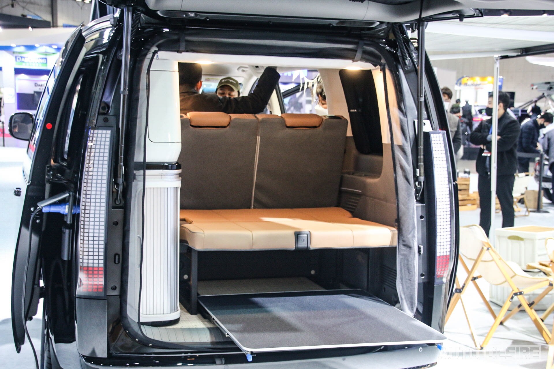 뒤쪽으로 돌아오면 차량 측면으로 전력 및 청수 공급을 위한 포트가 있고, 실내 내부에는 침대로 활용할 수 있는 바닥과 그 아래로 슬라이드로 확장해서 이용 가능한 테이블, 측면으로 수납공간 등이 마련되어 있다. 차량의 사이즈 및 샤워/화장실 시설 등이 없는 내부 특성상 장박 캠핑까지는 어렵겠지만, 단기간 캠핑을 하는 이들에게는 충분히 만족스러운 구성으로 보인다.