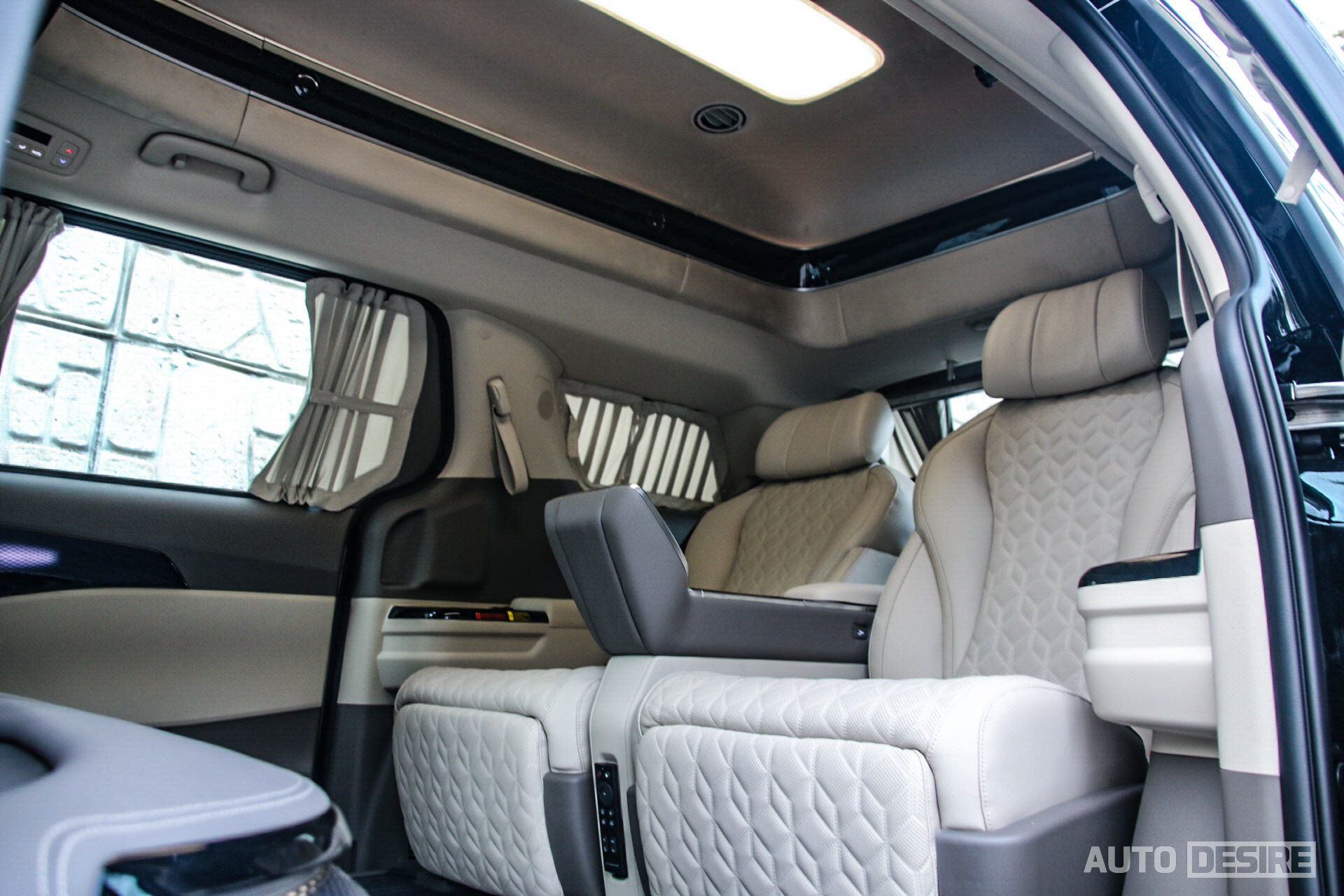 자 그러면, 본격적으로 기아 The 2022 카니발 하이리무진 4인승 모델만의 특별함을 만드는 2열 승객 공간을 살펴볼 차례. 가장 중요한 차이는 역시 시트 배열로 더 넓어진 폭의 2열 독립 시트에 3열을 없애면서 레그룸을 포함해 훨~씬 넓어진 공간이 되겠다. 특히 고급스러운 퀼팅 패턴을 더한 독립 시트는 7인승 모델과 달리 앞뒤 슬라이딩을 포함해 등받이 각도, 다리 지지대까지 모두 전동 조절이 가능하고 센터 콘솔의 7인치 터치 통합 컨트롤러에서 스마트 모니터와 실내조명, 공조장치를 포함한 각종 기능들을 멀리 손 뻗을 필요 없이 조작이 가능하다.