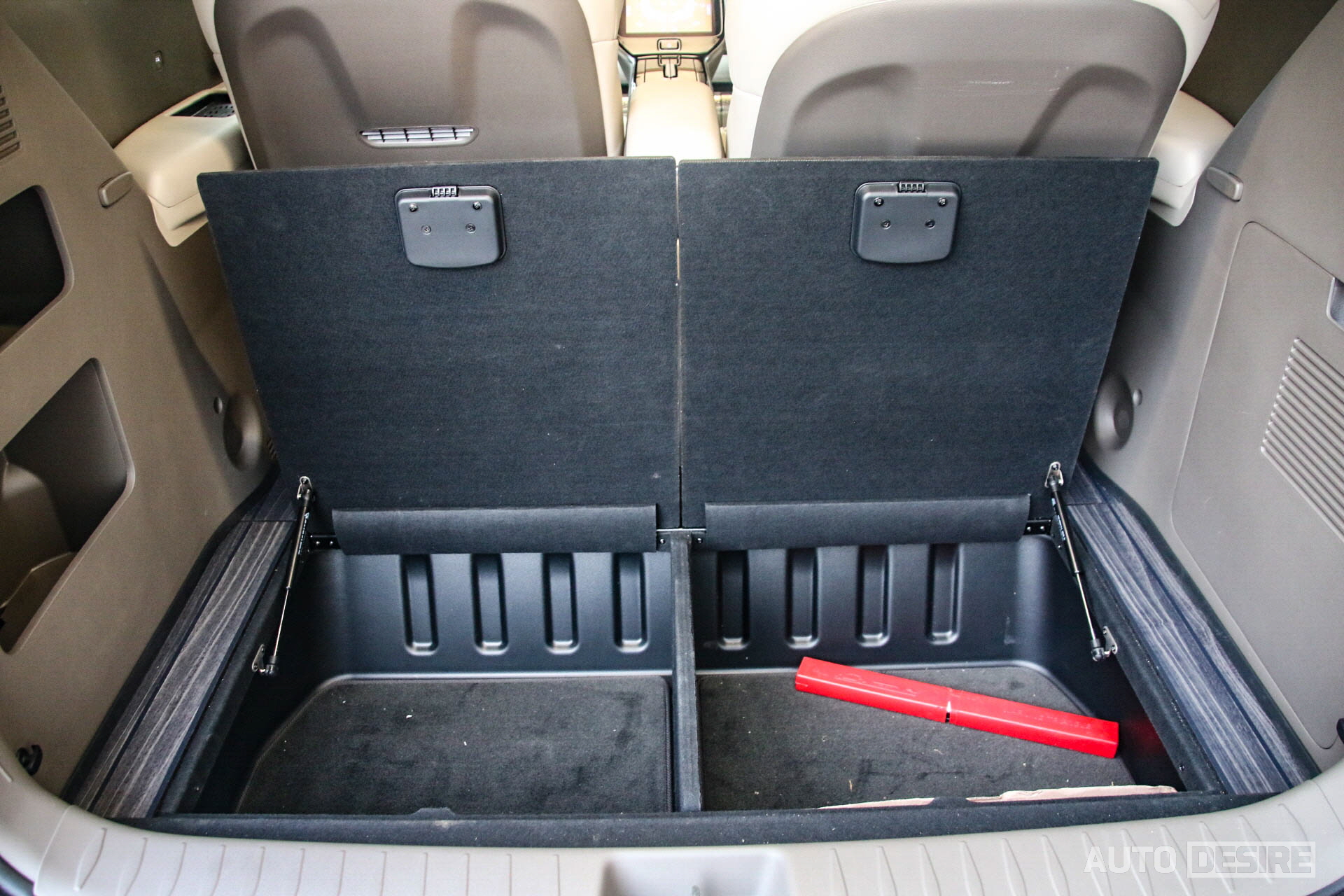 3열 시트가 아예 존재하지 않기 때문에 2열 좌석 뒤편의 적재 공간은 기본 상태에서도 상당히 넓고, 적재 공간 상단에는 LED 조명까지 장착된 옷걸이를 마련하고, 적재공간 하단 내부에 신발 및 다양한 물품들을 넣어둘 수 있는 러기지 수납함이 있어 장거리 출장 시 필요한 옷, 신발 등을 보관할 수 있고, 골프백을 적재하기에도 모자람 없는 공간을 제공한다.