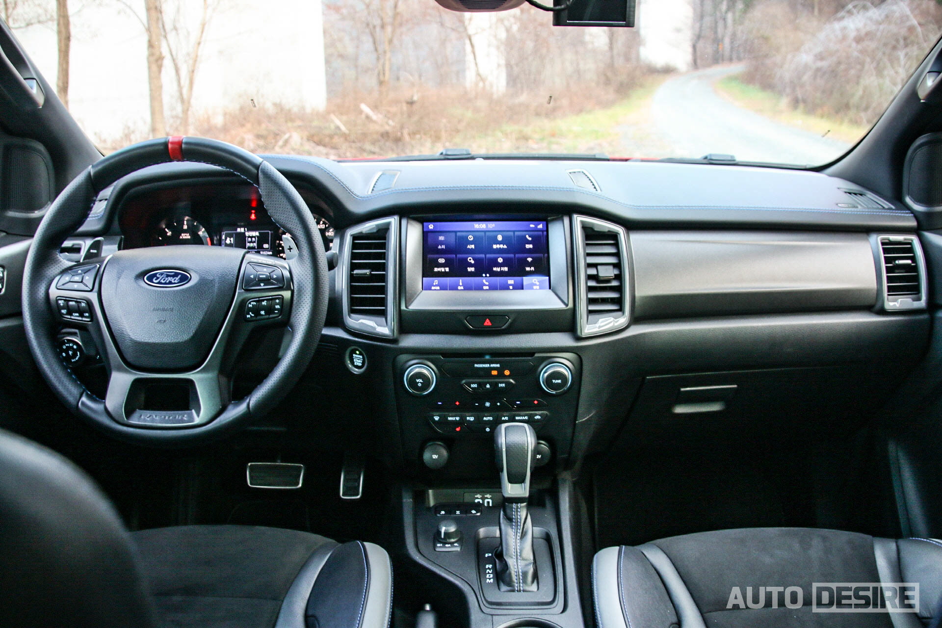 또 스티어링 휠과 기어 노브, 시트에 파란색으로 포인트 스티치를 넣었고 계기판도 타코미터와 속도계가 좌우에 위치하고 빨간색 바늘과 중앙에 TFT 정보창이 있는 랩터 전용 디자인 계기판을 적용해 와일드트랙과 차별을 둔 모습이다. 변속기 수동 조작도 기어 노브에 토글 버튼으로 조작하는 와일드트랙과 다르게 스티어링 휠 뒤에 커다란 시프트 패들을 장착해 더 빠르고 정확하게 조작할 수 있게 했다.