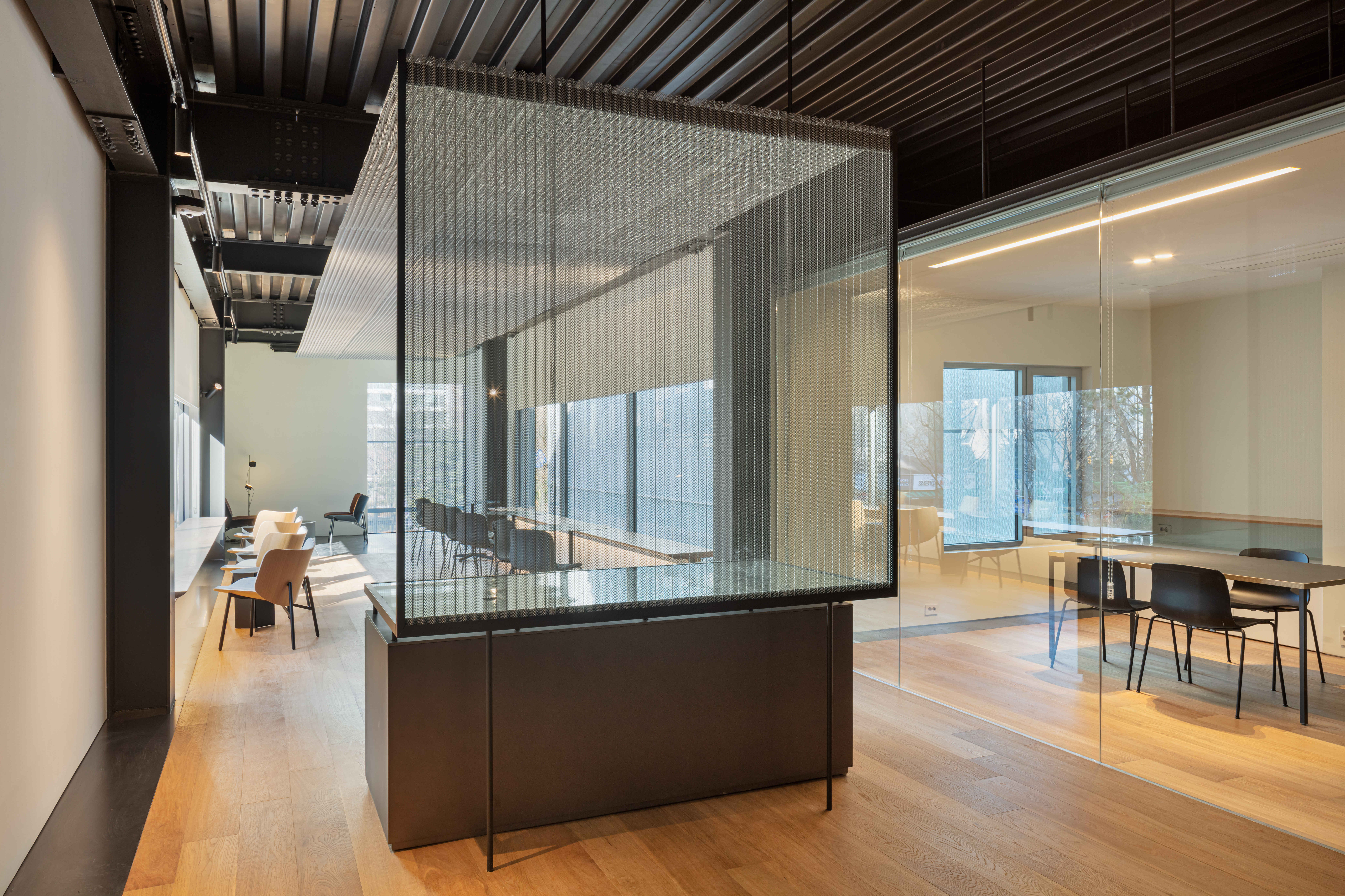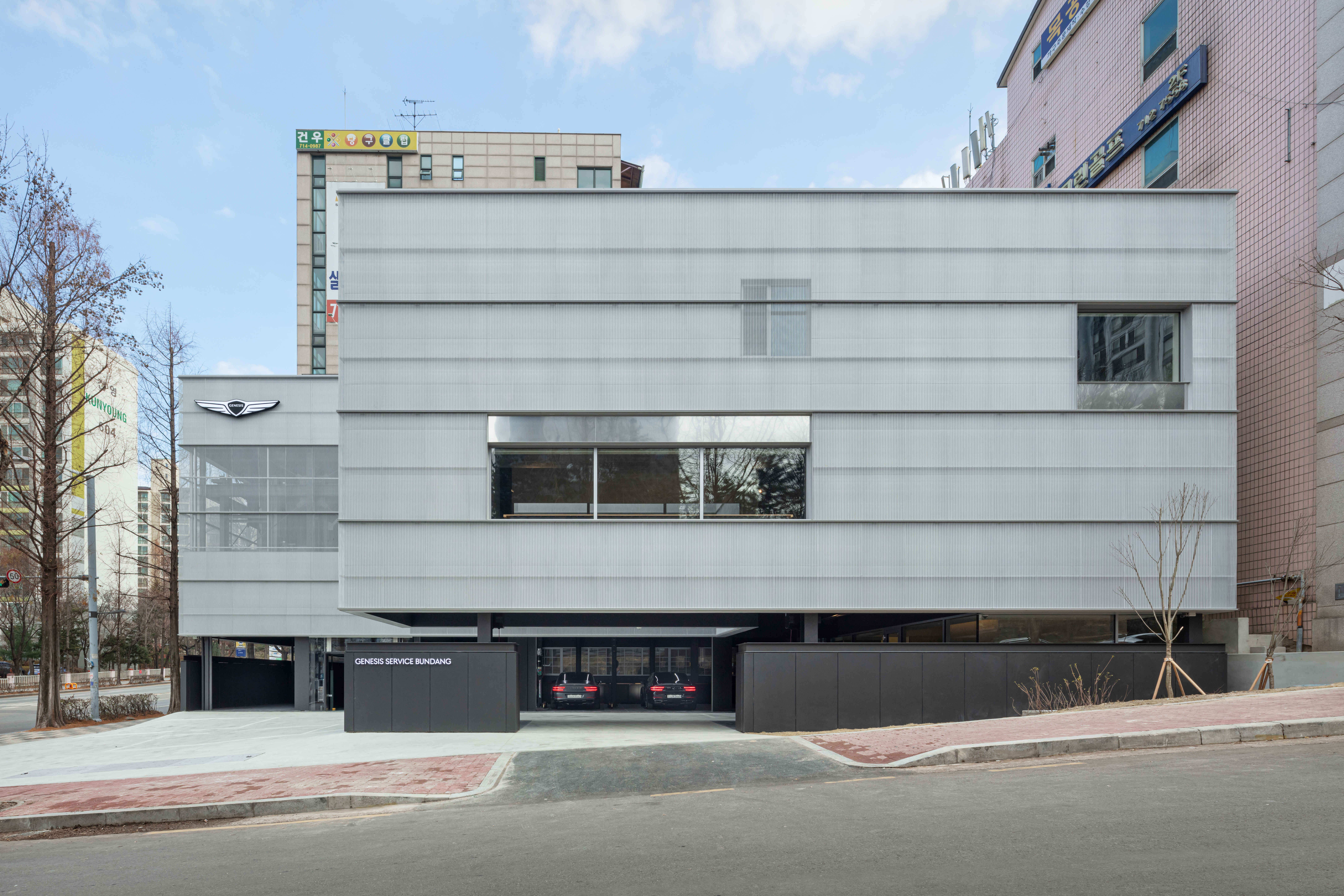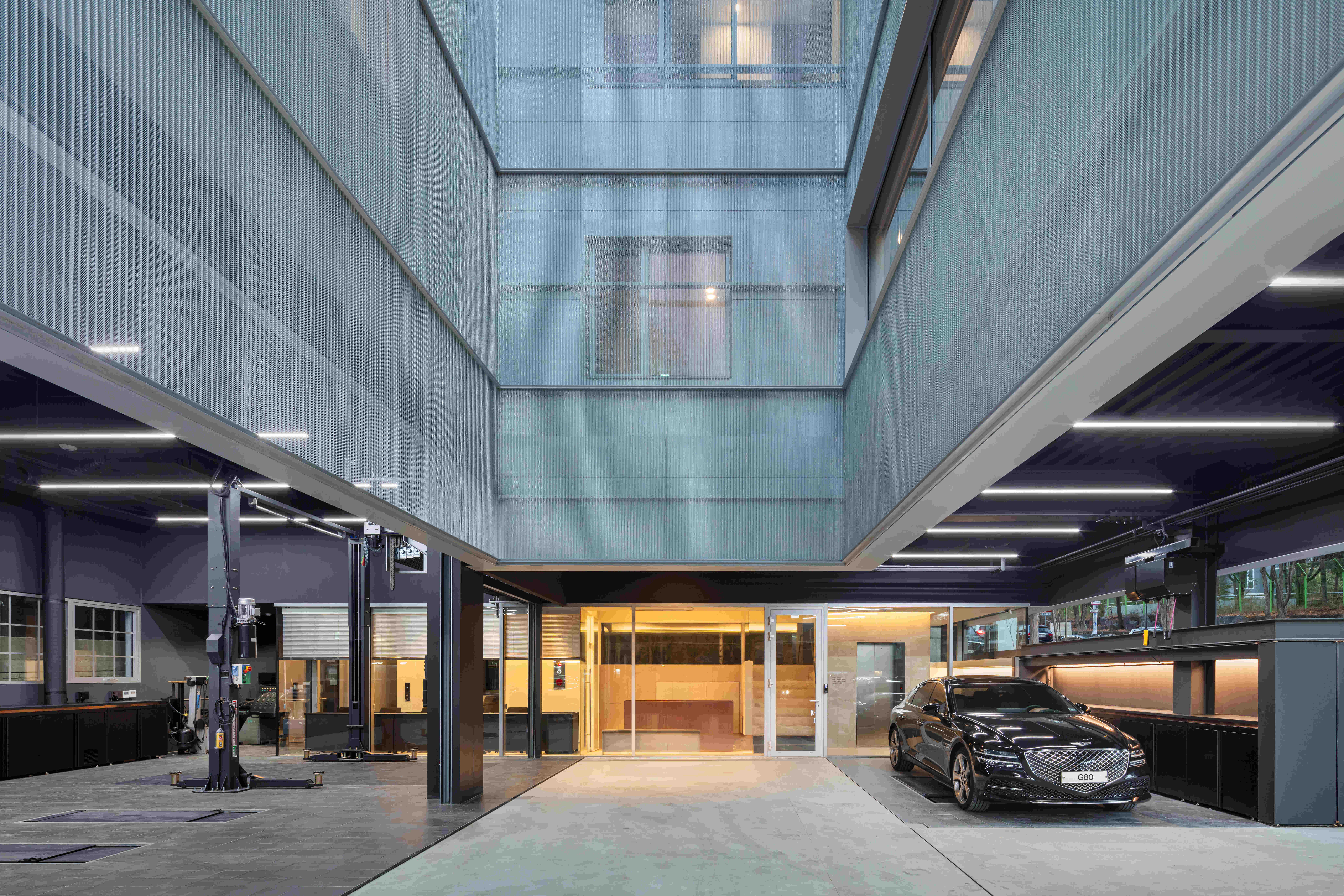 서비스 센터 건물 외관은 반투명 메탈 소재인 메시 골강판을 적용해 주변 환경과 어울리면서도 정교함, 우아함이라는 제네시스의 브랜드 이미지를 전당하고, 내부에는 철골 구조의 디테일과 원재료 고유 특성을 살린 마감재를 적용해 본질적 가치에 집중하는 제네시스 철학을 드러낸다.