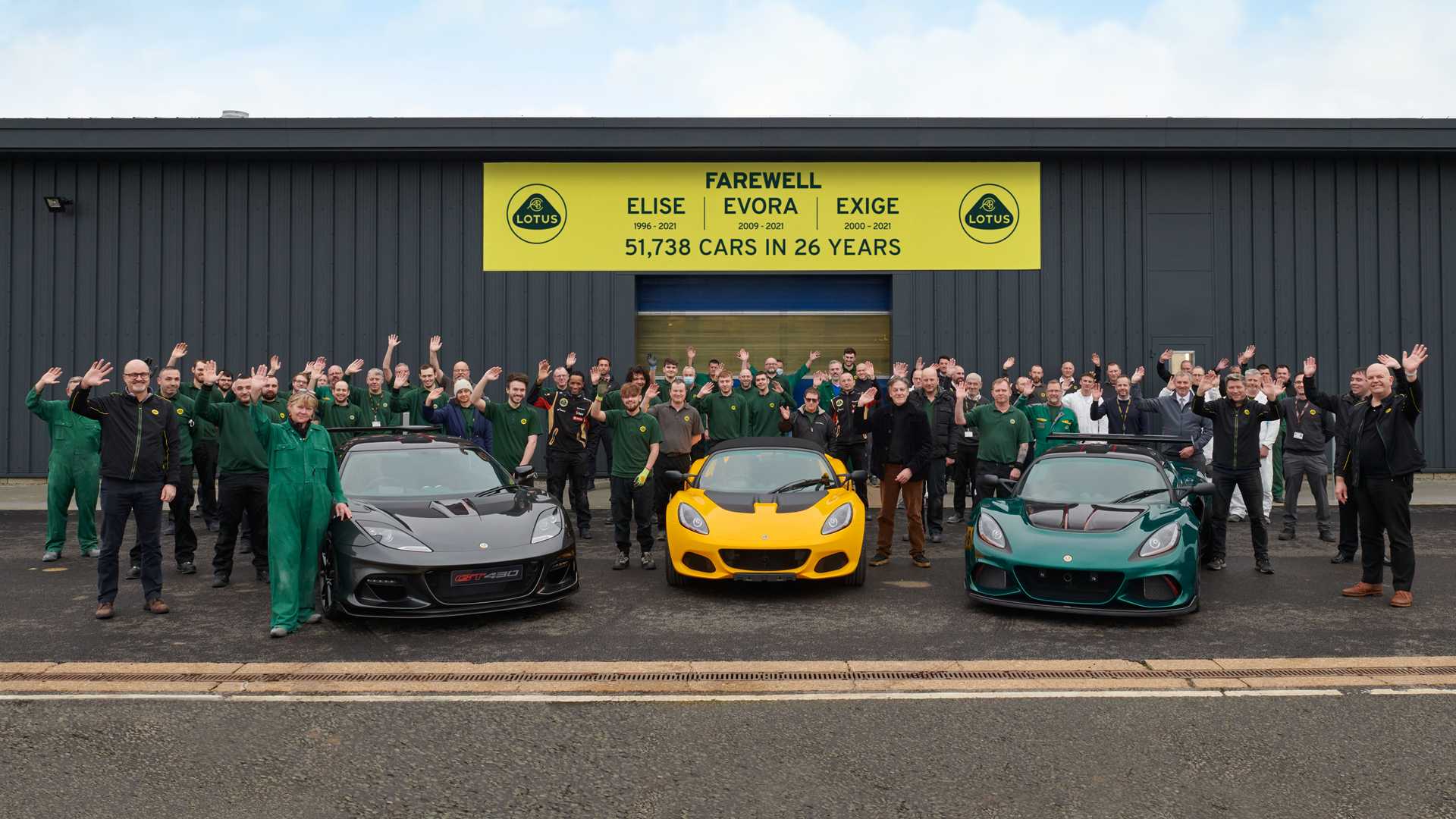 마지막을 기념해 생산한 옐로우 엘리스 스포츠 240 파이널 에디션과 헤리티지 레이싱 그린 엑시지 컵 430 파이널 에디션, 다크 메탈릭 그레이 에보라 GT430 스포츠는 고객에게 판매하지 않고, 로터스 헤리티지 컬렉션으로 보존한다.
