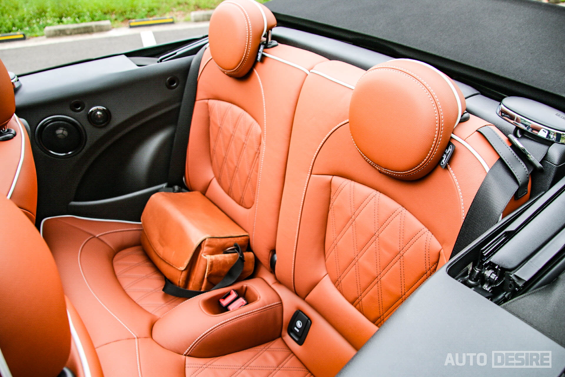 아무래도 뒷자리에 승객이 탈 일이 많지는 않을 것이기도 하고, 공간이 그렇게 넓은 편은 아니지만 앞 좌석 시트를 조금만 당겨주면 170cm 내외의 성인까지는 탑승할 정도의 공간은 마련할 수 있다. 센터 터널에 마련한 컵홀더와 좌우 트림의 스피커 등 뒷좌석 승객을 위한 사양들도 보인다. 다만 오픈 에어링을 즐길 때 바람이 휘날리는 것을 막아줄 에어 디플렉터를 설치하면 뒷좌석은 오롯이 짐 공간으로만 사용할 수 있다. 더불어 오픈탑 특성상 트렁크 공간은 해치백 대비 협소한 것을 감안해야 한다.