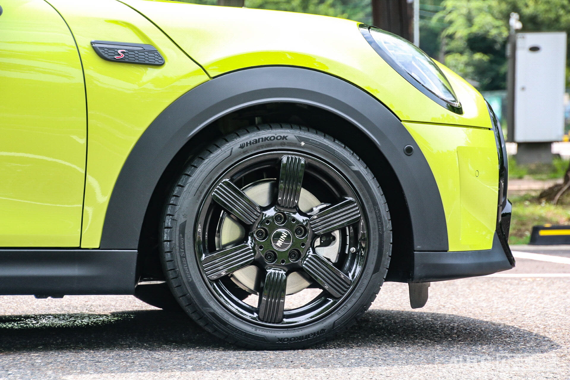 미니 컨버터블 쿠퍼 S의 타이어는 한국타이어 벤투스 S1 EVO3, 205/45R 17 사이즈로 장착이 된다. 페달 스포크 블랙 휠도 제스티 옐로 외상 색상에 아주 잘 어울리는 모습.