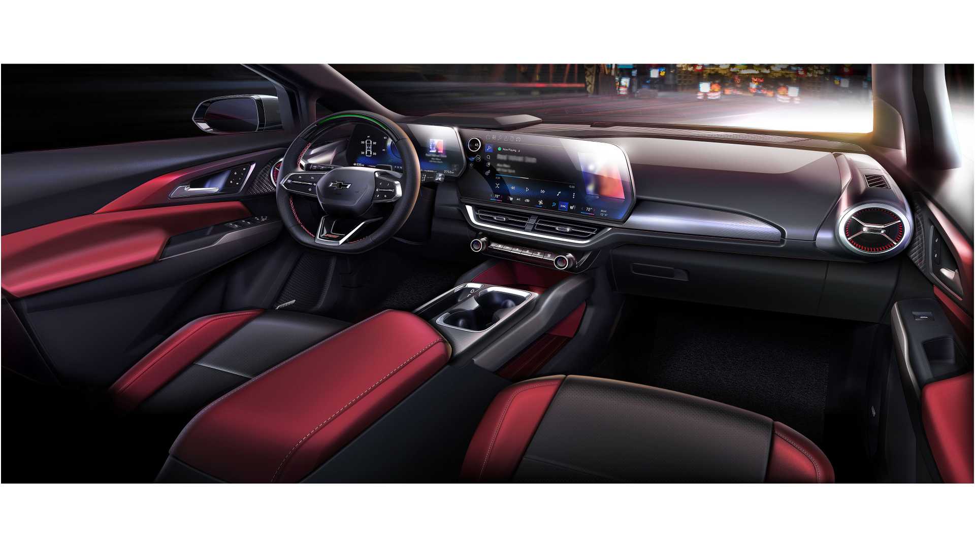 아직은 렌더링 스케치에 머물러 있는 실내에는 이번에 공개한 실버라도 EV처럼 디지털 클러스터와 함께 17인치 대형 스크린 인포테인먼트 시스템이 적용되는 것으로 보이며, 수형평으로 와이드한 배치에 버튼을 줄인 간결한 구성으로 개방감과 시야를 넓게 확보한 모습이다. 기어 셀렉터는 칼럼 시프터 타입으로 적용되고, 스티어링 휠에는 인디케이터로 추정되는 조명이 적용되어 있다. 이 외에 RS 트림에는 D컷 스티어링 휠과 블랙/레드 투톤 인테리어가 적용된다.