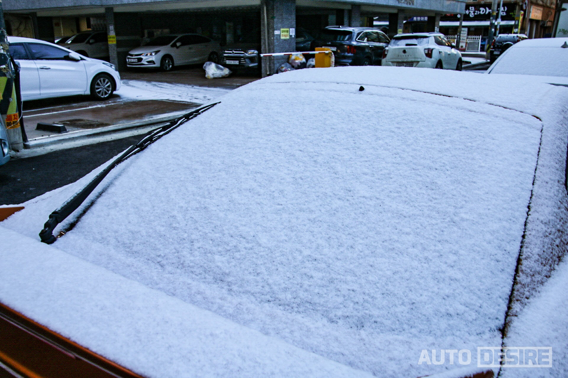 마침 어젯밤 사이, 눈이 꽤 내리면서 아침에 나와보니 야외에 주차해두었던 차에 눈이 소복이 쌓인 상태였다. (지하 주차장에 주차를 했더라면 좋았겠지만, 주차 공간 때문에 매번 맘 같이 편하게 댈 수 있지가 않다..ㅠㅠ)
