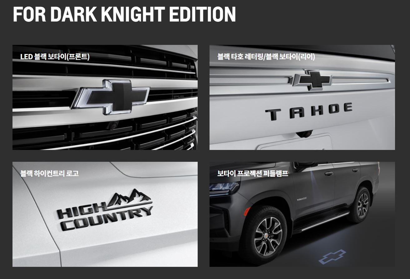 추가로 LED 블랙 보타이 엠블럼, 블랙 타호 레터링과 블랙 하이컨트리 로고, 보타이 프로젝션 퍼들램프가 제공되는 타호 다크 나이트 스페셜 에디션도 제공되어 특별한 스타일을 원하는 고객들이 선택할 수 있게 했다.