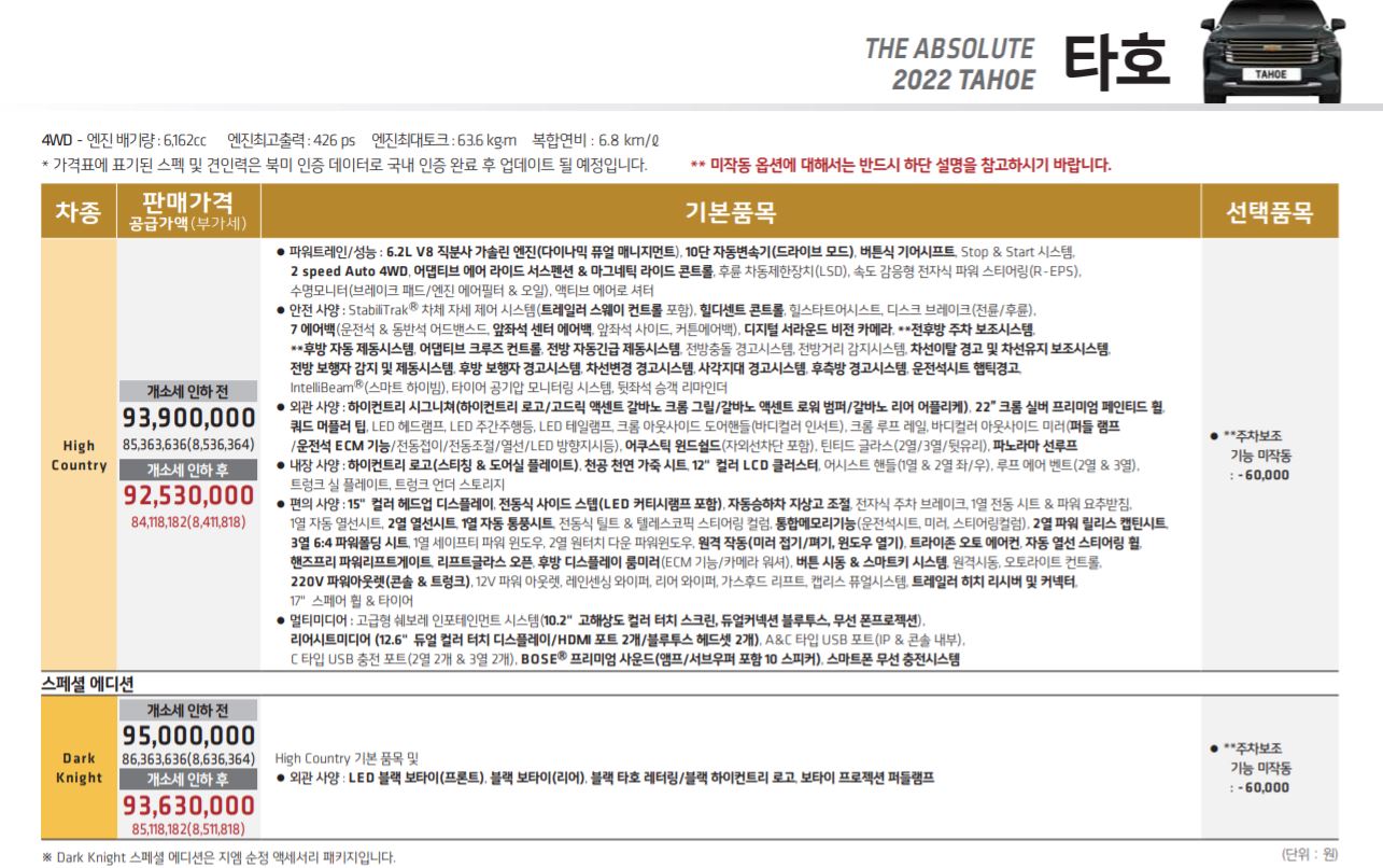 쉐보레 신형 타호의 국내 판매 가격은 하이 컨트리 트림 9,253만 원, 다크 나이트 스페셜 에디션 9,363만 원.(개별소비세 인하 기준)
