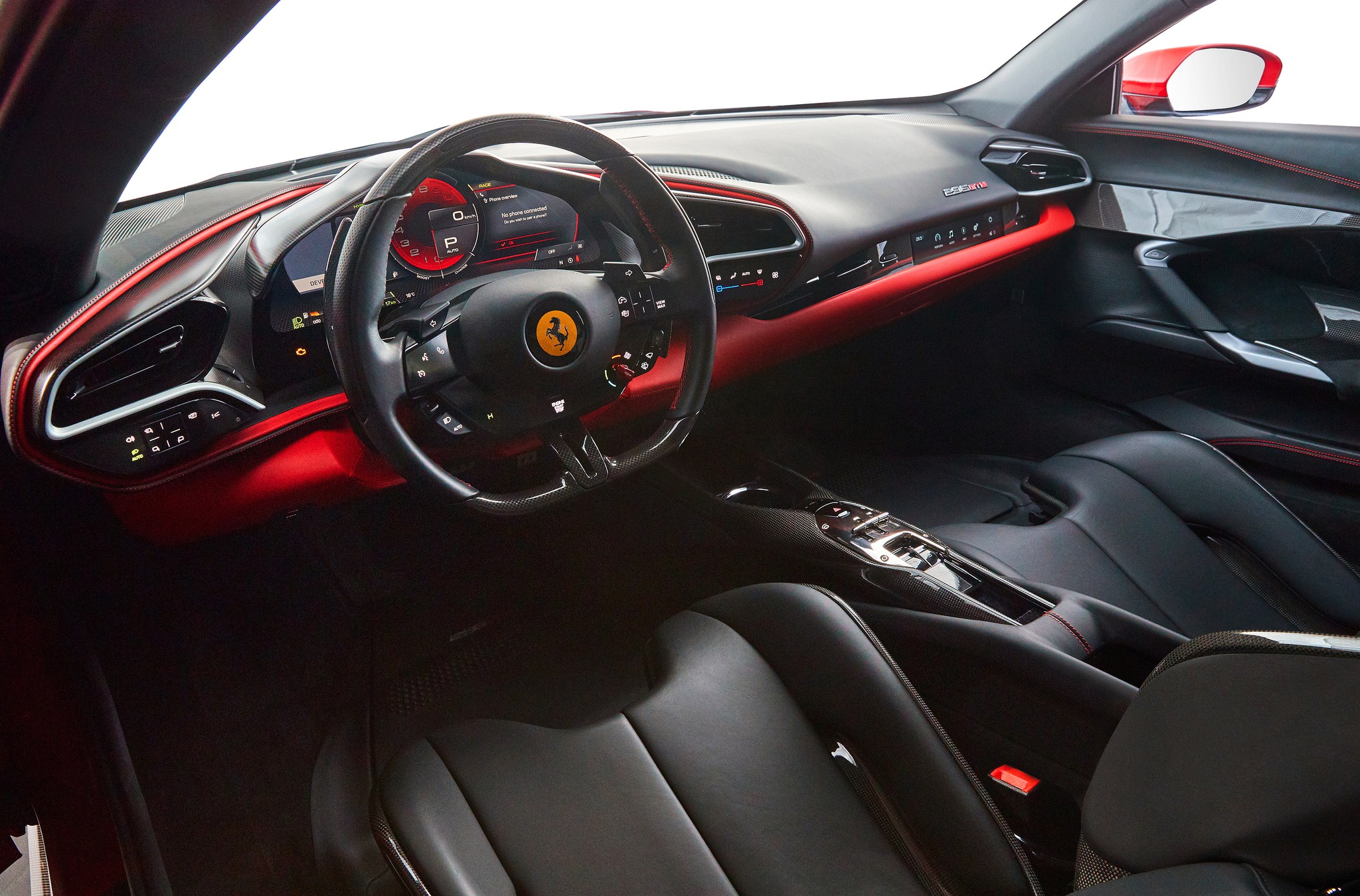 실내는 풀 디지털 인터페이스로 구축, 수평형 배치에 운전석에 집중된 간결한 구성을 보여준다. 조수석의 크래시 패드에도 디스플레이를 적용해 조수석 탑승객이 차량 주행에 관련한 정보들을 함께 확인할 수 있는 것도 특징이며, 센터 콘솔의 기어 셀렉터는 SF90의 것처럼 과거 클래식 페라리 모델들의 오픈 게이트 수동 변속기에서 스타일을 따왔다.