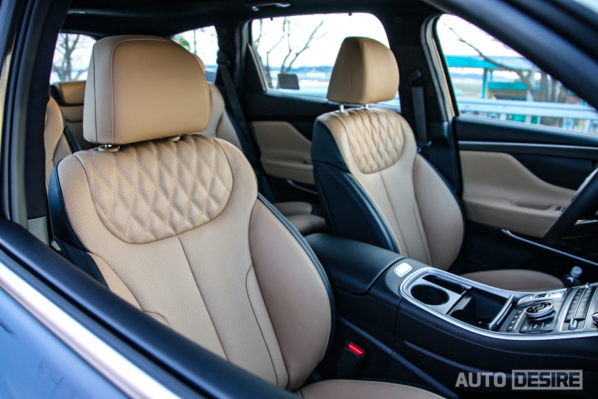 2열 시트의 변화가 특징 모델인 만큼 외관의 모습은 기존과 동일하다. 2020년에 페이스리프트 된 더 뉴 싼타페로 디자인이 파격적으로 변경되면서, 고객들의 호불호가 제법 갈리기도 편이기도 하지만 이제는 꽤 친숙해지기도 했고, T 형태로 들어오는 LED 주간 주행등이 꽤 강한 인상을 남긴다. 캘리그래피 트림은 다크 크롬 전용 패턴 프런트 그릴과 바디 컬러 클래딩, 전용 디자인 20인치 휠이 적용되어서 프레스티지 트림 대비 고급스럽고 세련된 느낌을 준다.