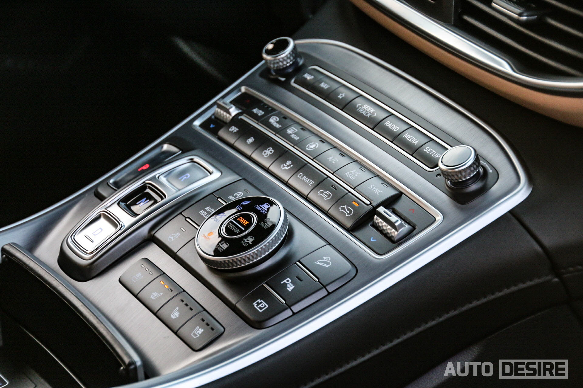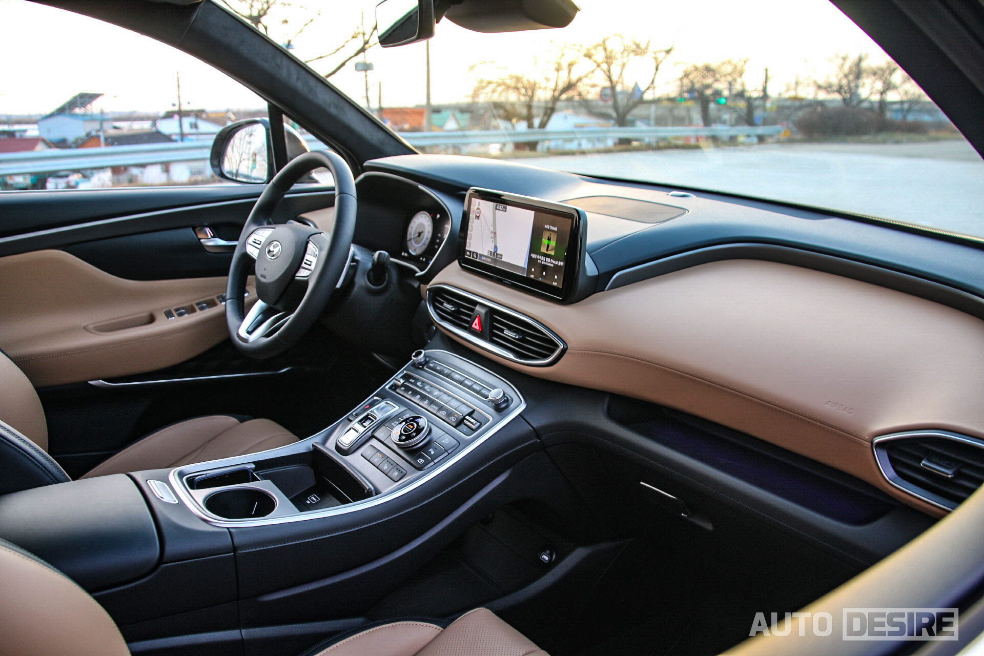 1열 공간 역시 지난해 먼저 시승해 봤던 더 뉴 싼타페 2.5 가솔린 캘리그래피 7인승 모델과 동일하다. 도어트림부터 크래시 패드 상단부, 센터 콘솔까지 하나로 이어져 실내를 감싸는 형태의 구조로 안정감과 안락한 느낌을 주며, 송풍구 하단으로 센터패시아와 통합된 센터 콘솔에는 수평형으로 멀티미디어 버튼과 공조장치 버튼을 배치하고 전자식 변속 버튼과 주행 모드/험로 주행 모드 다이얼도 직관적으로 배치해뒀다.