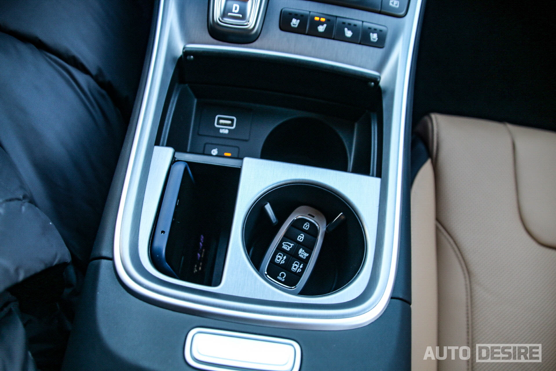 센터 콘솔 하단으로는 추가 수납공간과 함께 USB 충전 포트, 12V 파워아웃렛을 제공하고, 무선 충전 시스템은 도크 형태로, 컵홀더도 높이가 다른 2단 형태로 적용된다. 센터 콘솔 수납함 상단 커버는 암레스트로 사용하기에 편한 높이가 마음에 든다. 연식 변경이 되면서 스마트폰 무선 충전이 캘리그래피 트림 기본 적용으로 변경되었다.