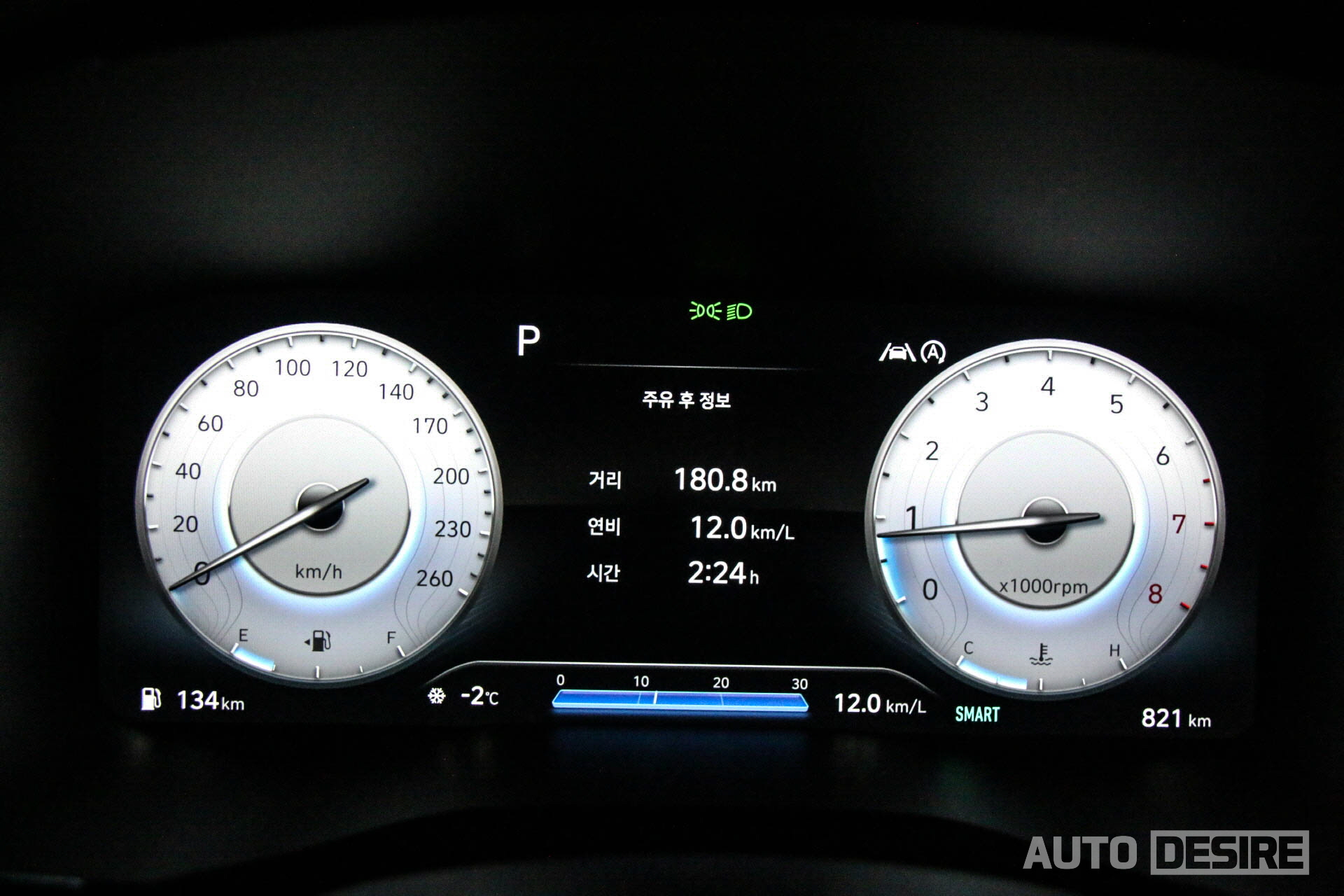 시승차 기준 공인 복합 연비는 9.5km/L, 도심 8.6km/L, 고속도로 10.9km/L이며 이는 지난해 시승했던 7인승 2.5 가솔린 캘리그래피 모델과 동일한 수치이다. 실제 전주-용인으로 오는 고속도로 180km의 구간에서 기록한 계기판 상 고속연비는 12.0km/L로 공인 고속도로 연비 대비 1km/l 이상 상회하는 수치였고, 주행 조건에 따른 차이는 있겠지만 먼저 시승한 7인승 모델과도 0.5km/L 내외 오차를 보여준다.