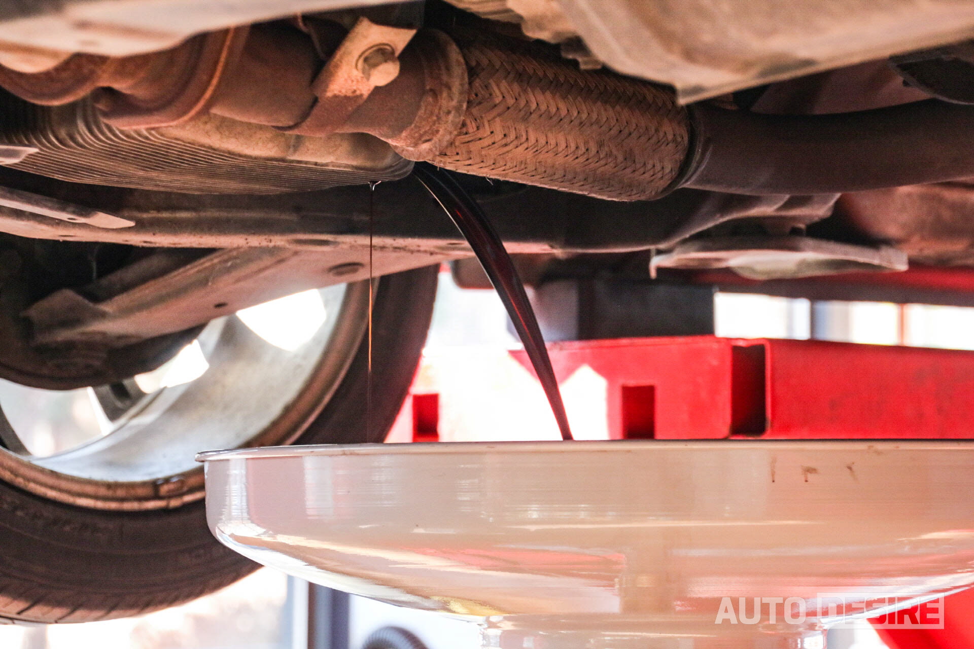 차를 리프트에 올렸으니 이제 묵은 엔진오일 빼줄 시간! 드레인 볼트를 빼주니 콜라색처럼 까맣게 변한 오일 등장. 안쪽에 최대한 오래된 오일이 남아있지 않도록 싹 다 빼주고 난 뒤에,