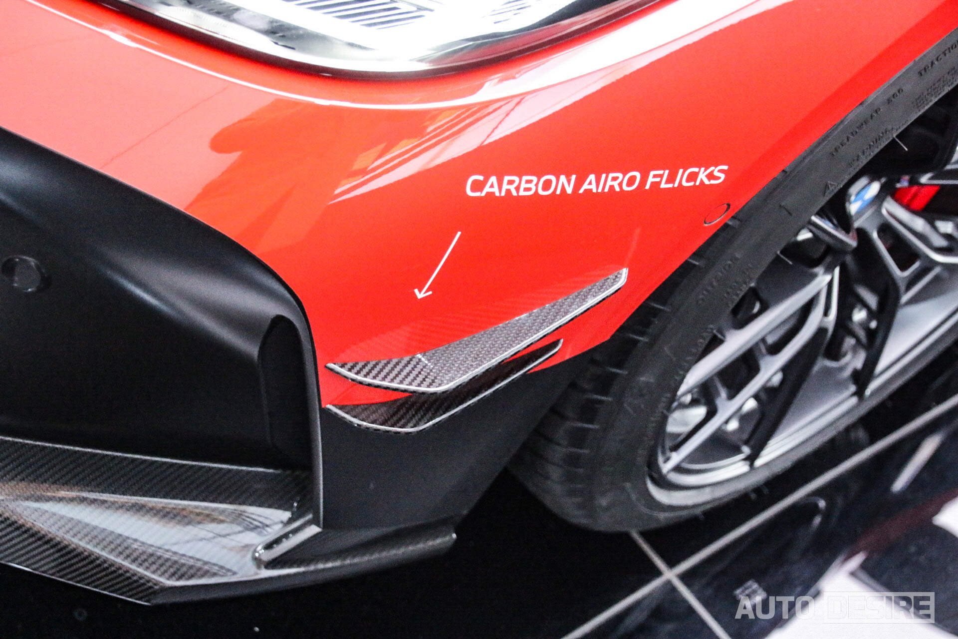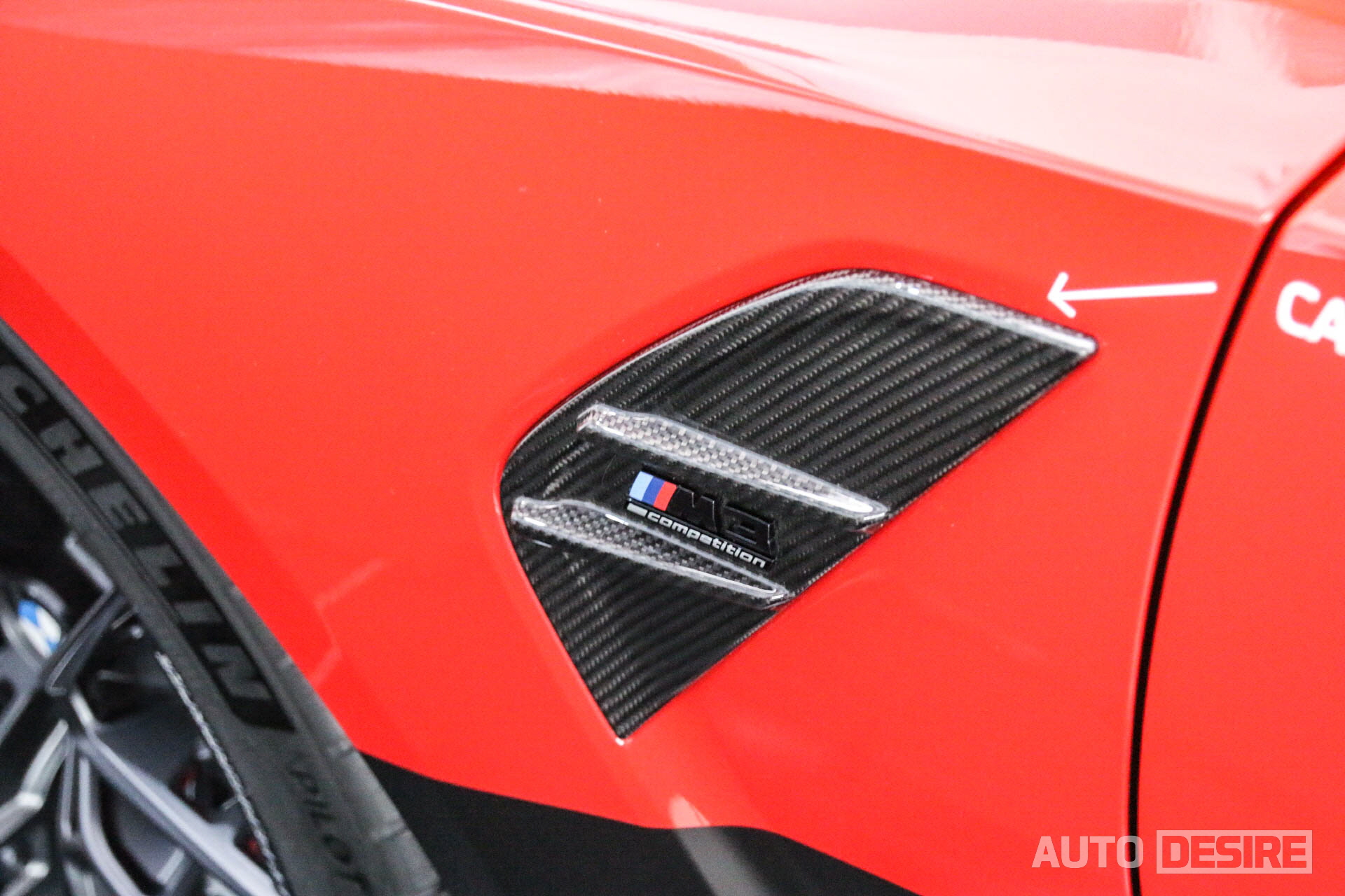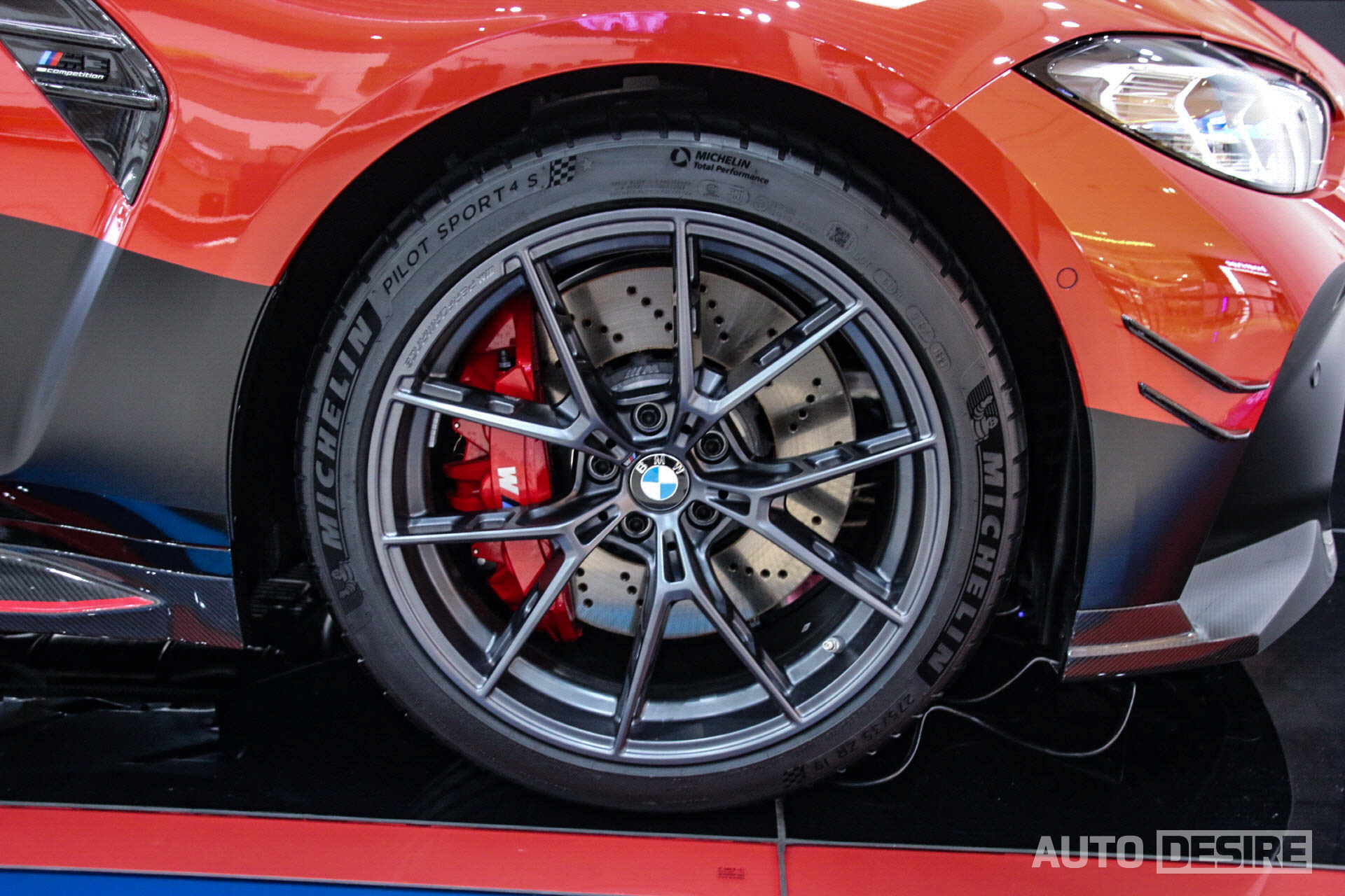 'M 퍼포먼스 파츠'를 더한 모델인 만큼 시각적인 강렬함과 함께 공력 성능을 개선하고, 무게 부담은 줄여줄 카본 파츠가 곳곳에 더해진 것을 확인할 수 있었는데 일단 범퍼 하단에는 카본 프론트 어태치먼트, 범퍼 측면에는 카본 에어로 플릭. 흔히 카나드라고 부르는 파츠가 더해졌고 측면으로는 경량 스포츠 휠과 함께 휠 안쪽으로 M 로고가 새겨진 빨간색 6피스톤 캘리퍼와 타공 브레이크 디스크가 장착되어 있다.