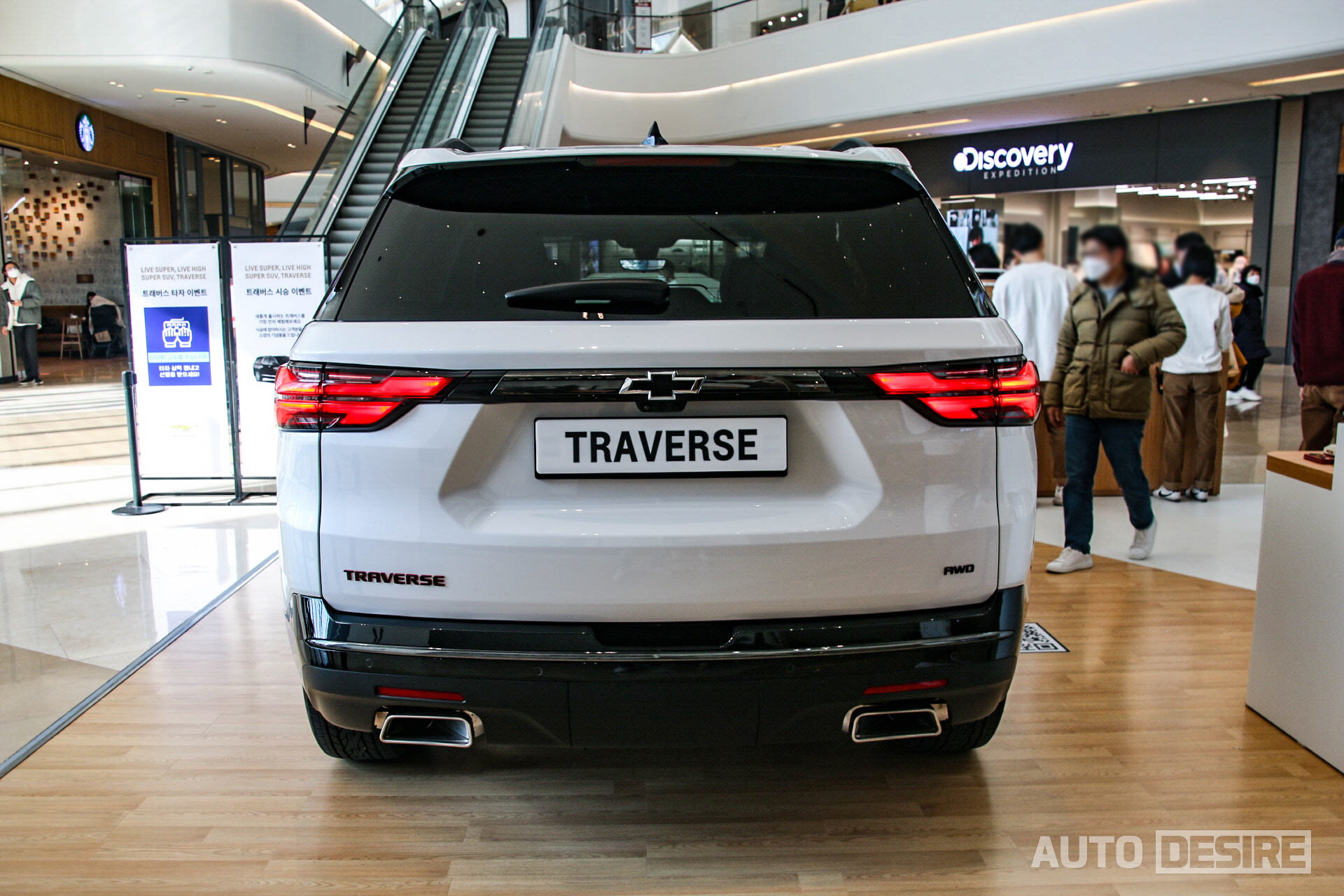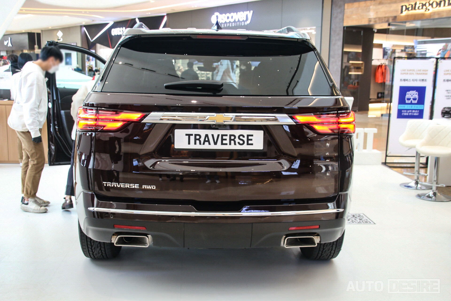 후면에서 2022 트래버스의 달라진 점으로 신규 그래픽의 LED 리어 콤비네이션 램프가 적용되어 최근 트렌드를 따라가면서, 역시나 트레일블레이저-블레이저 등 같은 쉐보레 SUV들과 디자인을 공유하는 모습이다. 이 외 부분들에서는 사각형 듀얼 머플러 팁과 리플렉터 디자인 등 기존 트래버스 프리미어 트림과 크게 다르진 않아 보인다.