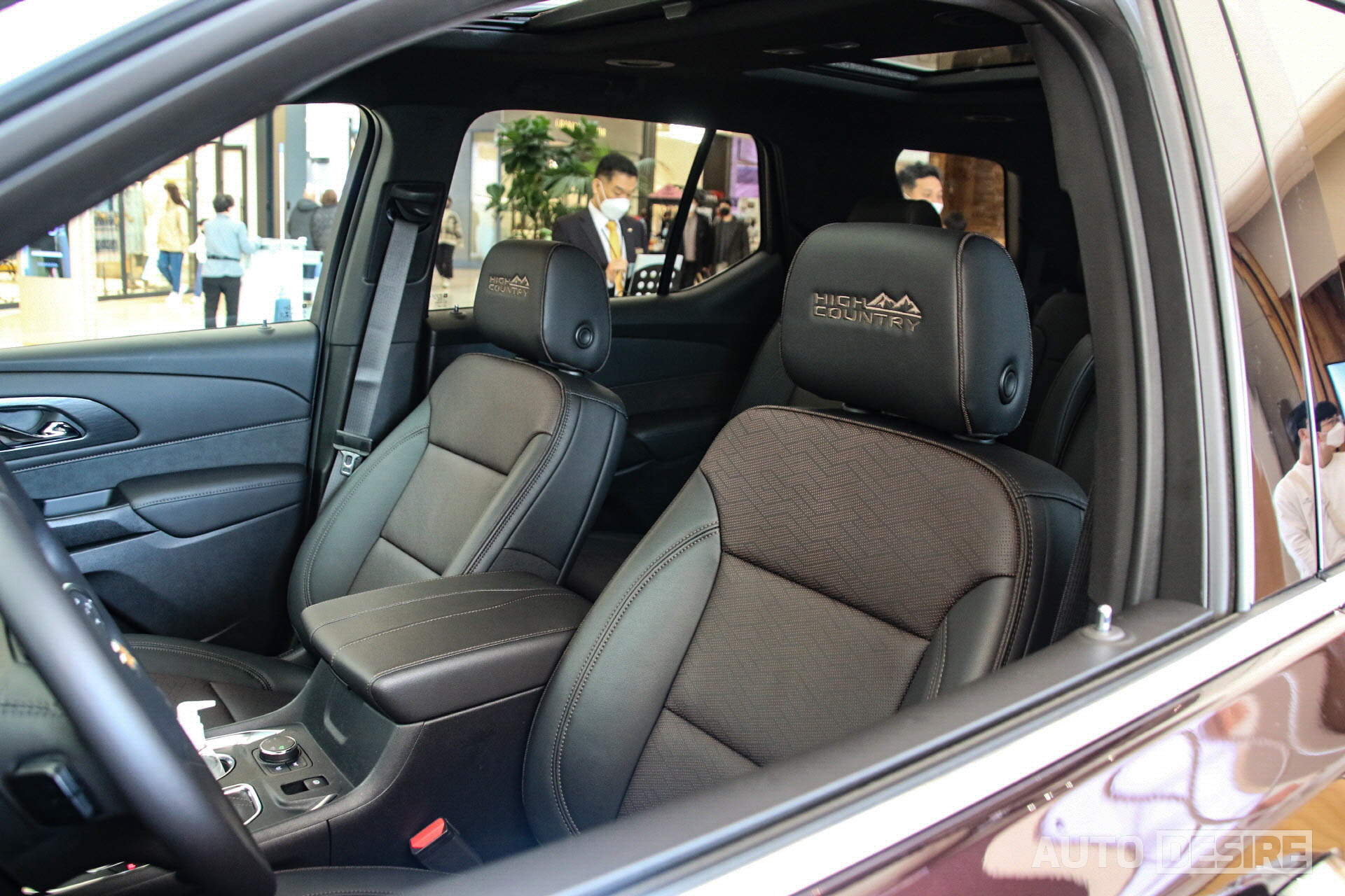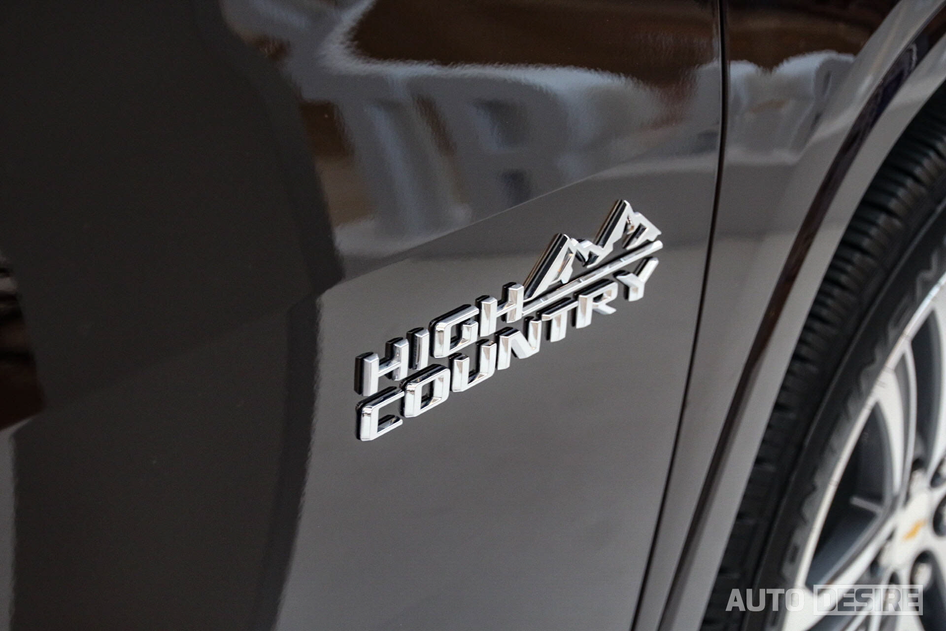 하이컨트리에는 최상위 트림으로서 고급감을 높이기 위해 고드릭 액센트 갈바노 크롬 그릴이 적용되는데, 그릴 가로바가 구릿빛이 감도는 모습이다. 측면부는 기존 트래버스와 비교해 크게 차이는 없고 하이컨트리 트림에는 바디 컬러 클래딩 적용으로 더 깔끔하고 세련된 인상을 전하고 1열 도어에 트래버스 레터링 대신 하이컨트리 전용 레터링, 휠도 하이컨트리 전용 트윈 6-스포크 디자인의 20인치 루나 그레이 알로이 휠이 적용된다. 화려함을 과하게 더하지 않고 적당히 세련되고 고급스러움을 유지하는 선에서 그친 모습이다.