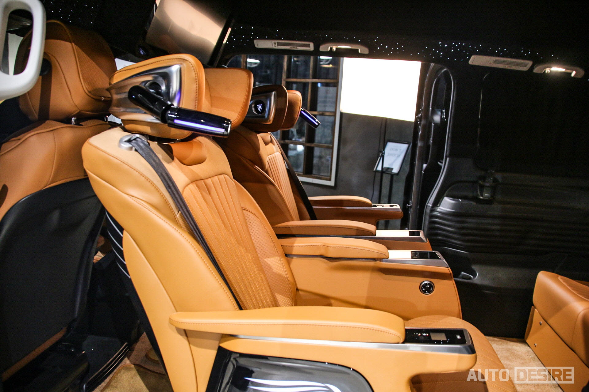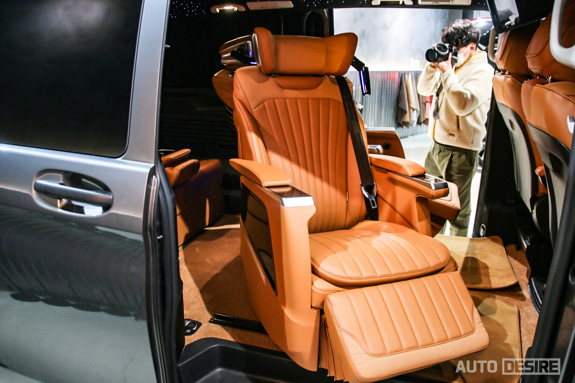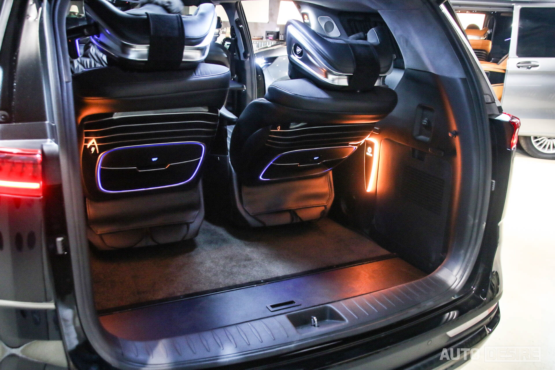 실내에서는 승객이 편안하게 탑승하고 쉴 수 있도록 커스텀으로 제작된 버킷 확장형 퍼스트 클래스 시트가 적용되어 있는데, 암 레스트의 터치 패널을 통해 메모리 기능과 시트 각도 조절, 언더 서포터 조절 및 마사지 기능 등을 사용할 수 있고, 헤드레스트에는 독서등도 함께 거치되어 있다. 여기에 그치지 않고 2열 시트는 좌우 모두 회전 시트로 적용, 180도 폴딩이 가능한 3열 시트와 함께 활용하면 차박용으로 활용하기에도 좋고, 이동 중에도 2열과 3열의 승객이 마주 보고 회의를 하거나 대화를 나누기 편리하게 세팅할 수 있다.
