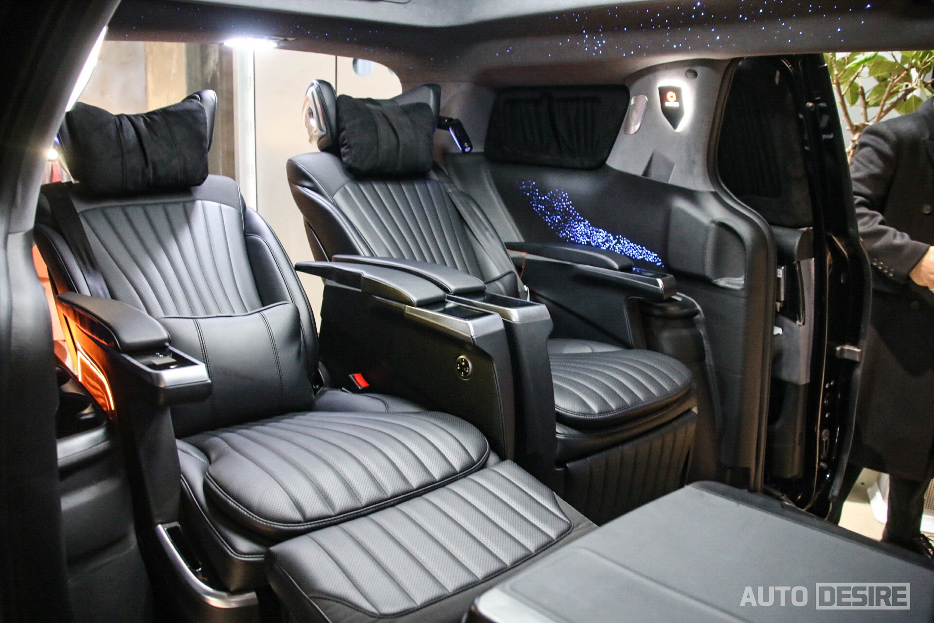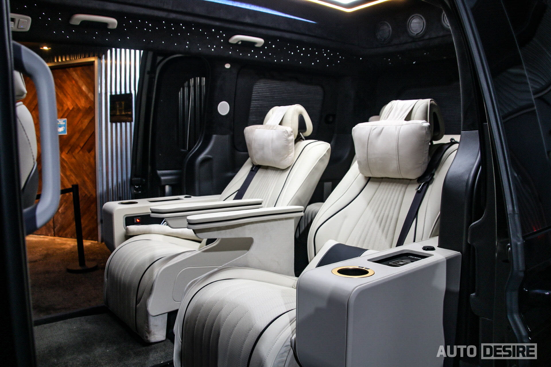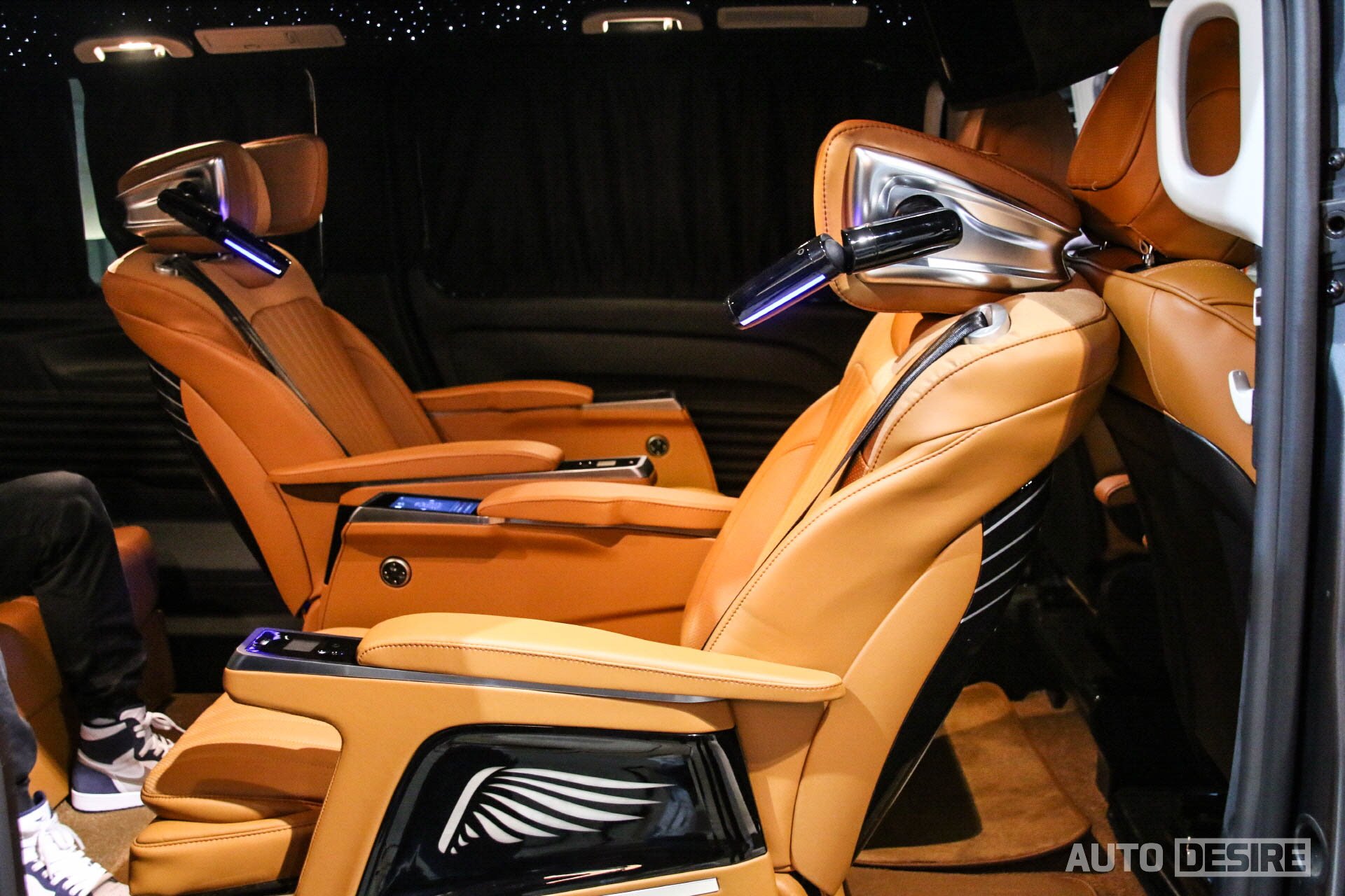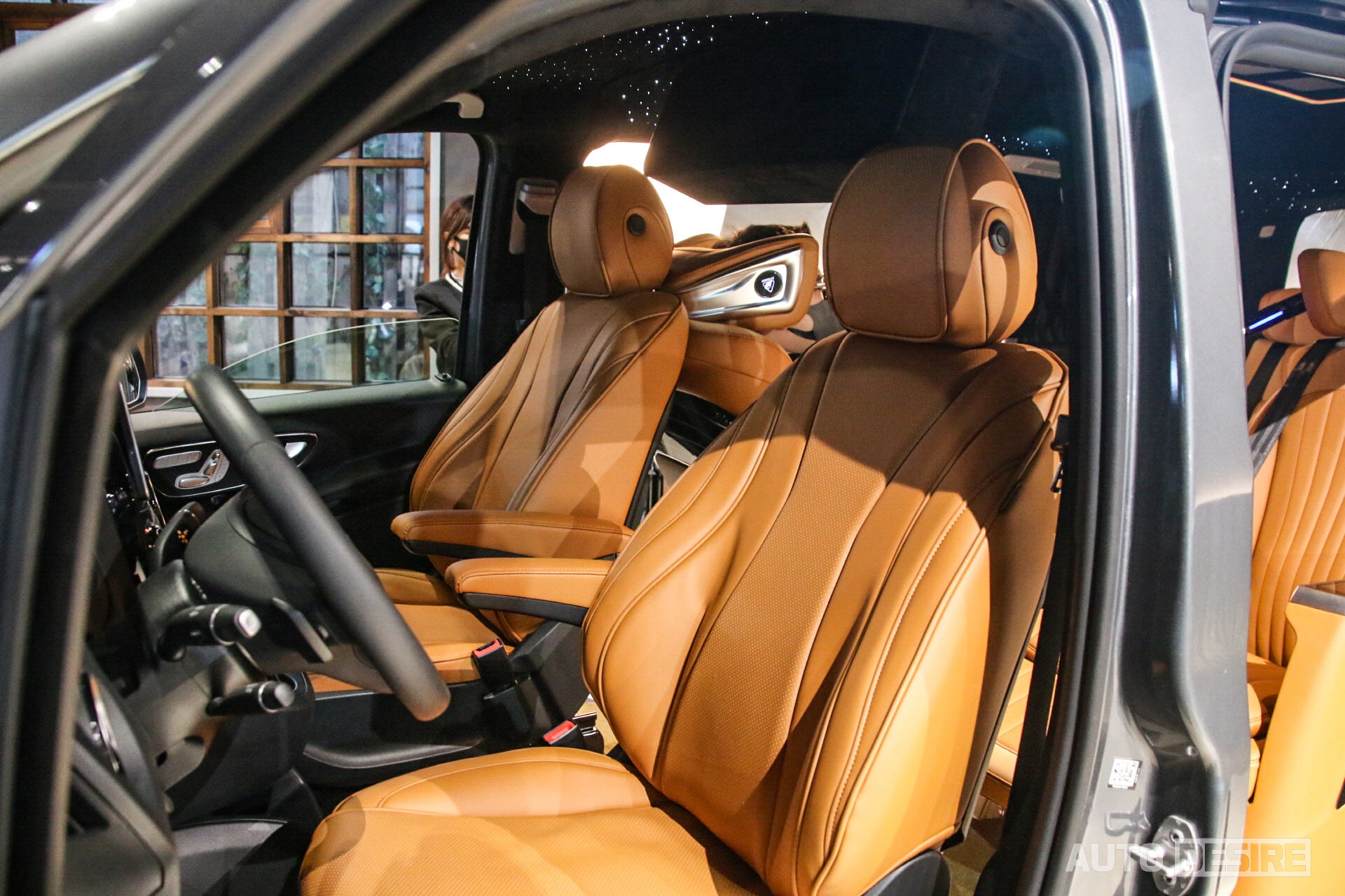 실내에서는 승객이 편안하게 탑승하고 쉴 수 있도록 커스텀으로 제작된 버킷 확장형 퍼스트 클래스 시트가 적용되어 있는데, 암 레스트의 터치 패널을 통해 메모리 기능과 시트 각도 조절, 언더 서포터 조절 및 마사지 기능 등을 사용할 수 있고, 헤드레스트에는 독서등도 함께 거치되어 있다. 여기에 그치지 않고 2열 시트는 좌우 모두 회전 시트로 적용, 180도 폴딩이 가능한 3열 시트와 함께 활용하면 차박용으로 활용하기에도 좋고, 이동 중에도 2열과 3열의 승객이 마주 보고 회의를 하거나 대화를 나누기 편리하게 세팅할 수 있다.