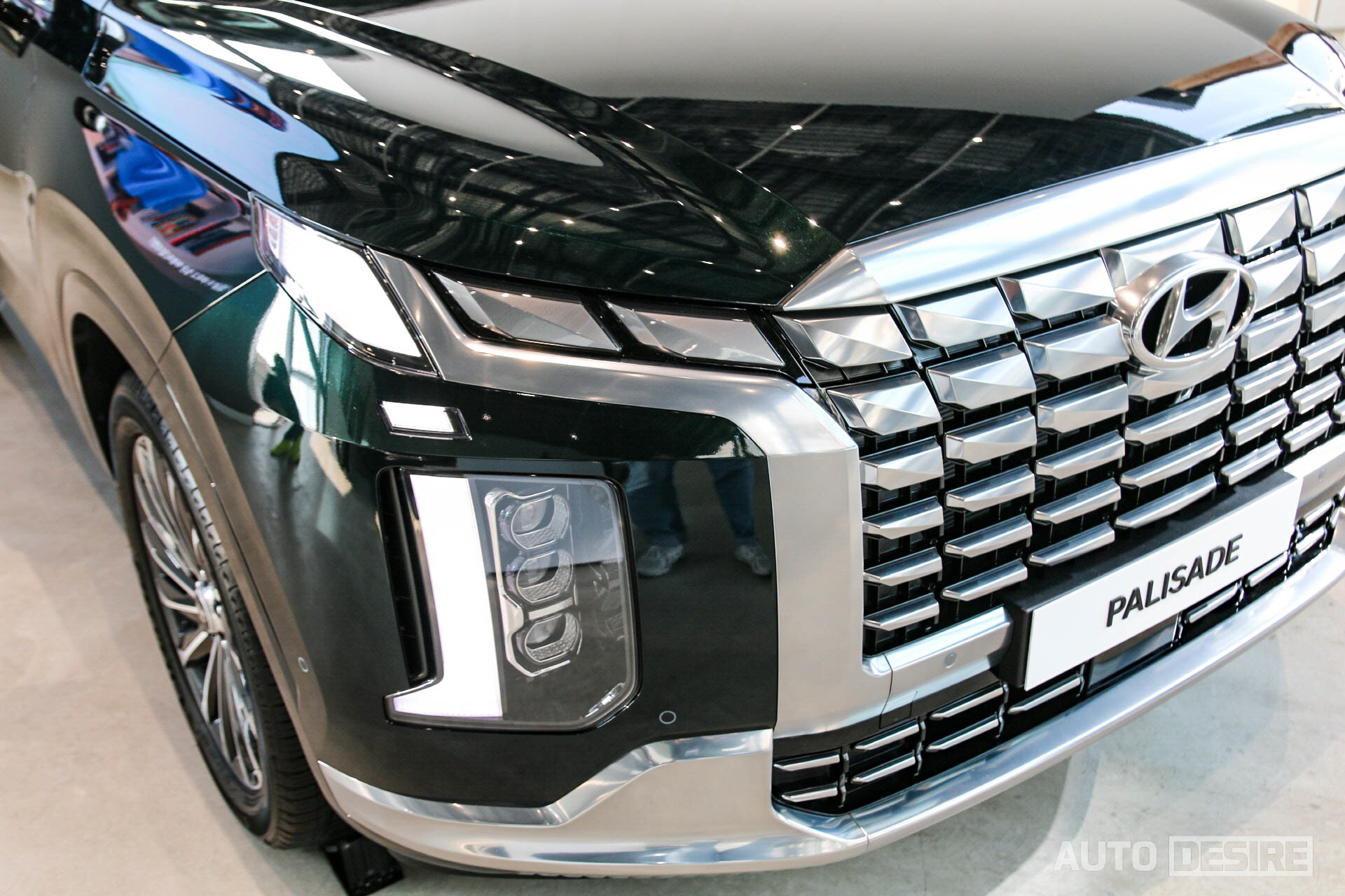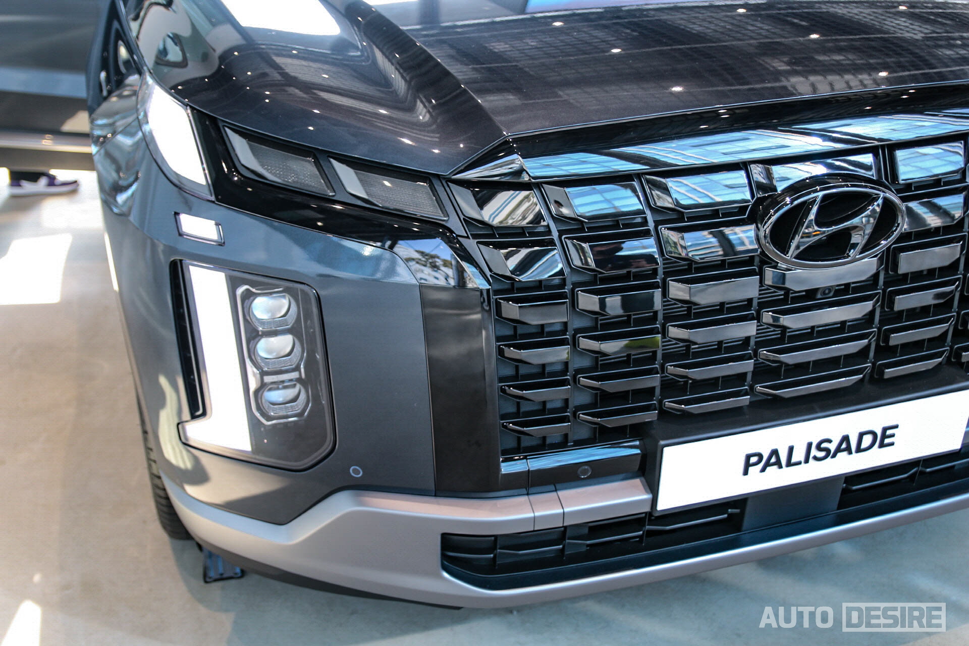 범퍼 하부의 스키드 플레이트 형상은 기존 팰리세이드 캘리그래피 모델의 디자인을 와이드하게 리터칭한 느낌. 캘리그래피 트림은 크롬에 빗살 무늬 패턴으로, 프레스티지 트림은 무광 그레이에 평평한 표면으로 적용했다. 그릴 내부 패턴은 파라메트릭 실드 디자인으로 입체감을 살렸는데, 가장 상위 고급 트림인 캘리그래피는 삼각형 형태로 디테일을 살리고 크롬 컬러로 화려한 느낌을, 프레스티지 모델은 다크 크롬에 사각형을 더 살린 형태로 깊이감, 대비감이 살고 역동적인 느낌을 준 것 같다. 범퍼 안쪽으로 살짝 들어가 있던 헤드램프를 이번에는 범퍼와 표면에 평평하게 일치하게 만들면서 전면 표면 전체가 연결되어 덩어리감이 크게 느껴지는 효과를 주었다. 더불어 세련되고 깔끔한 느낌을 주기도 한다.