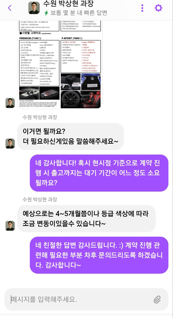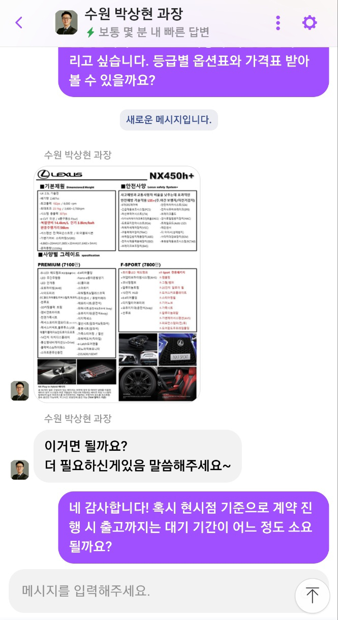 신형 NX450h 사양과 가격을 문의하면 등급별 사양 구성표와 함께 필요한 부분 안내를 받을 수 있고, 대략적인 계약 후 출고 대기 기간도 알 수 있다. 추가로 더 자세한 견적서 요청 혹은 시승 요청을 원할 시 기본 고객 정보를 입력하고 담당 세일즈 컨설턴트를 지정 받으면 더 상세한 구매 상담 진행을 받을 수 있다.