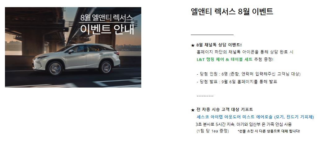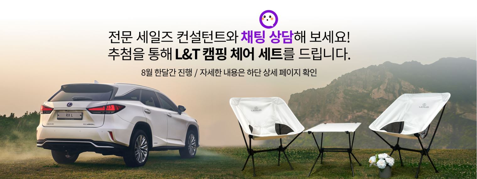 위와 같은 내용으로 채널톡을 이용해 차량 상담을 진행하고 기본 고객 정보 입력을 완료한 고객 대상으로 총 6명을 추첨! 캠핑 체어와 테이블 세트를 증정하고 있으니 렉서스 차량에 대해서 알아보고 싶은데, 혹은 렉서스 구매를 고려하고 있는데 전시장 방문은 부담스럽다면 간편하게 엘앤티렉서스 채널톡을 이용해 상담을 받고 이벤트 참여 혜택도 함께 받아보면 좋을 것 같다.