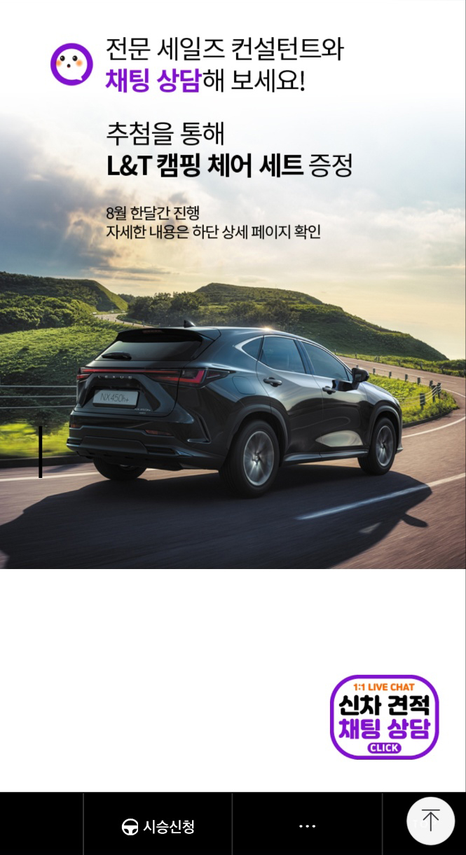 뛰어난 효율성과 정숙성, 연비 등 다양한 매력으로 수입차 시장에서 꾸준한 인기를 이어가고 있는 렉서스! 2022년 올해에는 중형급 SUV인 신형 NX가 출시되었는데, 각 트림별 사양 구성 및 가격 정보, 계약 진행 후 차량 출고 기간은 어느 정도 소요되는지 등 내용을 알아보기 위해 집에서 가까운 엘앤티 렉서스 수원전시장 담당 컨설턴트와 연결해 비대면 상담 서비스 채널톡을 이용! 8월 이벤트에도 참여해봤다.