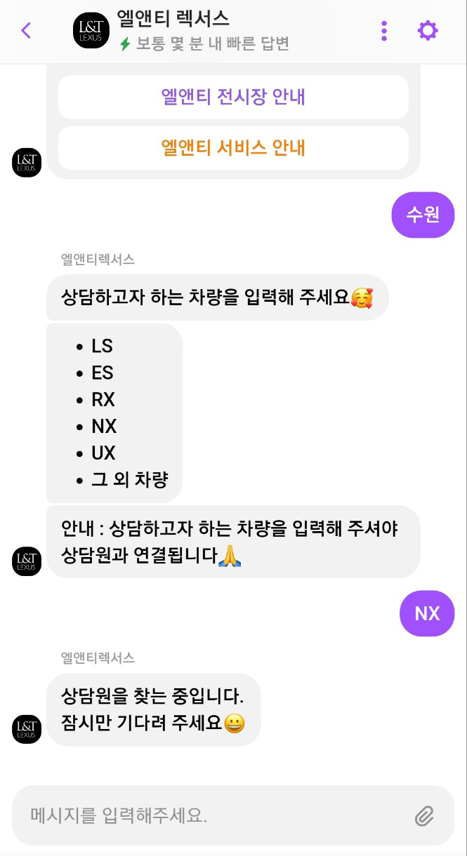 PC와 모바일 환경에서 모두 이용 가능한 신차 견적 채팅 상담 서비스 채널톡은 엘앤티렉서스 홈페이지에 접속해, 화면 우측 하단의 상담을 누르고 새 문의하기를 시작, 상담 진행을 원하는 지점과 상담을 원하는 차량을 선택하면 해당 지점 담담자와 연결되어 곧바로 상담을 진행할 수 있다.