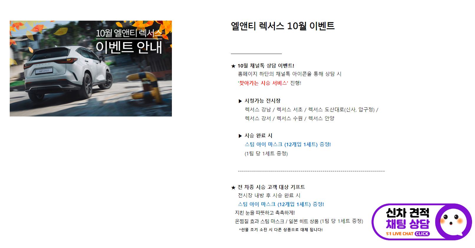 추가로 렉서스 공식 딜러 엘앤티 렉서스에서는 10월 채널톡 상담 이벤트를 진행 중으로, '찾아가는 시승 서비스'를 신청 후 시승을 완료한 고객을 대상으로 멕리듬 스팀 아이 마스크 1세트를 증정하고 있고, 전시장 내방 고객을 대상으로도 시승 완료 시 동일하게 스팀 아이 마스크를 증정하고 있으니 참고 바란다.