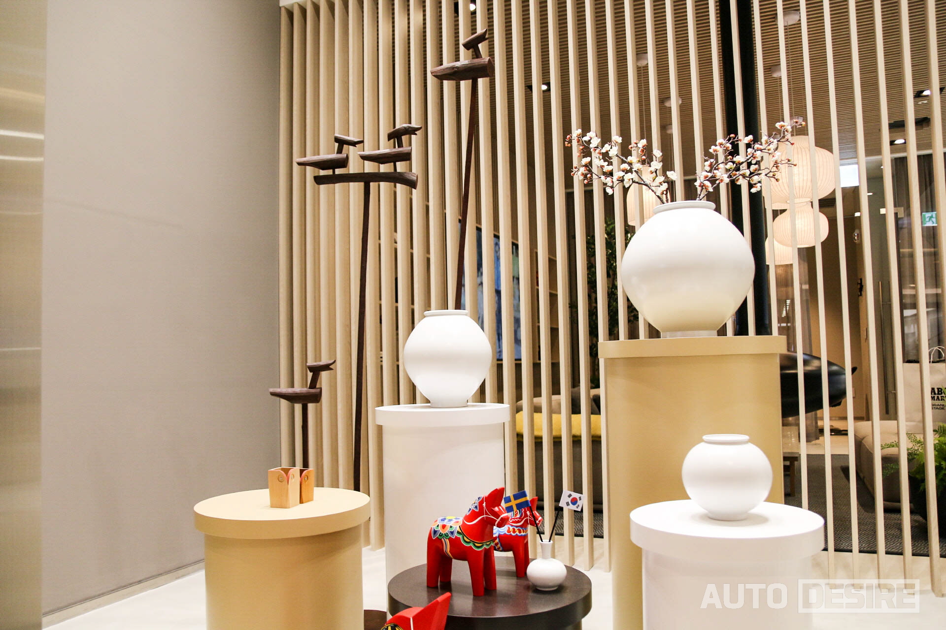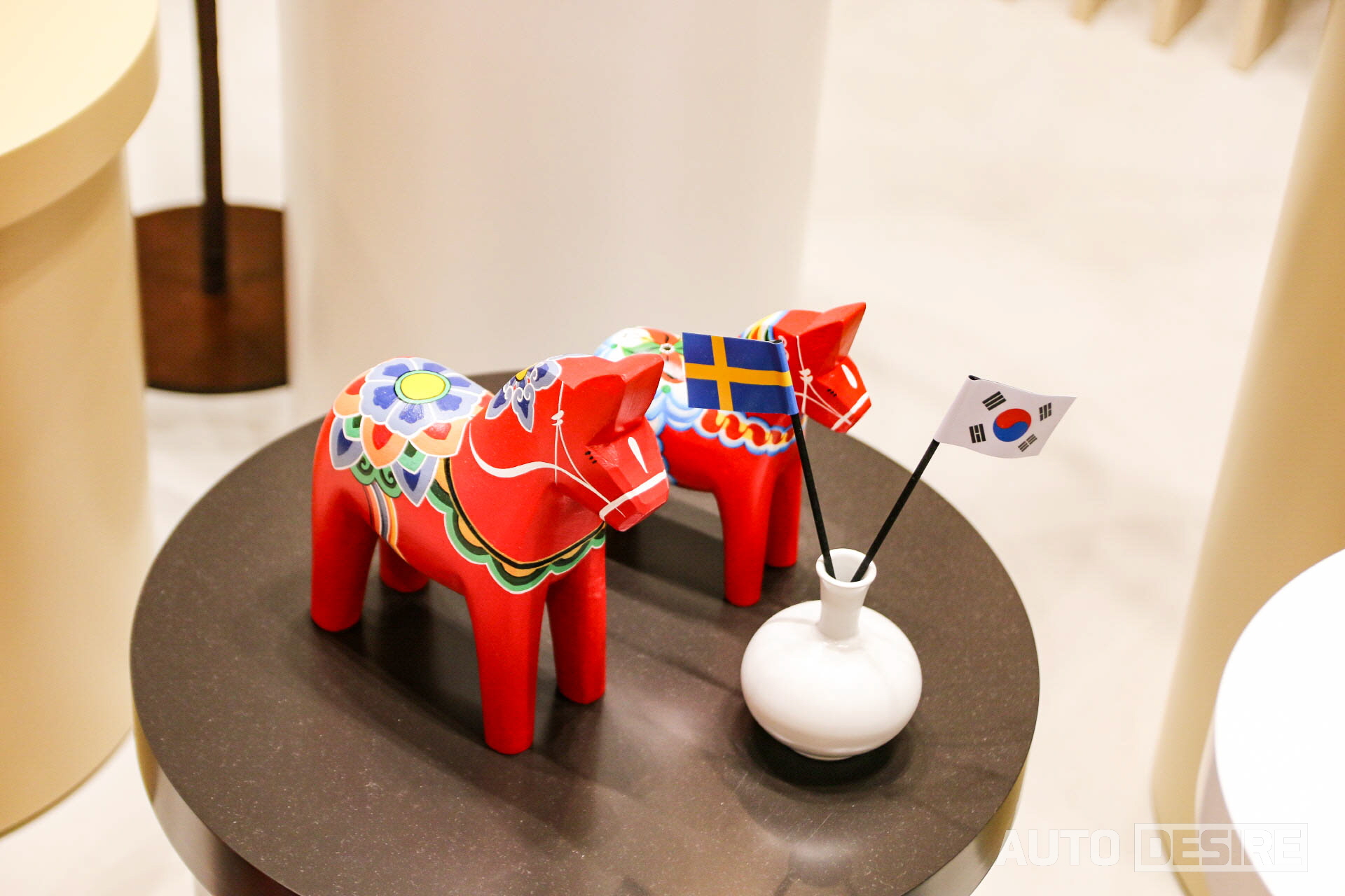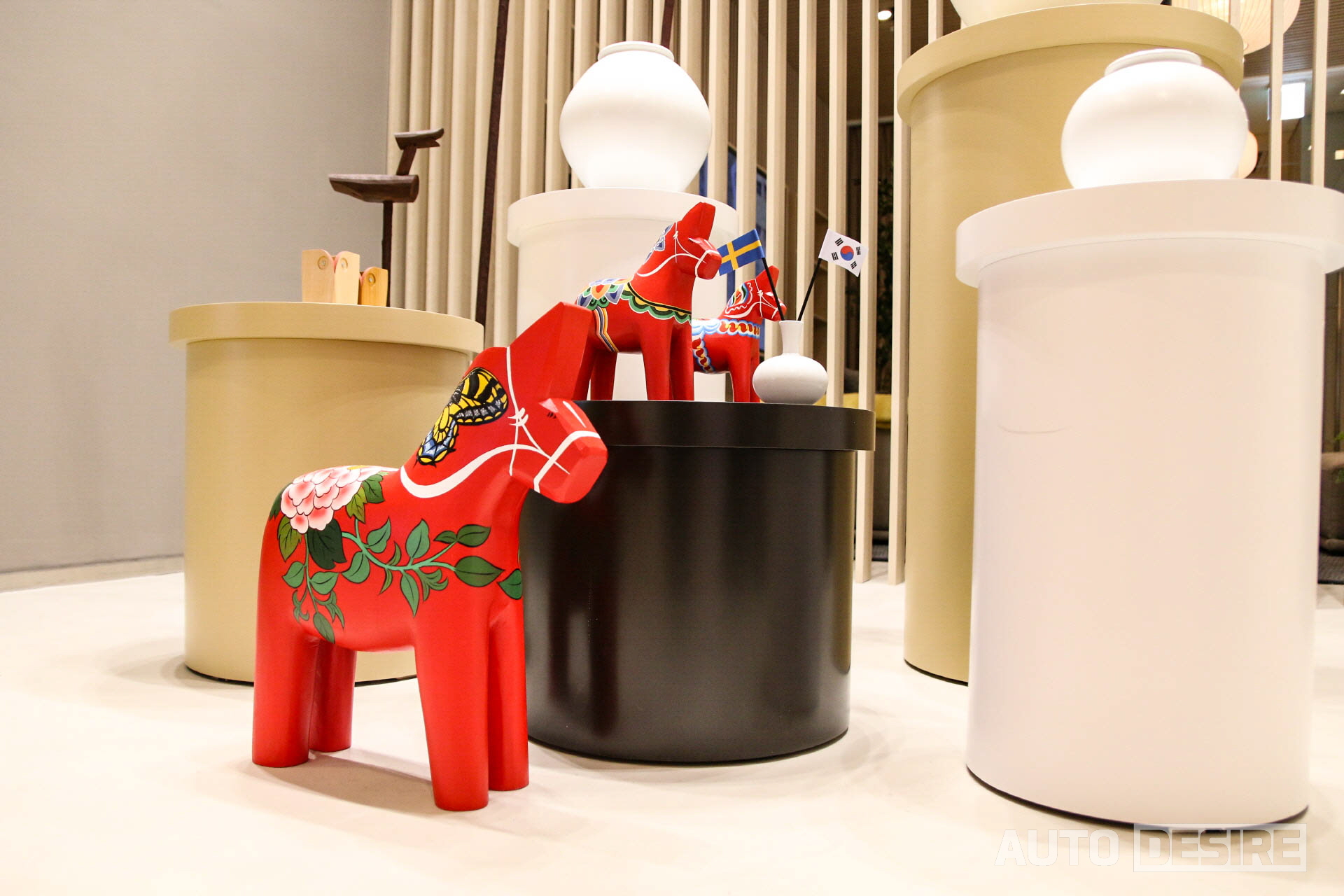 입구에서는 스웨덴 브랜드로서의 정체성을 나타내는 상징물인 ‘달라 호스’와 한국 전통 소품인 백자 도자기와 솟대가 함께 전시되어 볼보자동차와 국내 고객들의 조화를 나타내는 듯하다. 동서양의 소품이 한자리에 모여 있음에도 잘 어우러지는 모습이 인상적이다.