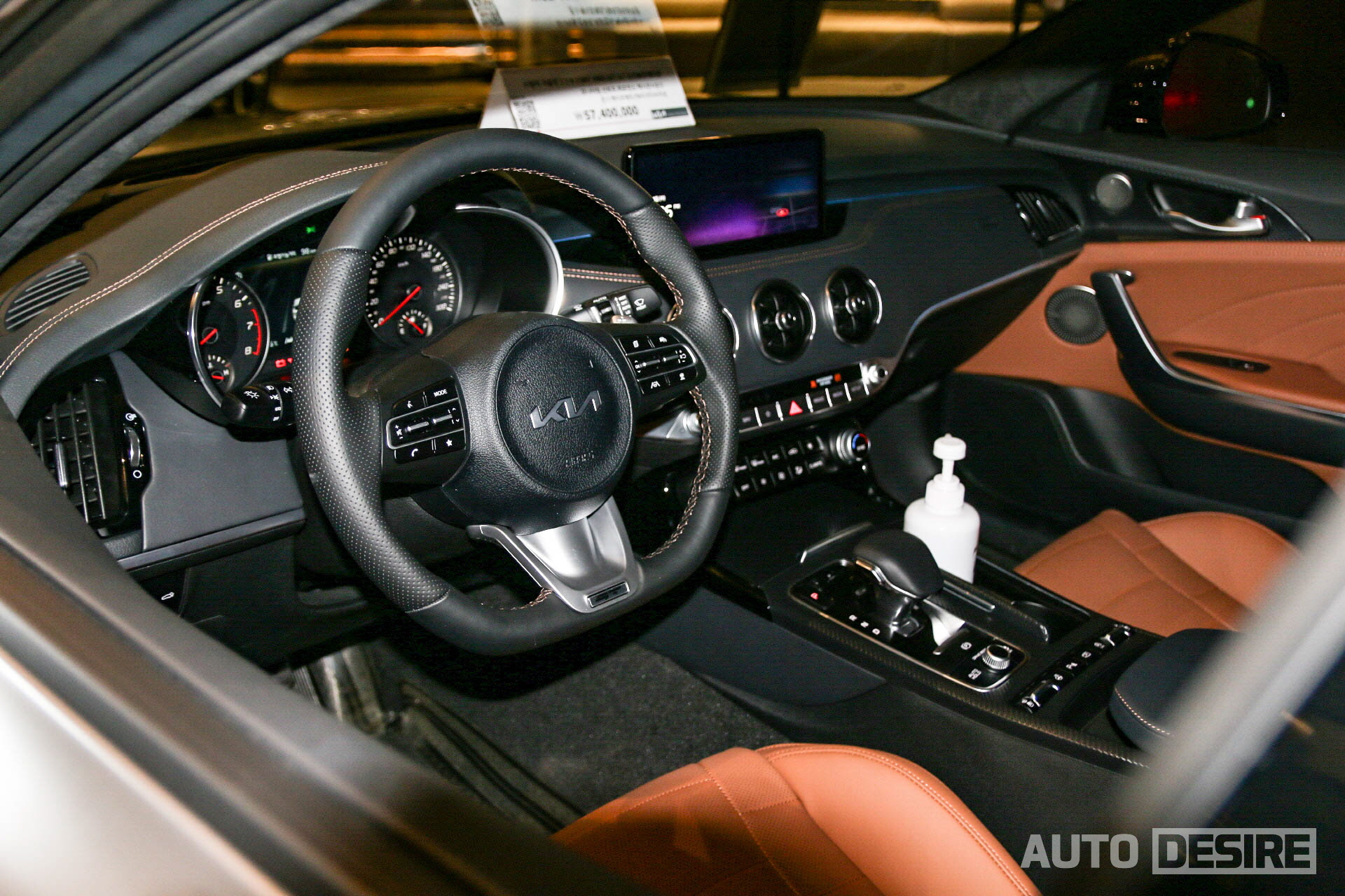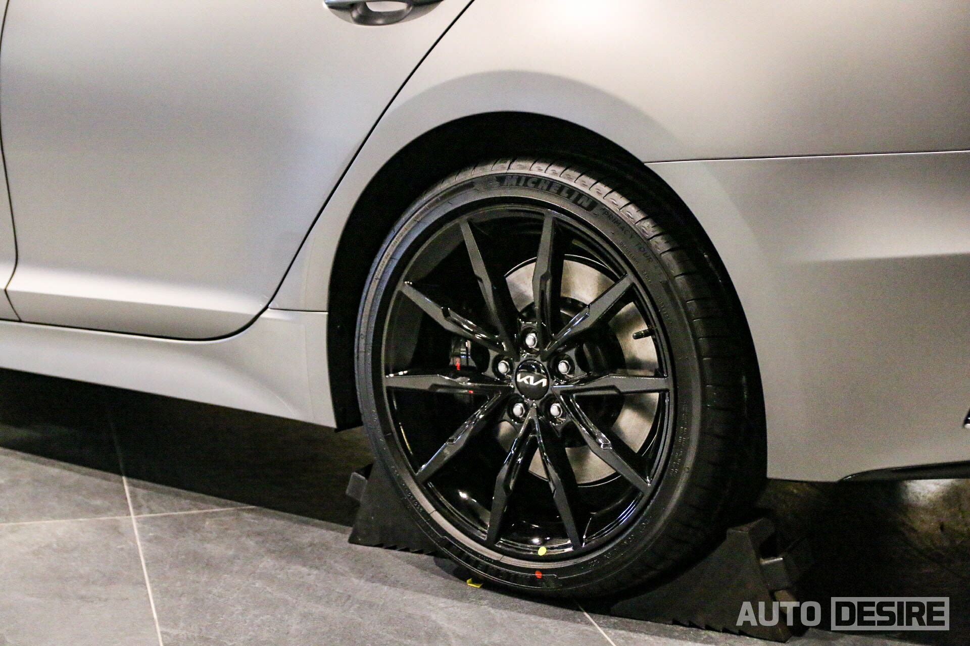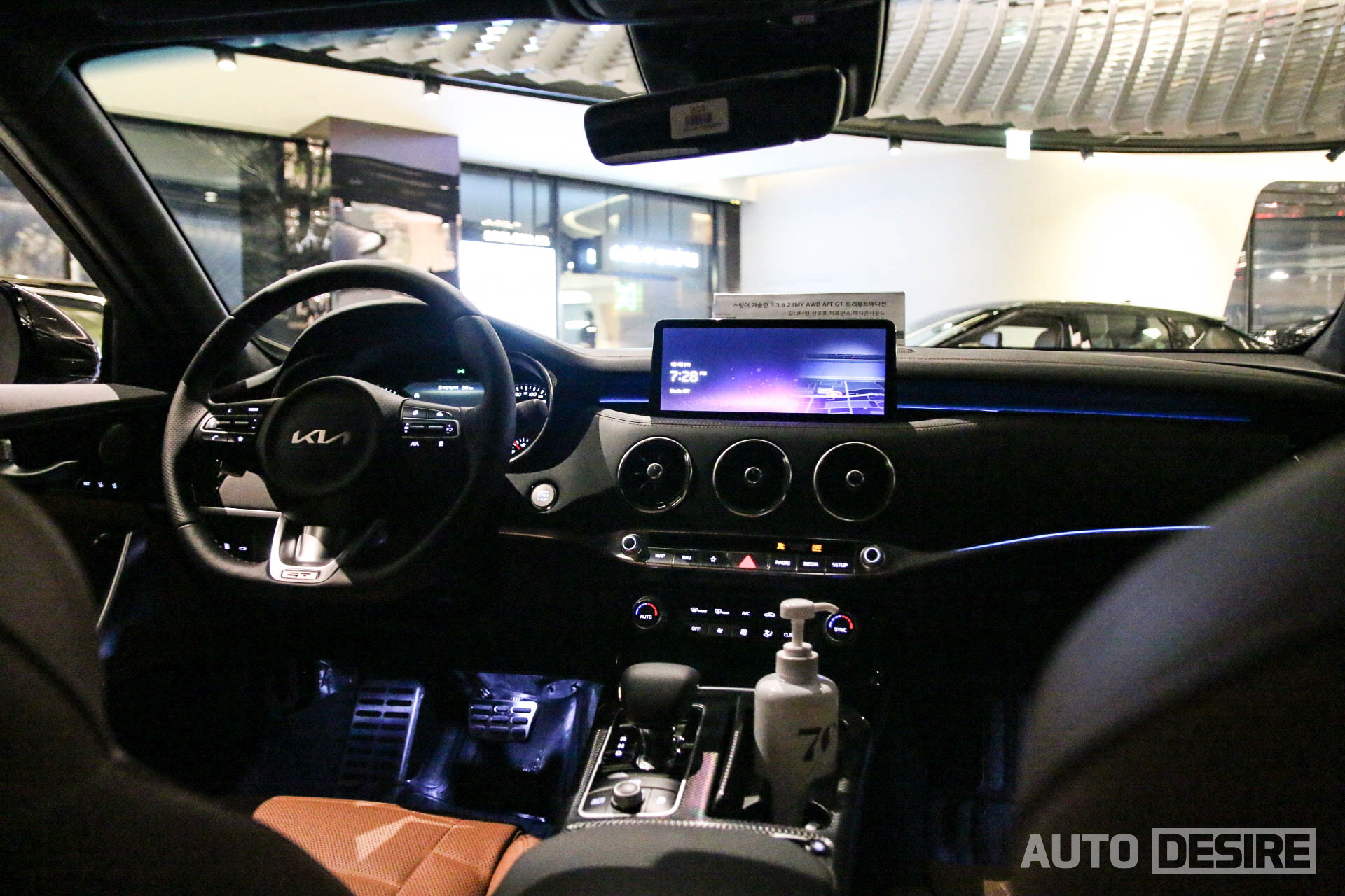 가장 먼저 눈에 들어오는 것은 역시 스팅어의 날렵한 패스트백 스타일과 잘 어울리는 외장 색상. 스팅어 트리뷰트 에디션은 전용 외장 색상으로 애스코트 그린과 신규로 추가된 무광 색상인 문스케이프 매트 그레이(EV6를 통해 먼저 출시된 바 있다.)를 선택할 수 있는데, 역시 전시차에는 문스케이프 매트 그레이가 적용되어 있었다.
