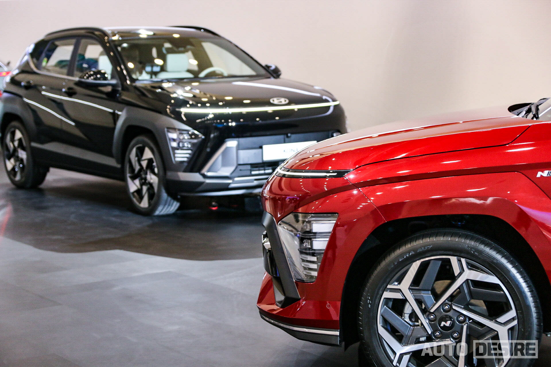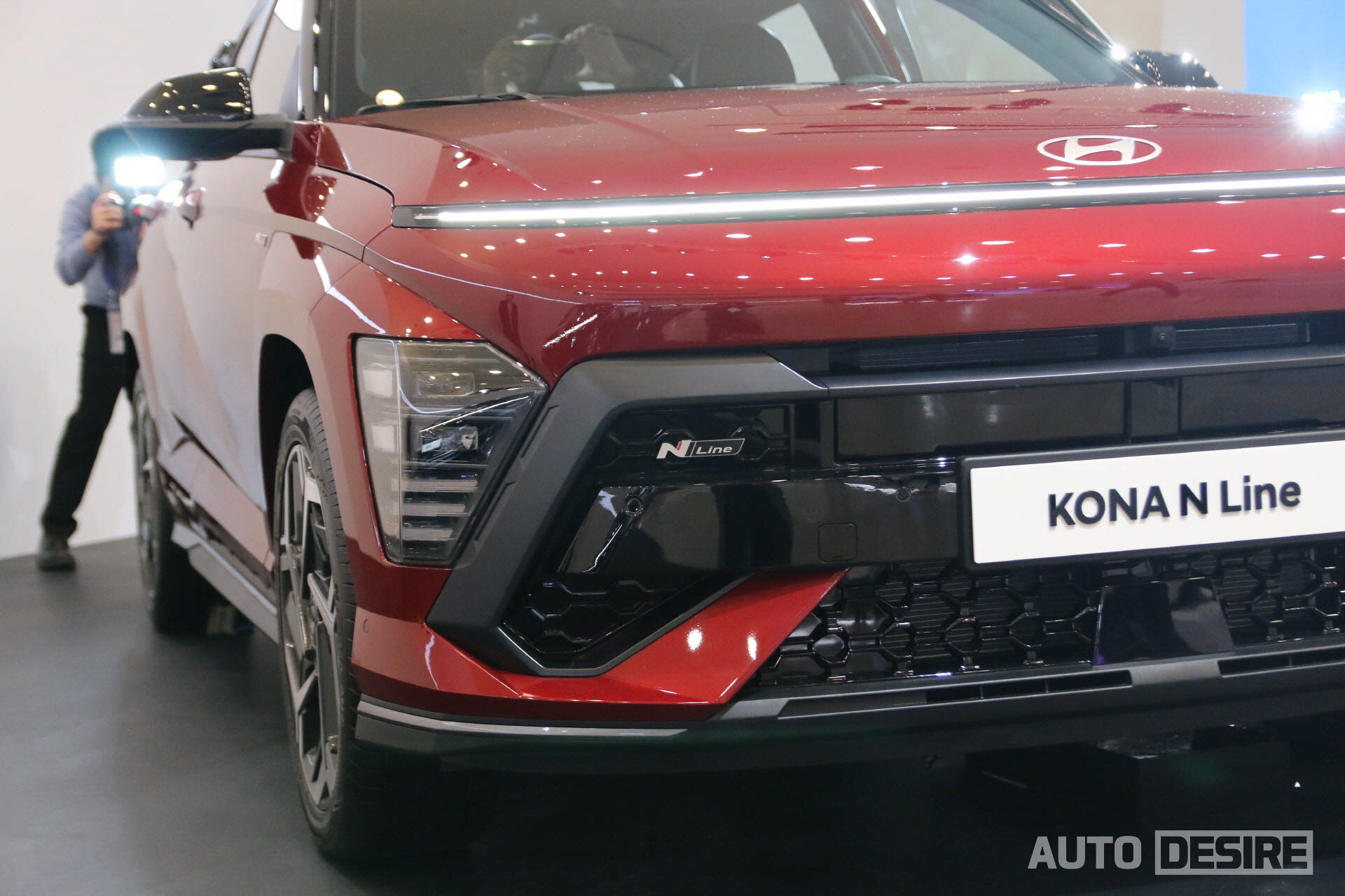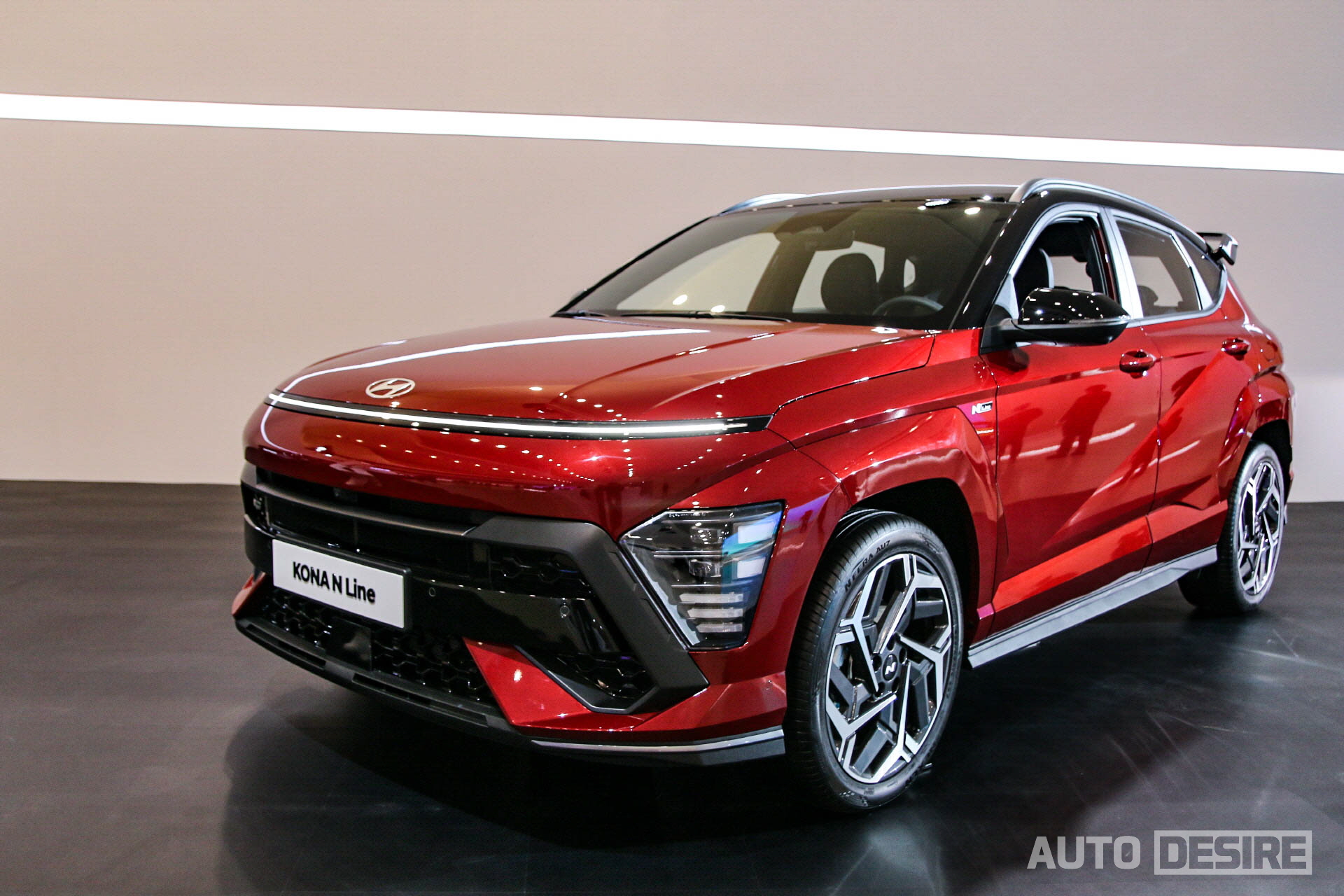 같이 공개된 디 올 뉴 코나 N 라인은 일반 모델보다 더 와이드 한 윙 타입 프런트 그릴과 이를 파고드는 범퍼 디자인, 메시 타입 패턴 그릴로 전면부의 인상을 더 공격적이고 스포티한 감성을 담은 모습으로 만들었고, 그릴 좌측과 프런트 펜더에 N 라인 배지도 더해진다. N 라인 전용 디자인 19인치 휠에는 현대 엠블럼 대신 N 엠블럼이 장착되는데, 휠의 형상은 신형 투싼의 19인치 휠과도 다소 흡사한 느낌이다. 휠 하우스와 도어 클래딩은 바디 컬러가 적용된다.