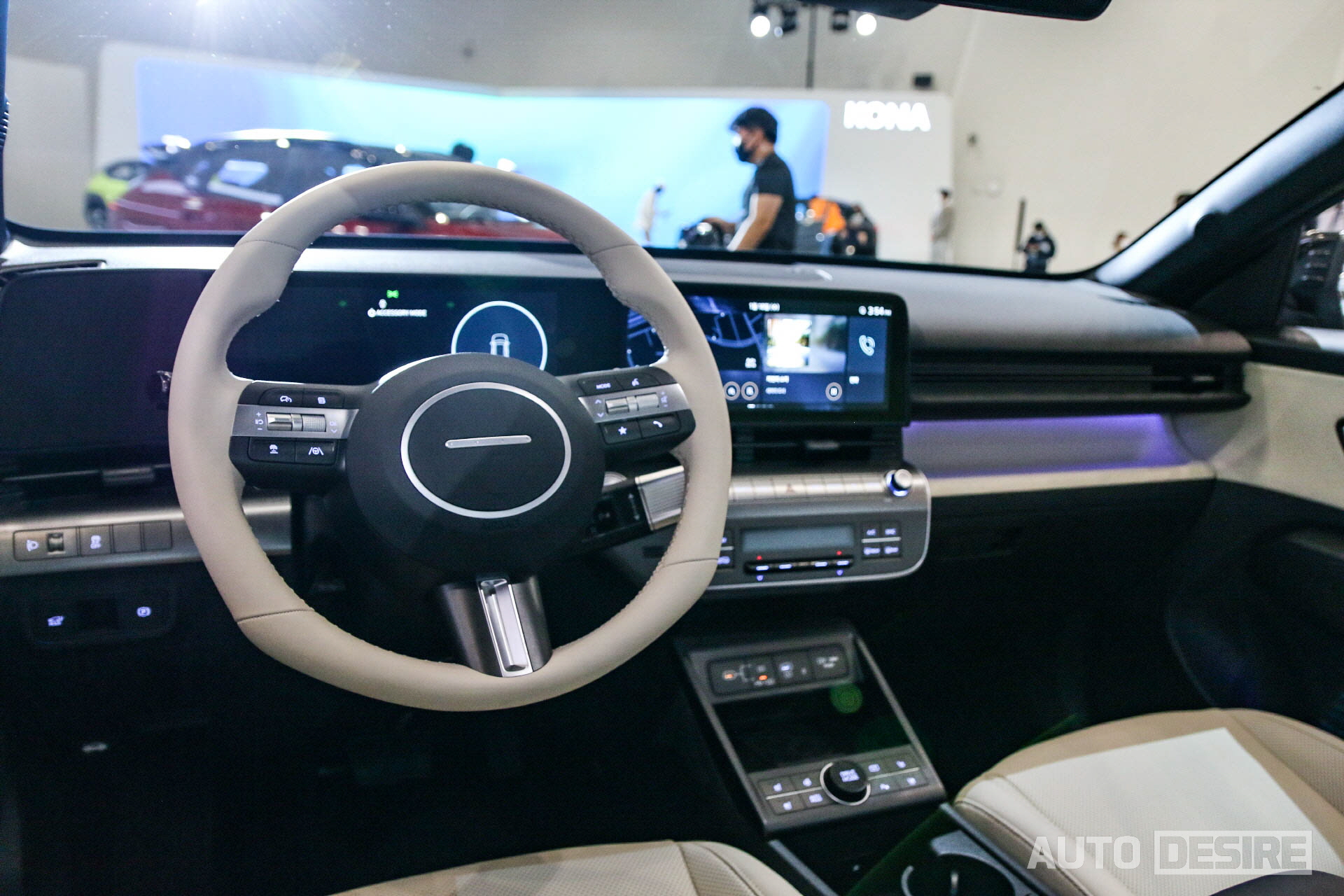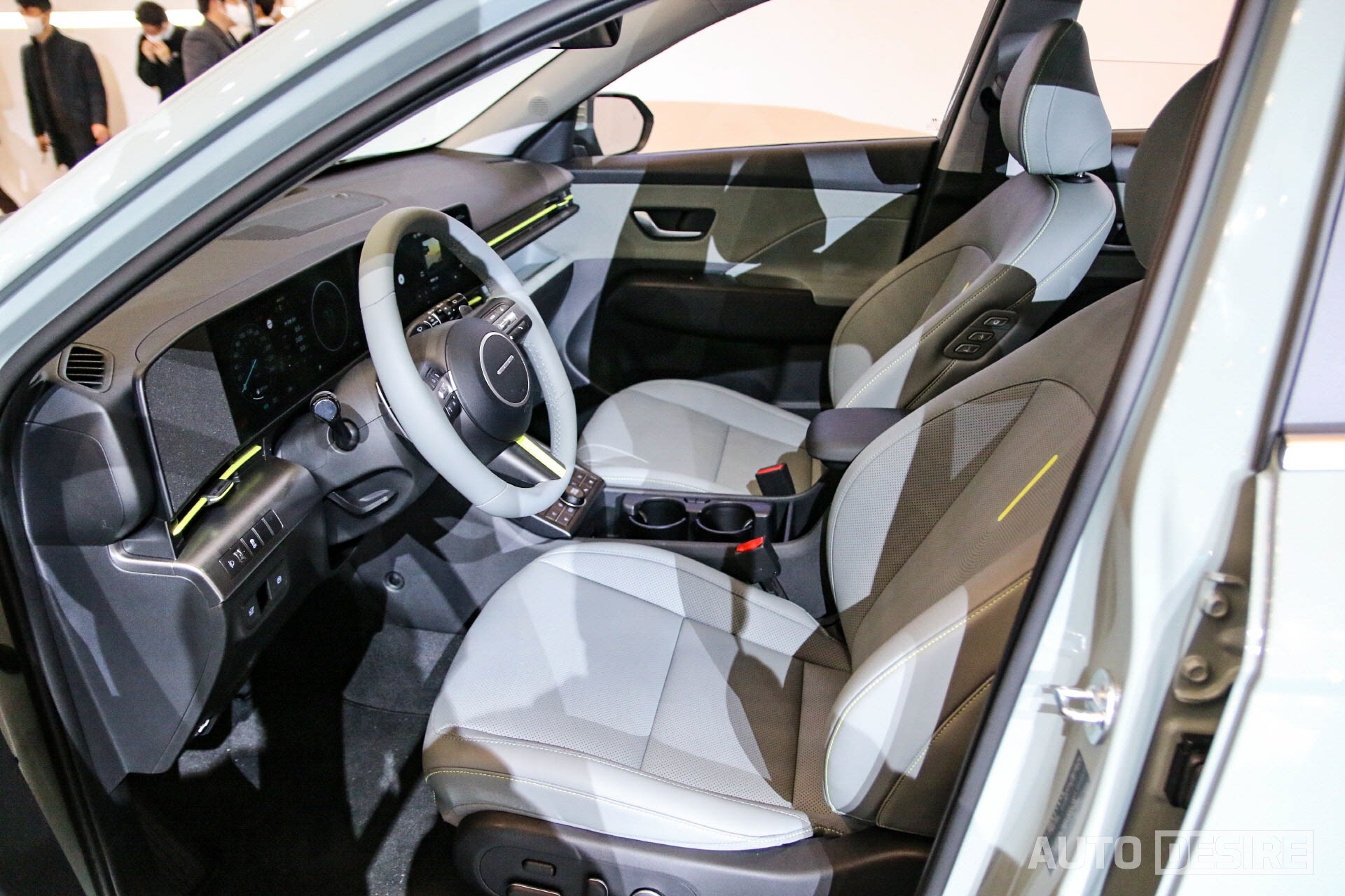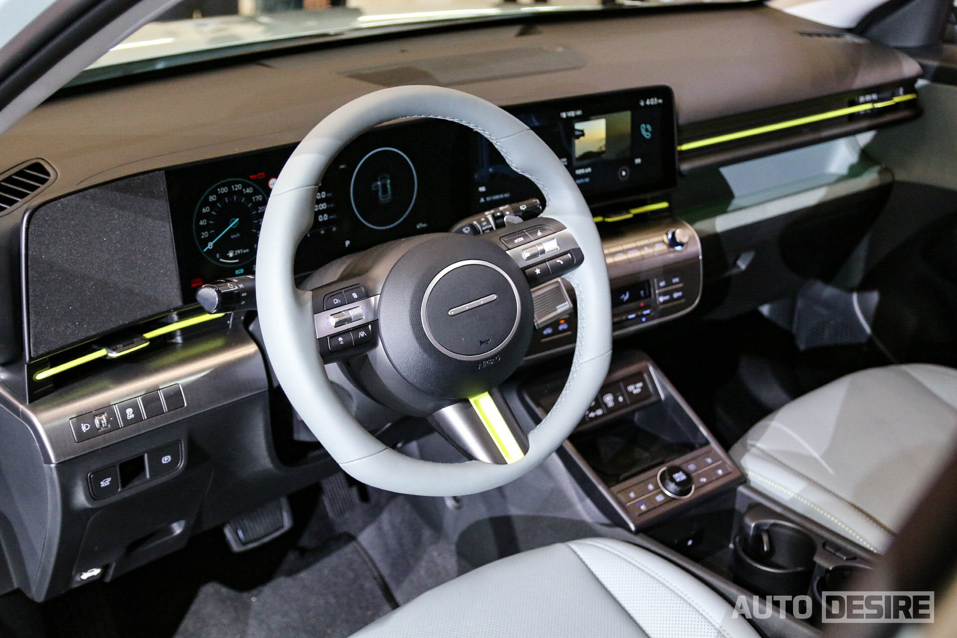 실내에서는 수평형 레이아웃과 함께 12.3인치 계기판과 12.3인치 내비게이션 화면이 이어지는 파노라믹 디스플레이, 기어 셀렉터를 칼럼식으로 변경하면서 수납공간이 넓게 확보된 센터 콘솔과 조수석 글로브 박스 상단에 추가된 공간으로 넓고 시원시원한 구성을 보여준다. 스티어링 휠은 얇은 스포크와 현대 H 엠블럼 대신 점 네 개가 박힌 타원형 혼커버가 적용되는데 좌우 스포크가 혼 커버와 정확한 수평이 아닌 점과 세이지 그린 컬러 패키지에 적용된 라임색 포인트 컬러가 좀 어색해 보이는 점이 살짝 아쉬운 부분이다. 인테리어 컬러는 위의 세이지 그린 컬러 패키지, 베이지 컬러 패키지 외에도 블랙 원톤, 그레이 투톤도 선택이 가능하다.