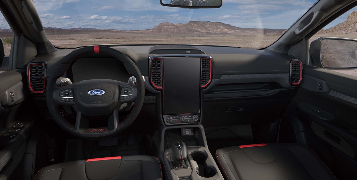 2023 포드 레인저 랩터의 실내는 블랙 컬러를 베이스로, 송풍구 가니시와 스티어링 휠, 시트 등에 오렌지 컬러 포인트가 더해지며 이 외 큰 편의 사양 구성은 와일드트랙의 것을 베이스로 하되 뱅앤올룹슨 사운드 시스템을 비롯해 랩터 차량에 맞는 오프로드 전용 콘텐츠와 험로 주행 시 안정적으로 운전자와 탑승객을 지탱하도록 스포츠 시트도 적용된다.