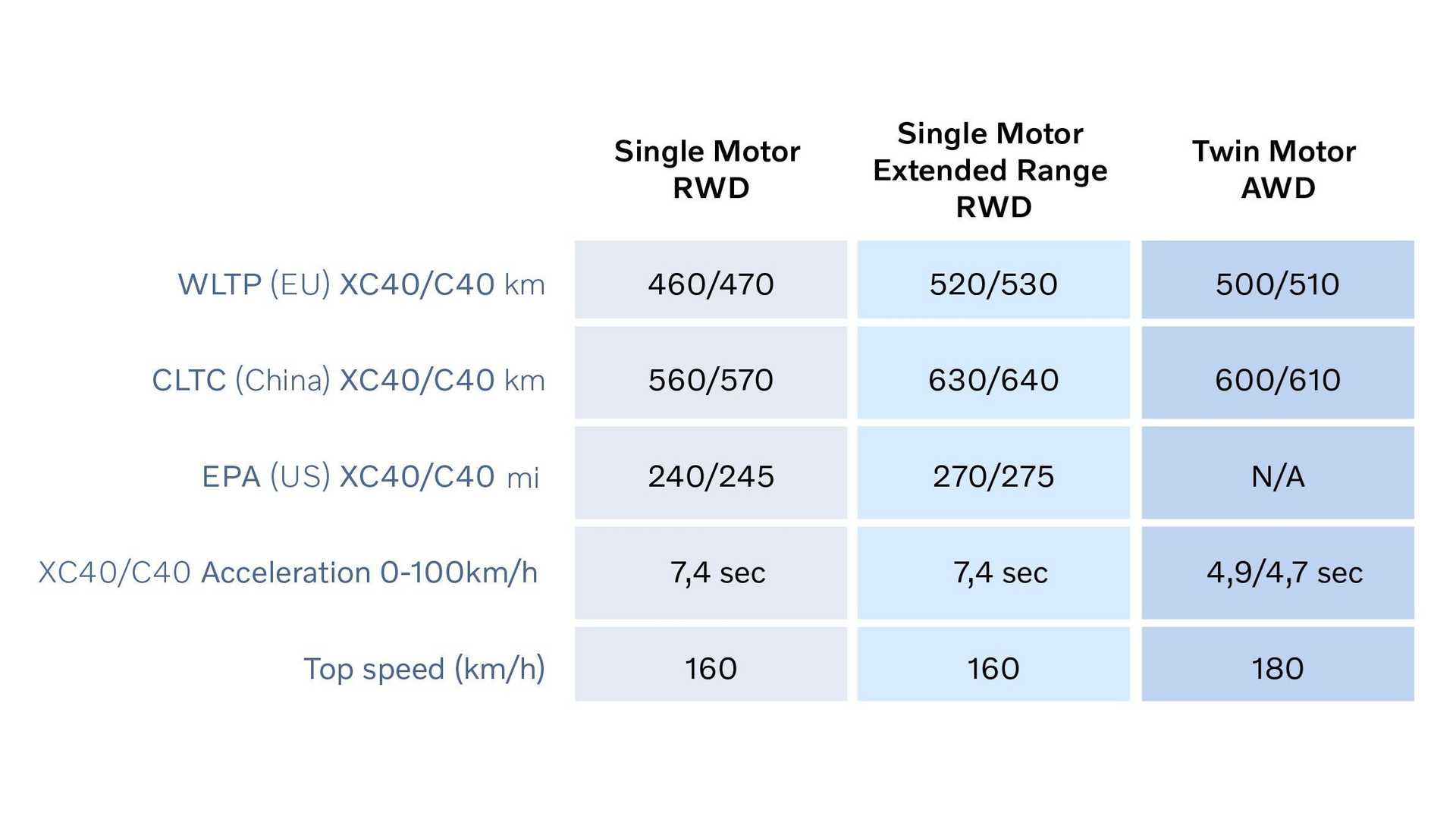 국내에도 현재 판매되고 있는 듀얼 모터 모델의 경우 배터리 용량이 78kWh에서 82kWh로 증대되었으며, XC40 리차지와 C40 리차지 모두 주행 가능 거리가 약 10% 향상되어 1회 완충 시 최대 주행 가능 거리는 WLTP(유럽) 기준 XC40 리차지 500km, C40 리차지가 510km이고, 두 차량 모두 최고 속도는 180km/h에서 제한, 정지 상태에서 100km/h까지 가속하는 데에는 XC40 리차지는 4.9초, C40 리차지는 4.7초가 소요된다.