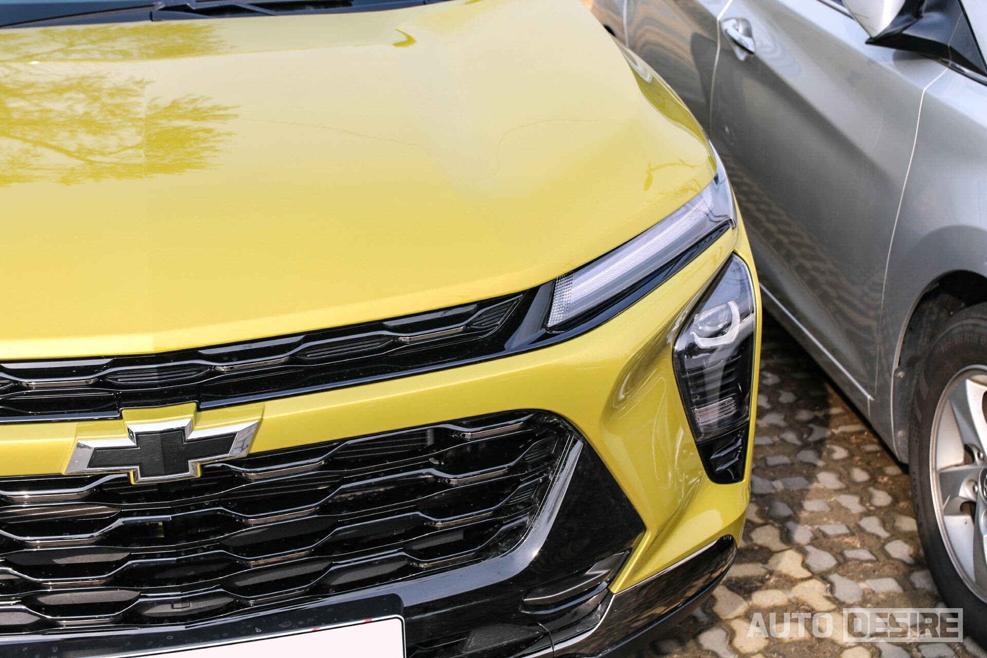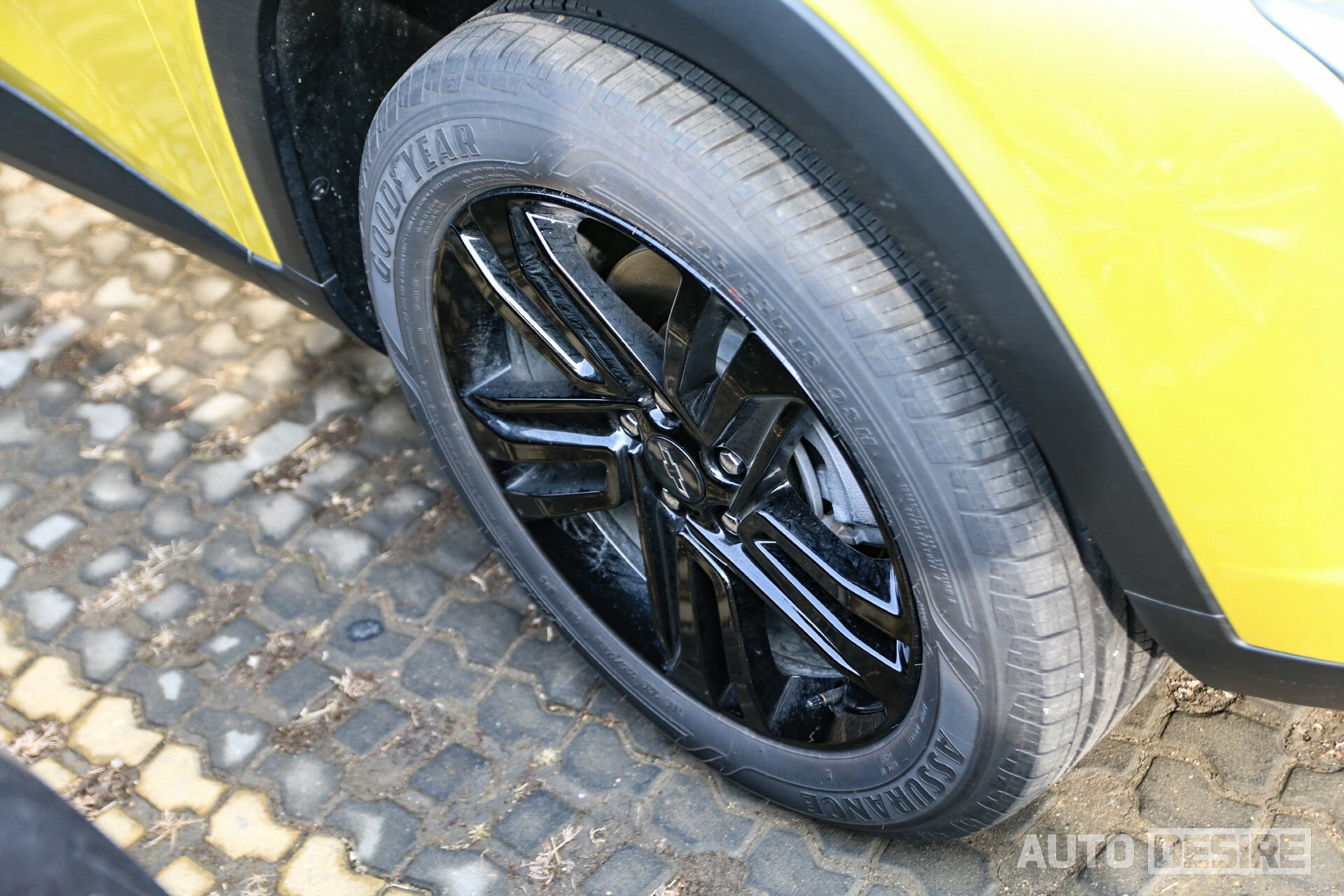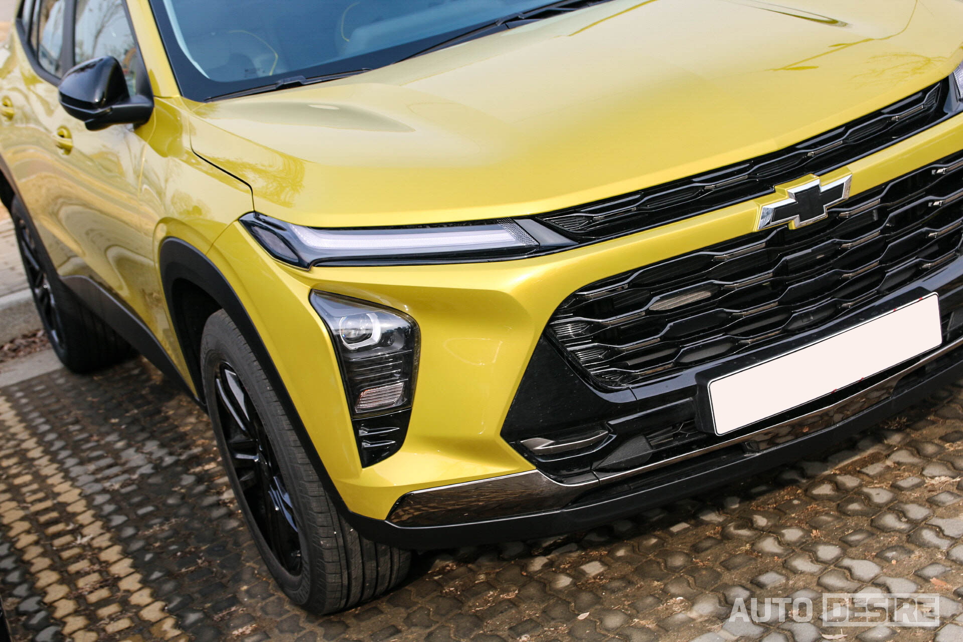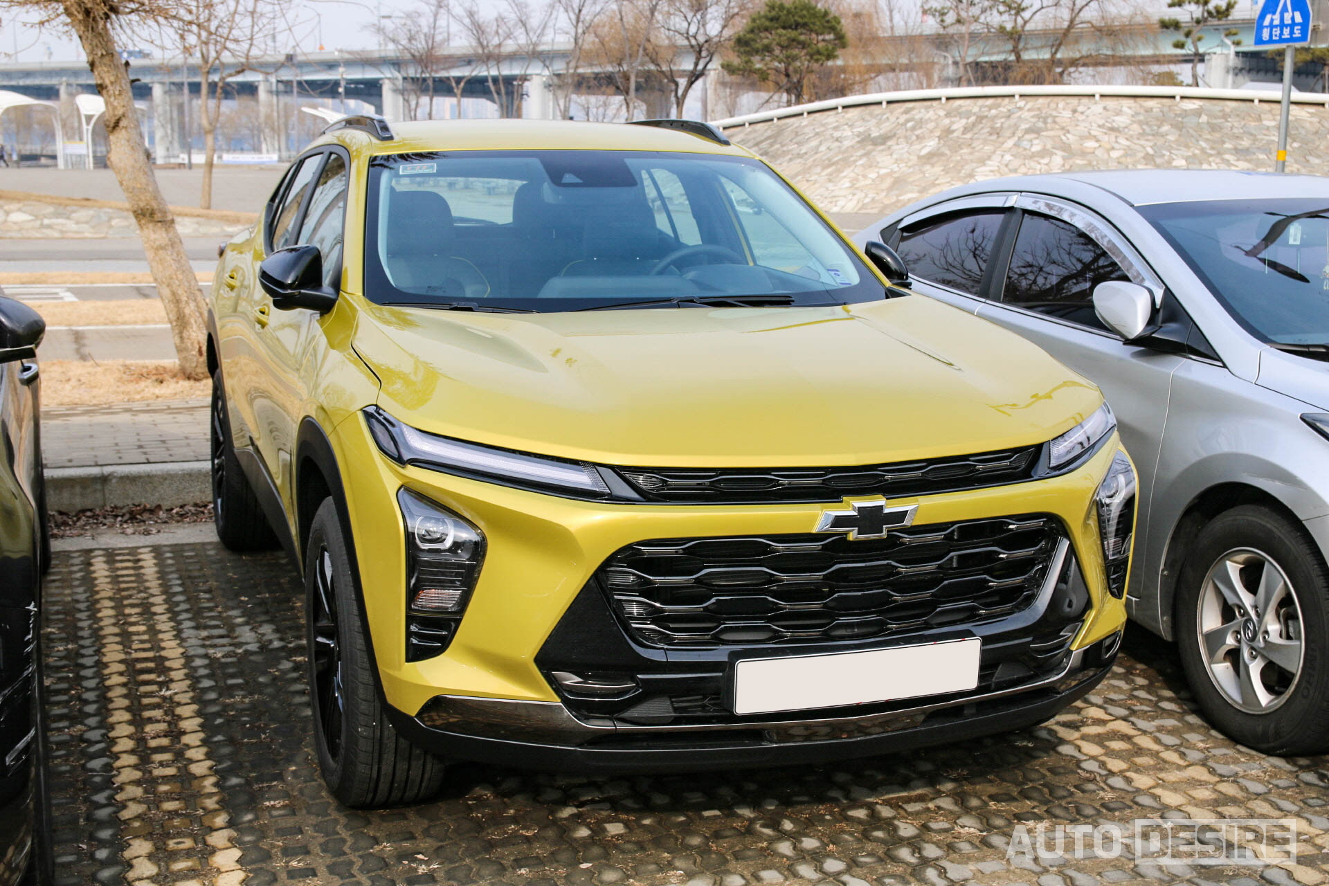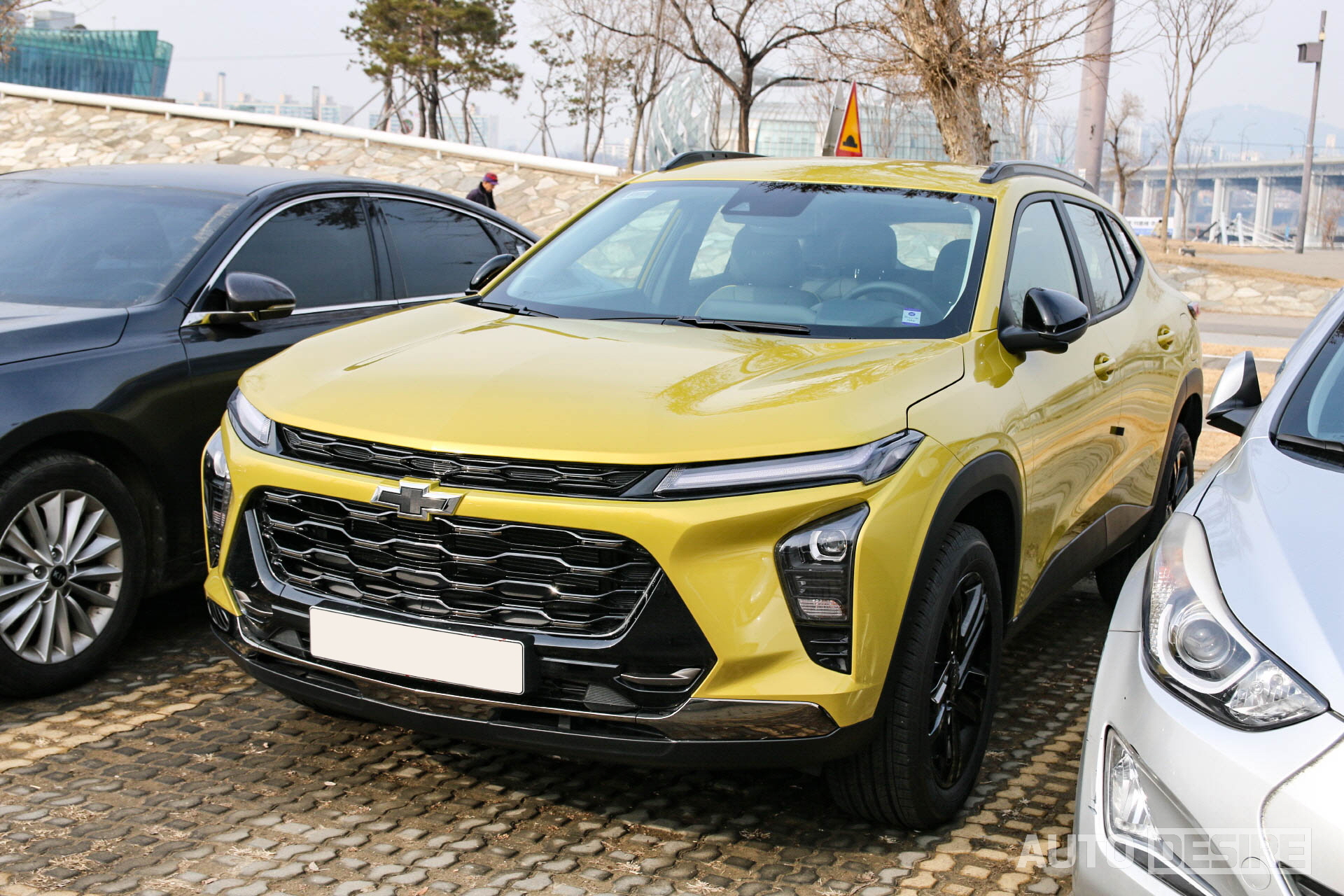 실제로 출시될 양산형 사양과는 아직 차이가 있기는 하겠지만, 실물로 만난 차량은 '액티브' 트림으로 전면에 블랙 보타이와 블랙 메시 그릴, 블랙 알로이 휠, 블랙 사이드 미러 커버를 적용되어 있어 노란 바디 색상과 강하게 대비를 이뤄 트림명처럼 말 그대로 액티브한 느낌을 전해준다. 쉐보레의 패밀리룩을 적극 반영한 전면부 디자인은 트레일블레이저-볼트 EV 등과 흡사한 인상을 전하는데 차체 자체가 넓고 낮아진 것도 있지만, 와이드한 프런트 그릴과 함께 슬림한 헤드램프가 주는 비율도 스포티한 느낌을 더 살려주는 것 같다. 휠 타이어 사이즈는 225/55R/18에 굿이어 타이어가 적용되어 있다.