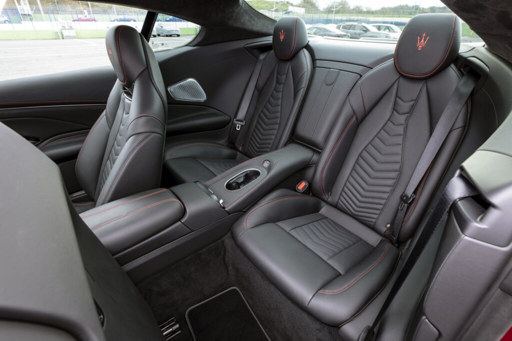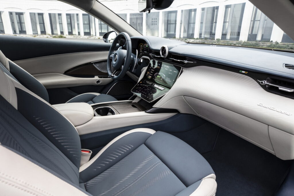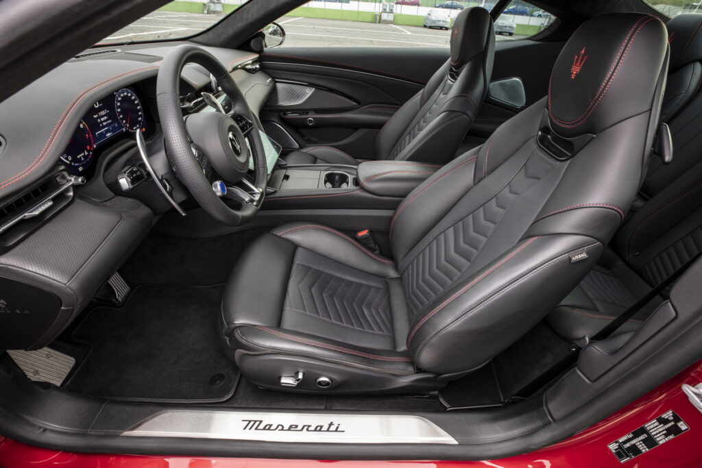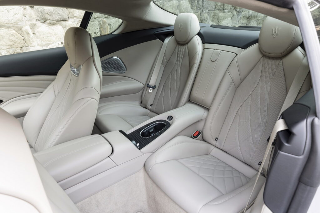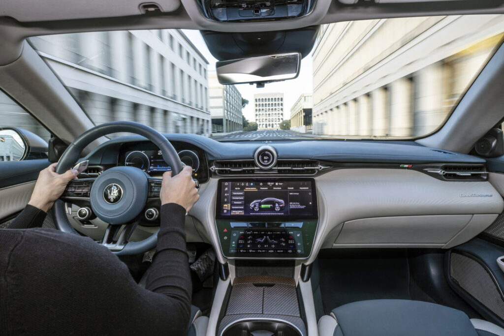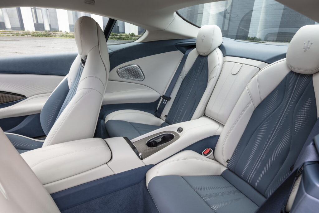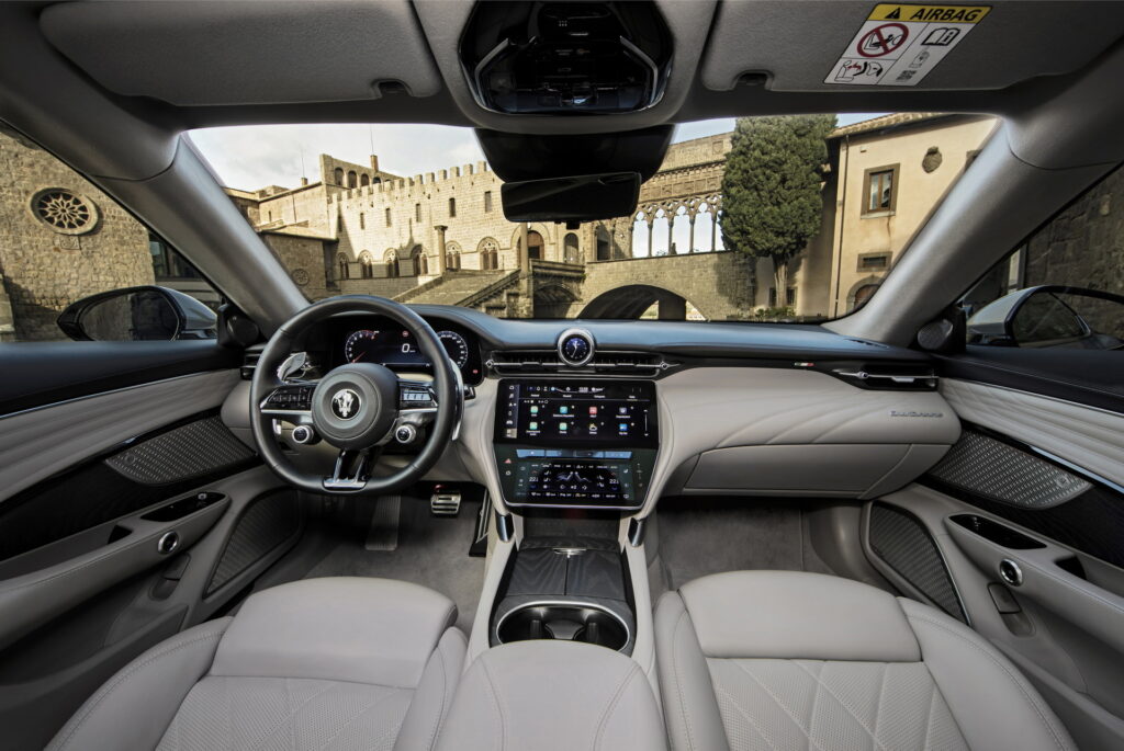 센터패시아 상단 송풍구 중앙에 위치한 시계와 스티어링 휠 칼럼의 기다란 시프트 패들로 마세라티의 특징을 살리고 있으며, 시동 버튼과 주행모드 버튼이 달린 3-스포크 타입 스티어링 휠과 센터 디스플레이 상단에 위치한 수평형 송풍구 디자인과 센터콘솔을 비롯한 전체적인 구성은 SUV인 그레칼레와도 유사한 모습으로 앞으로 출시될 마세라티 신 모델들의 구성도 이와 유사할 것으로 예상된다.