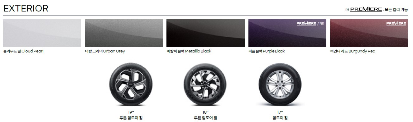 18인치와 19인치 휠 역시 신규 디자인을 적용해 더 세련된 인상을 만들어주며, 외장 컬러는 클라우드 펄, 어반 그레이, 메탈릭 블랙과 프리미에르 전용 컬러인 퍼플 블랙, 버건디 레드로 운영된다.