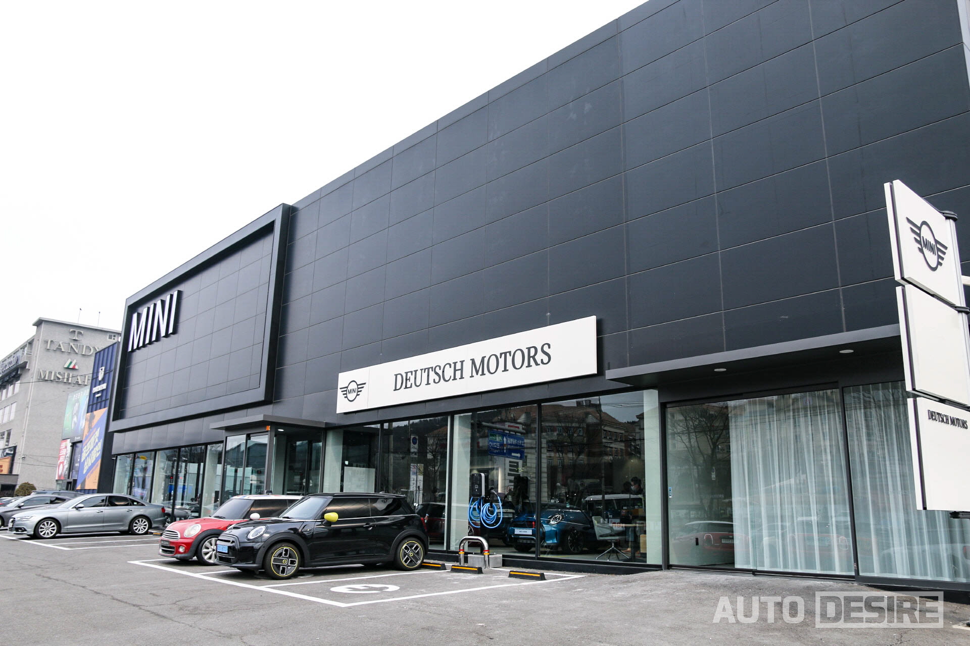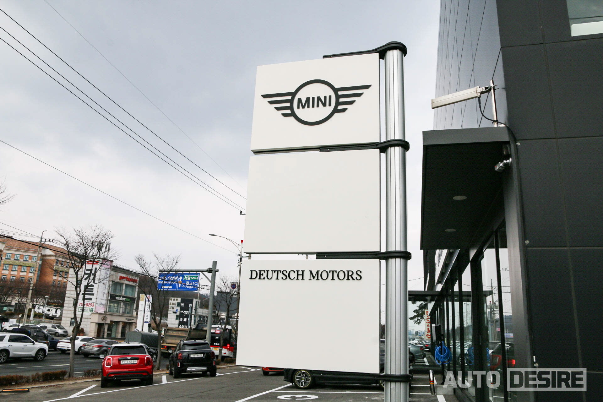 MINI 브랜드의 최근 방향성에 맞춘 것인지, 혹은 미니멀리즘을 지향하는 것인지 전시장 간판의 폰트가 바뀐 것과 함께, 배색도 기존의 검은 배경에 흰색 폰트, 레드 포인트 구성에서 블랙/화이트 투톤으로 깔끔하게 달라진 모습이다. 아직은 오른쪽 구석 부분이 좀 휑한 느낌이긴 한데, 신차 출시에 맞춰서 현수막 배너가 추가될 것 같다.