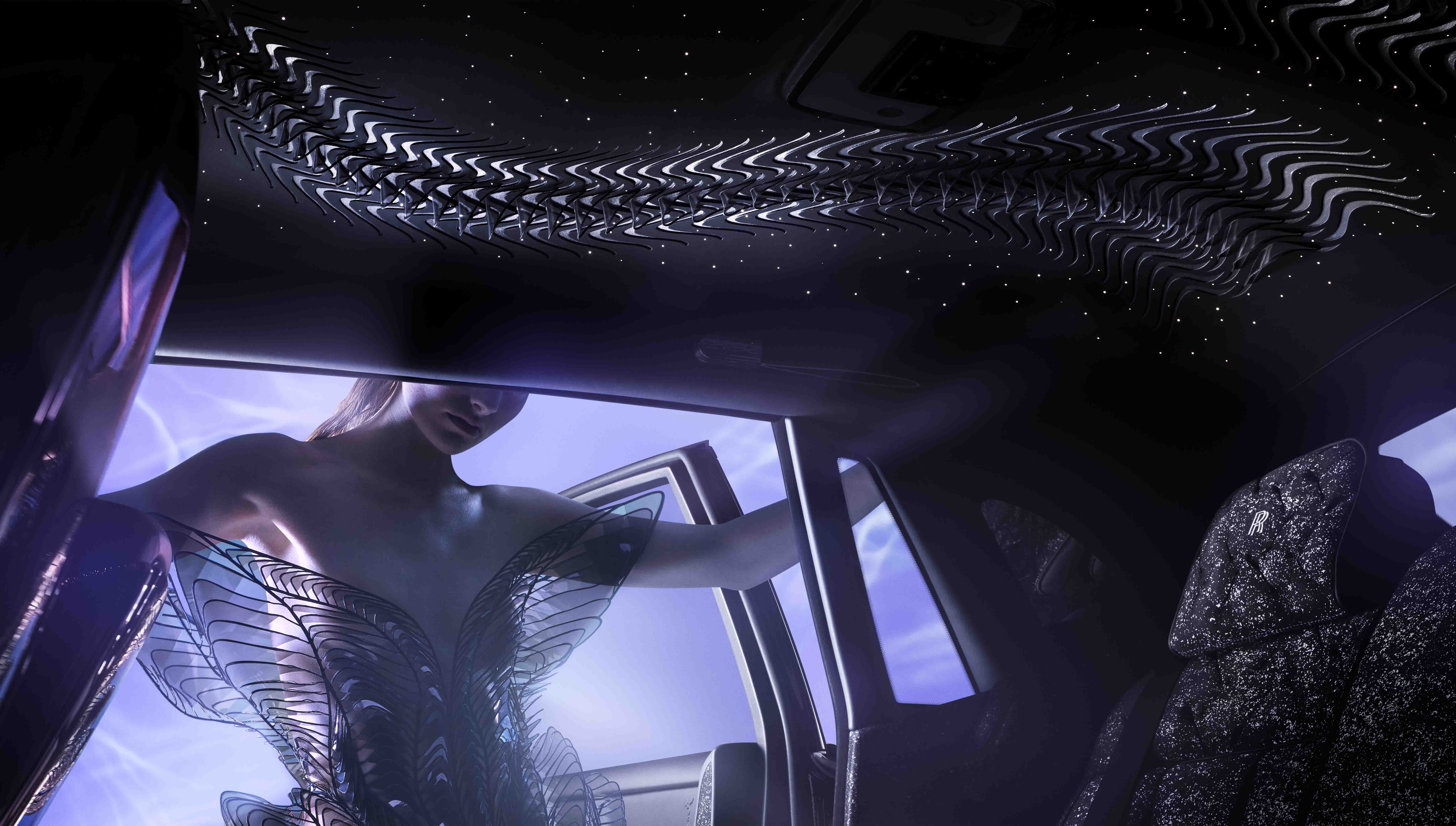 위빙 워터 테마는 1열의 패시아 전체를 가로지르는 갤러리로 이어지며, 오트쿠튀르 기법과 혁신적인 시각적 형식을 결합한 85개의 꽃잎을 수놓았고, 이 작업은 아이리스 반 헤르펜 팀이 직접 롤스로이스가 있는 굿우드에 방문해 60시간에 걸쳐 수작업으로 제작했다.