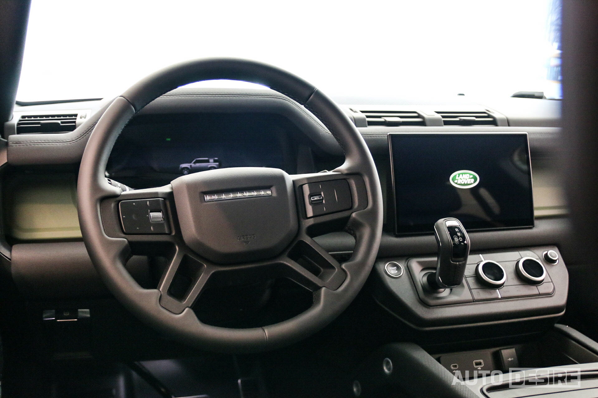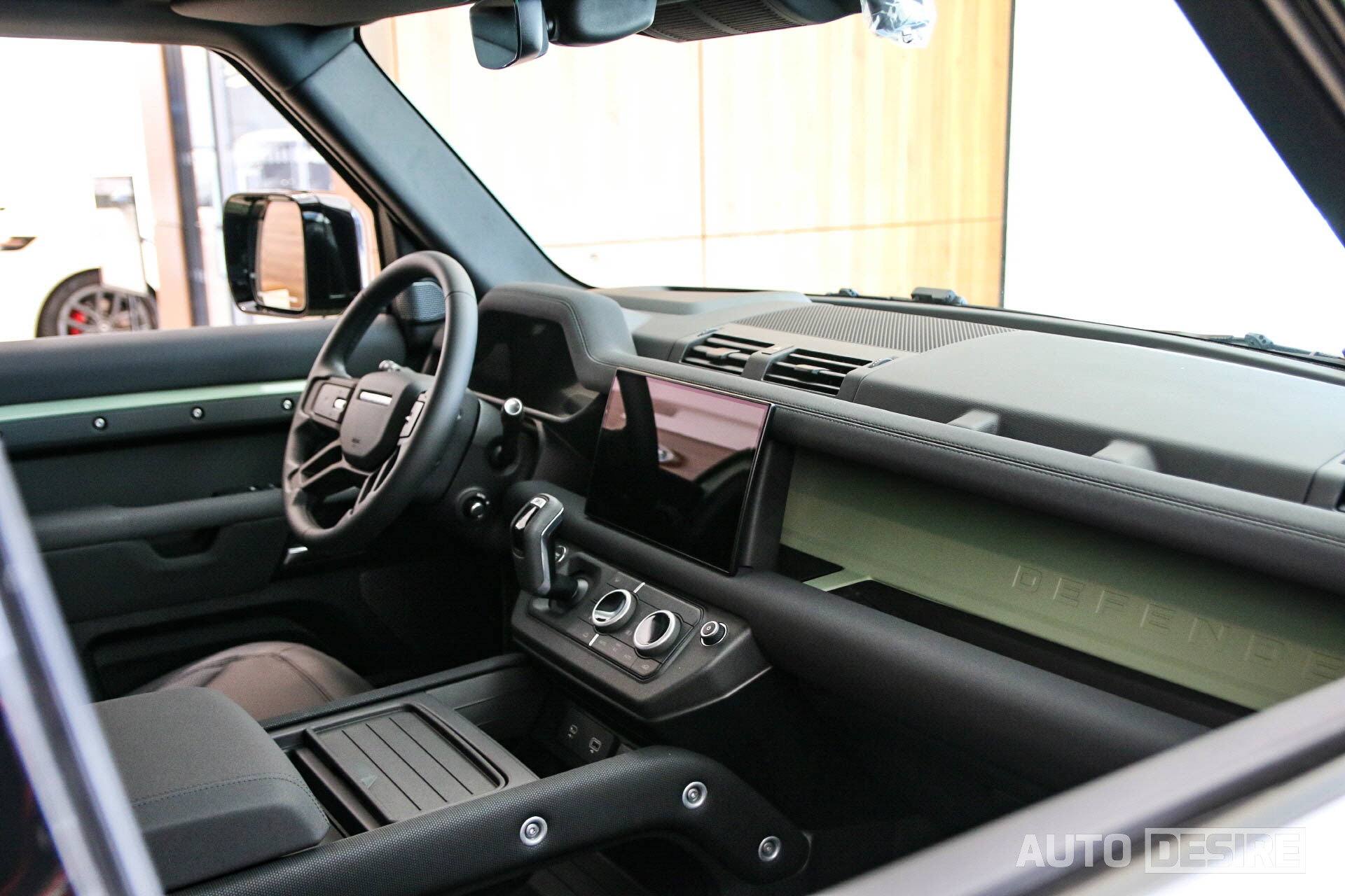 실내에서도 외관과 동일한 '그래스미어 그린' 색상을 대시보드 크로스 카빔에 적용해 통일감을 주고 랜드로버의 정체성을 살린다. 시트를 비롯한 곳곳의 마감 소재로 에보니 리지스트를 적용하고, 그 외 주요 실내 사양은 디지털 클러스터와 함께 11.4인치 디스플레이와 피비 프로 인포테인먼트 시스템에 티맵 내비게이션, 메리디안 사운드 시스템을 탑재했고, 3D 서라운드 카메라와 헤드업 디스플레이, 실내 공기 정화 시스템이 포함된 3존 오토 에어컨, 센터콘솔 냉장 박스, 220V 파워아웃렛 등 편의 사양을 제공한다. 1열 시트에는 열선과 통풍 기능도 기본 적용된다.