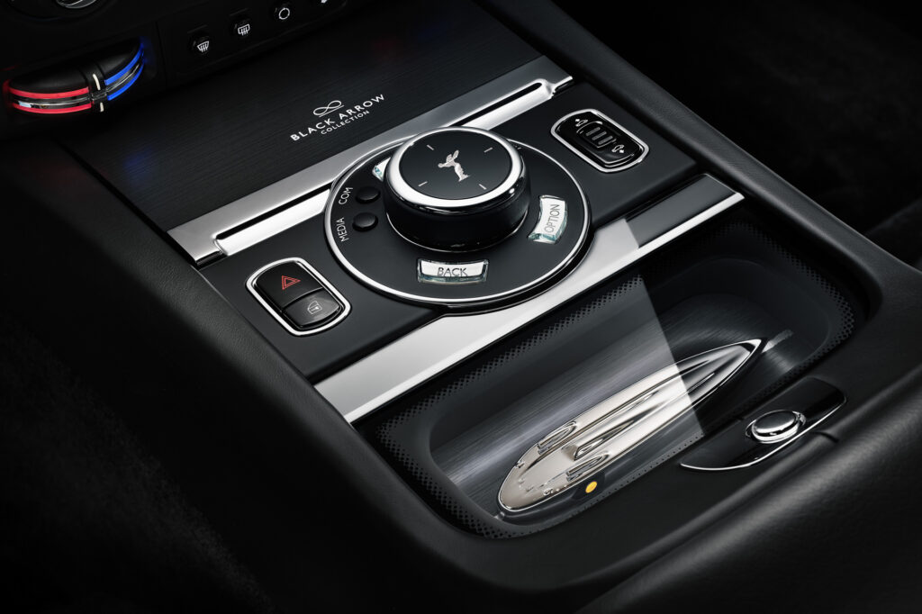 실내 공간에서도 블랙 애로우 컬렉션을 위해 특별히 제작한 새로운 소재들로 장식, 암레스트와 시트 가죽, 센터 터널, 도어 디테일, 대시보드 하단부까지 모두 진한 블랙 컬러와 광택을 더한 클럽 레더로 마감해, 롤스로이스 내추럴 그레인 블랙 가죽과 대비를 이루며, 시트에는 브라이트 옐로우 컬러를 사용해 대담하면서도 블랙과 강한 대비를 이루는 매력을 강조했으며, 헤드레스트 측면에도 썬더볼트를 연상하게 하는 화살 자수를 새겨놓았다.